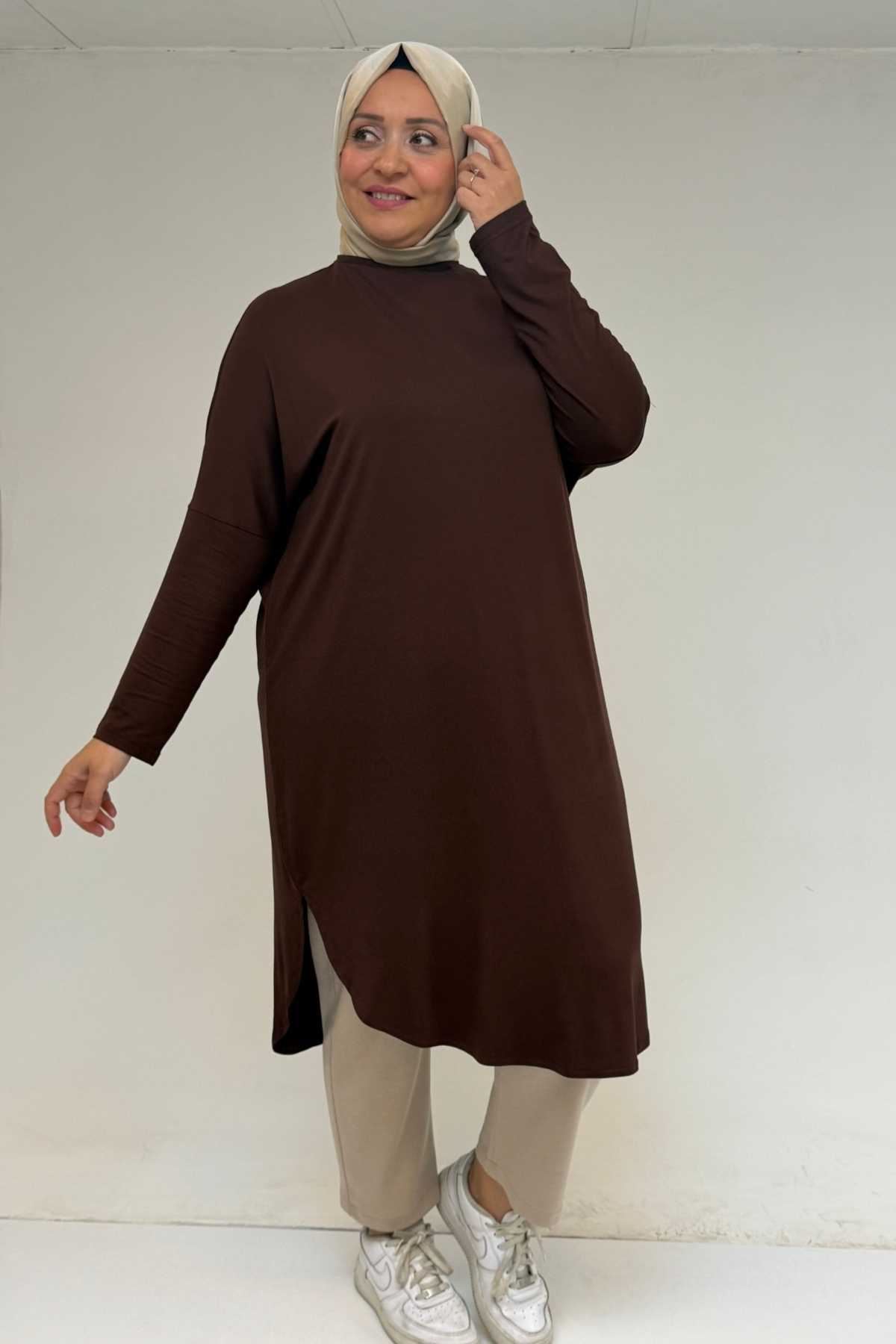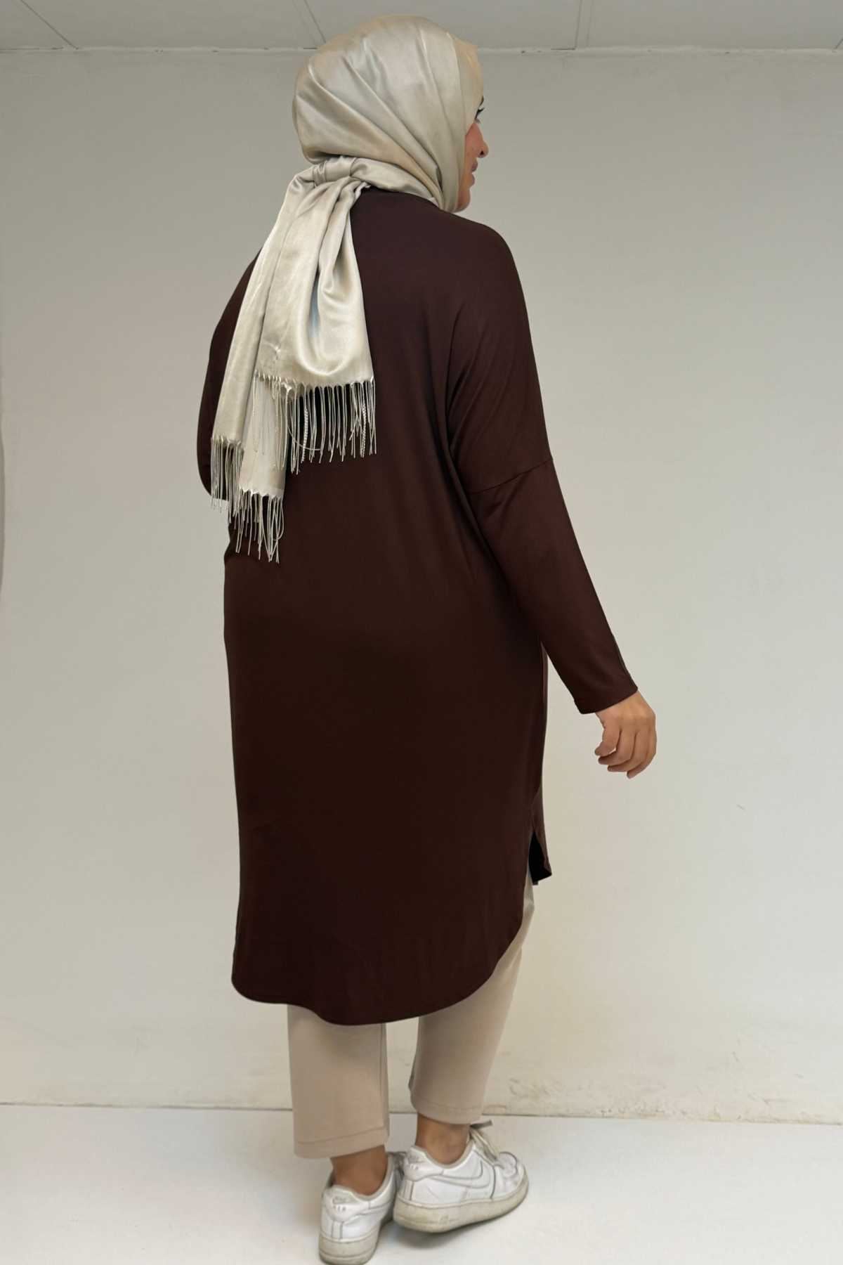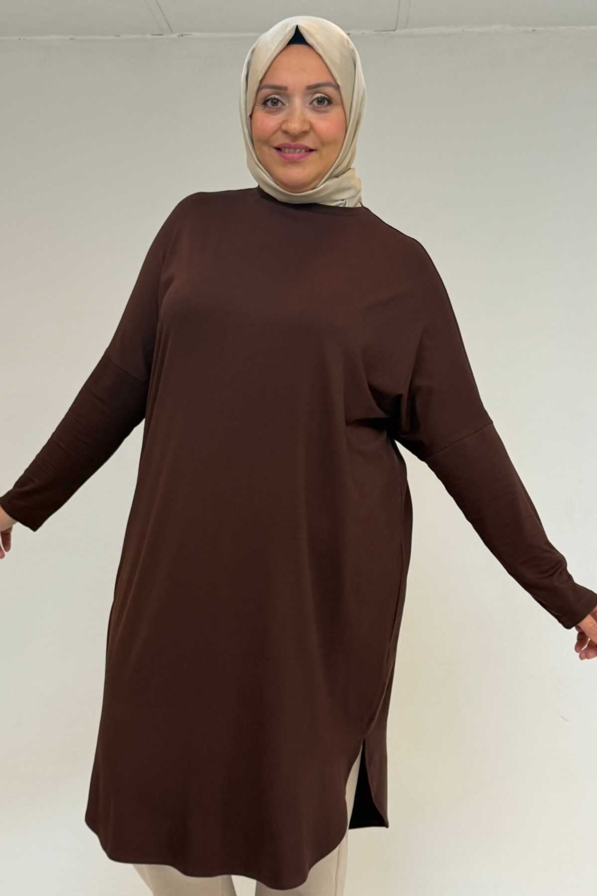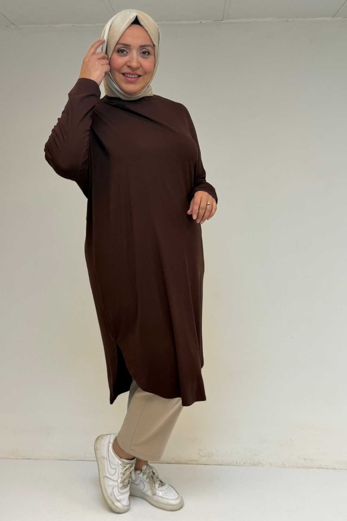 38110 Büyük Beden Düşük Kol Penye Tunik - Kahve