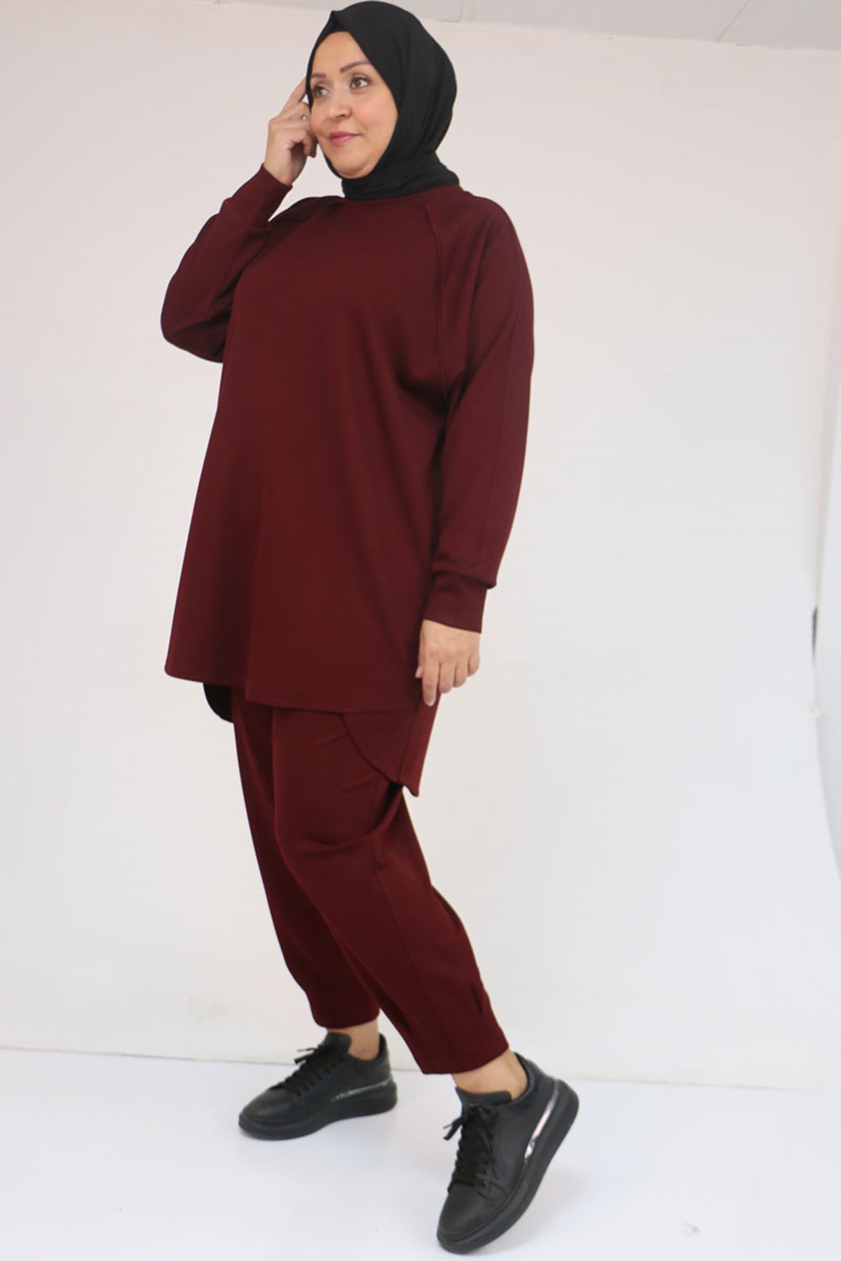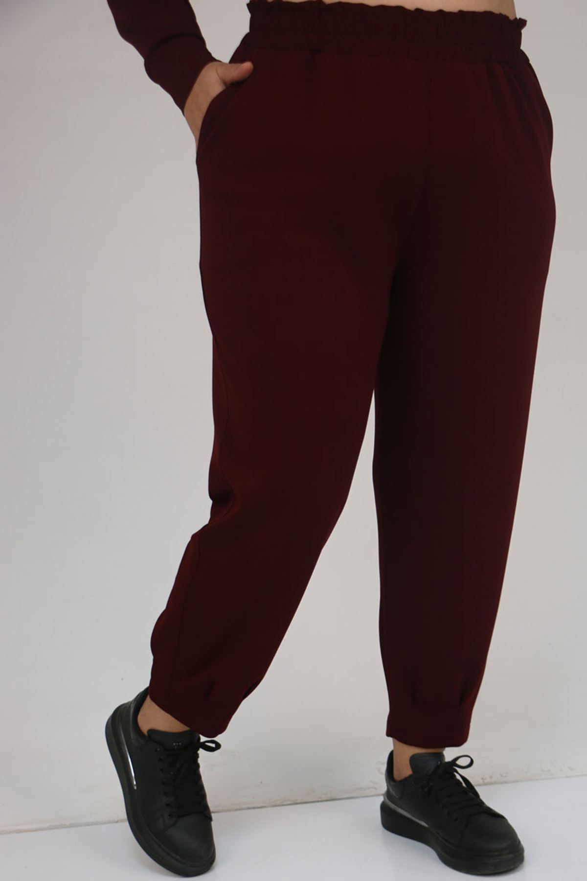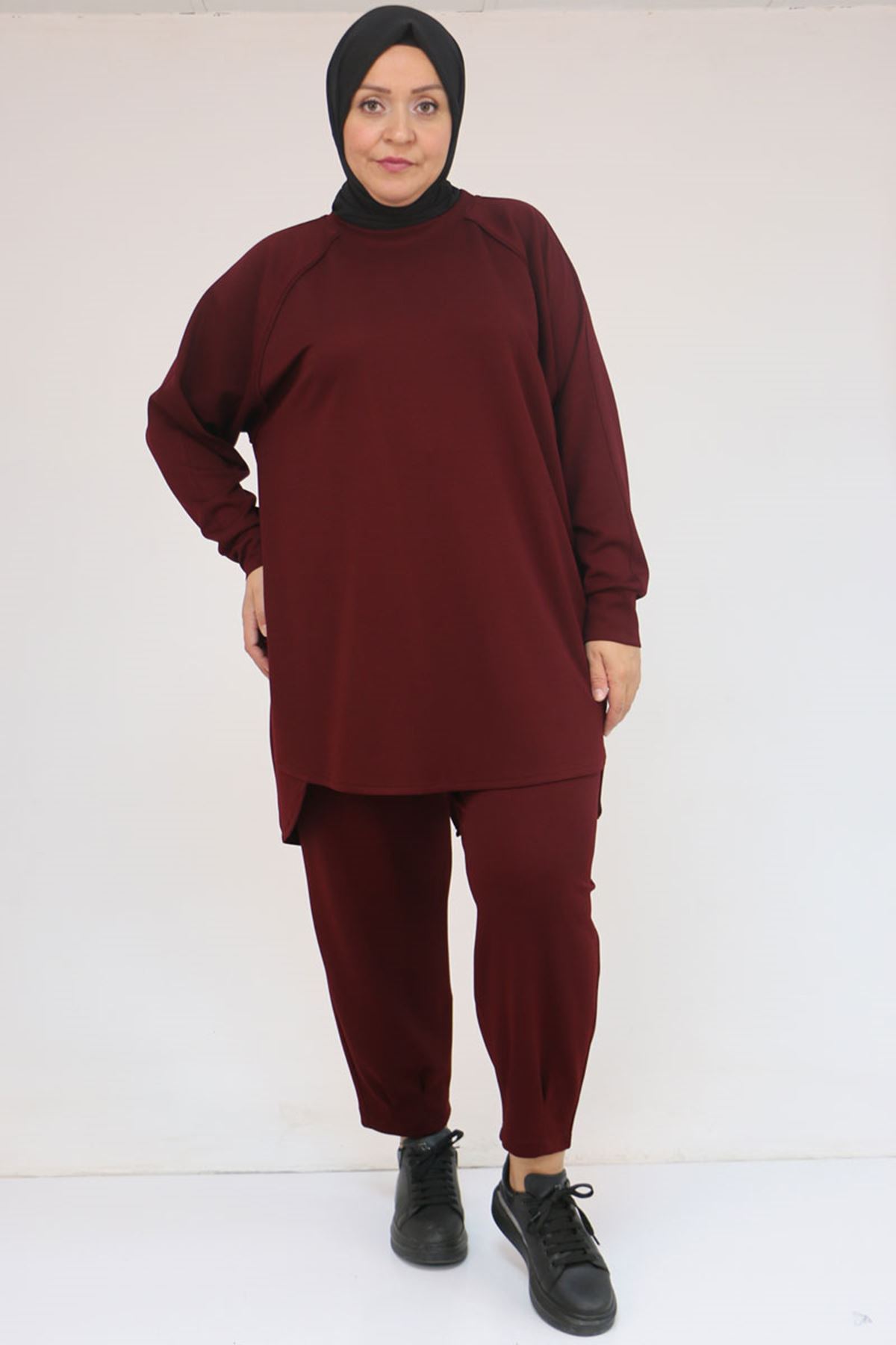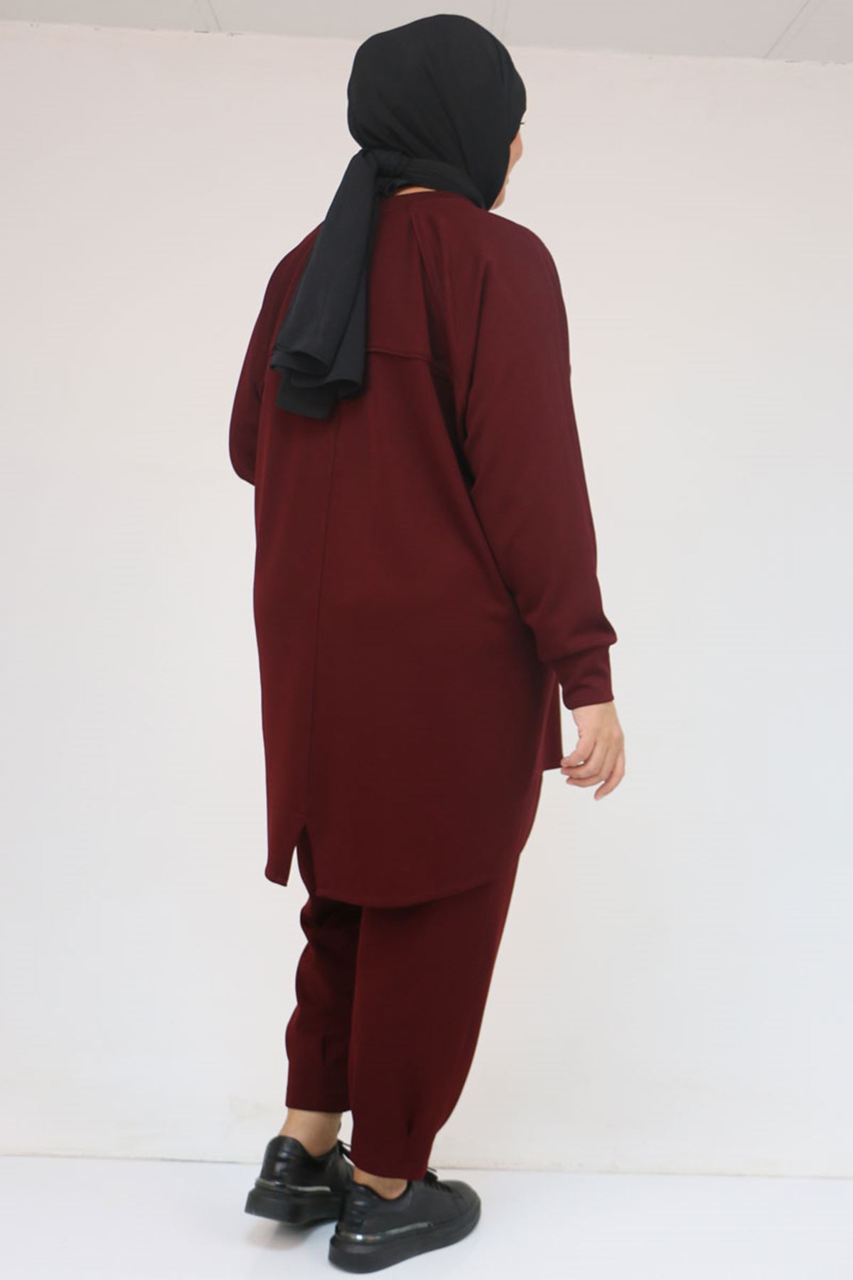 47093 Büyük Beden Eteği Parça Detaylı Pantolonlu Modal Takım - Bordo