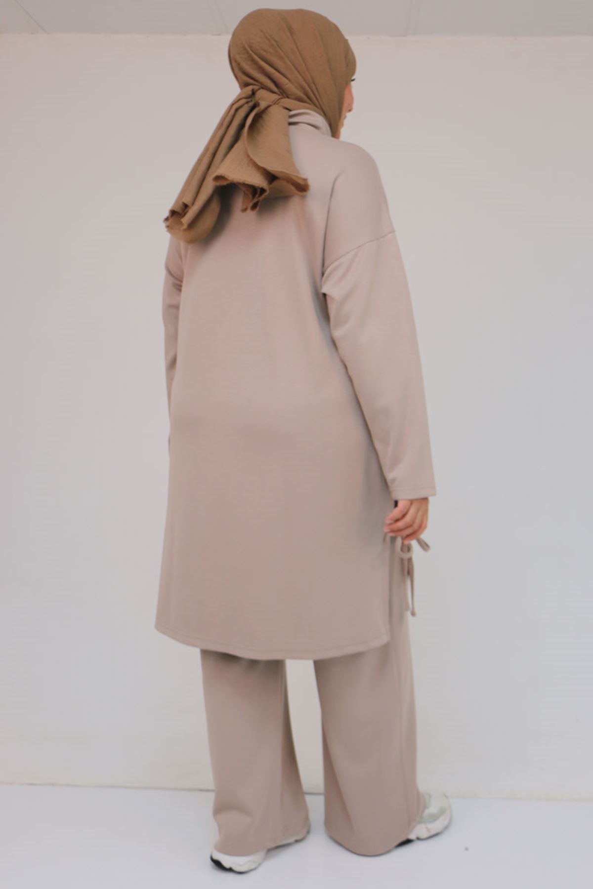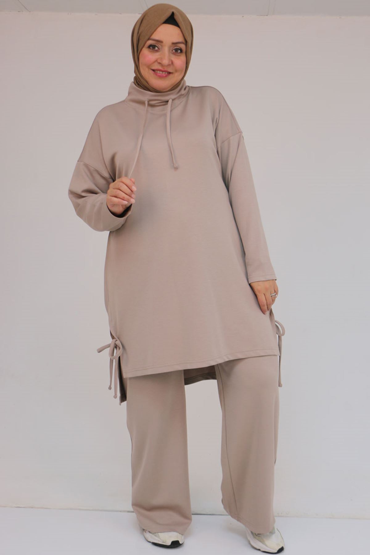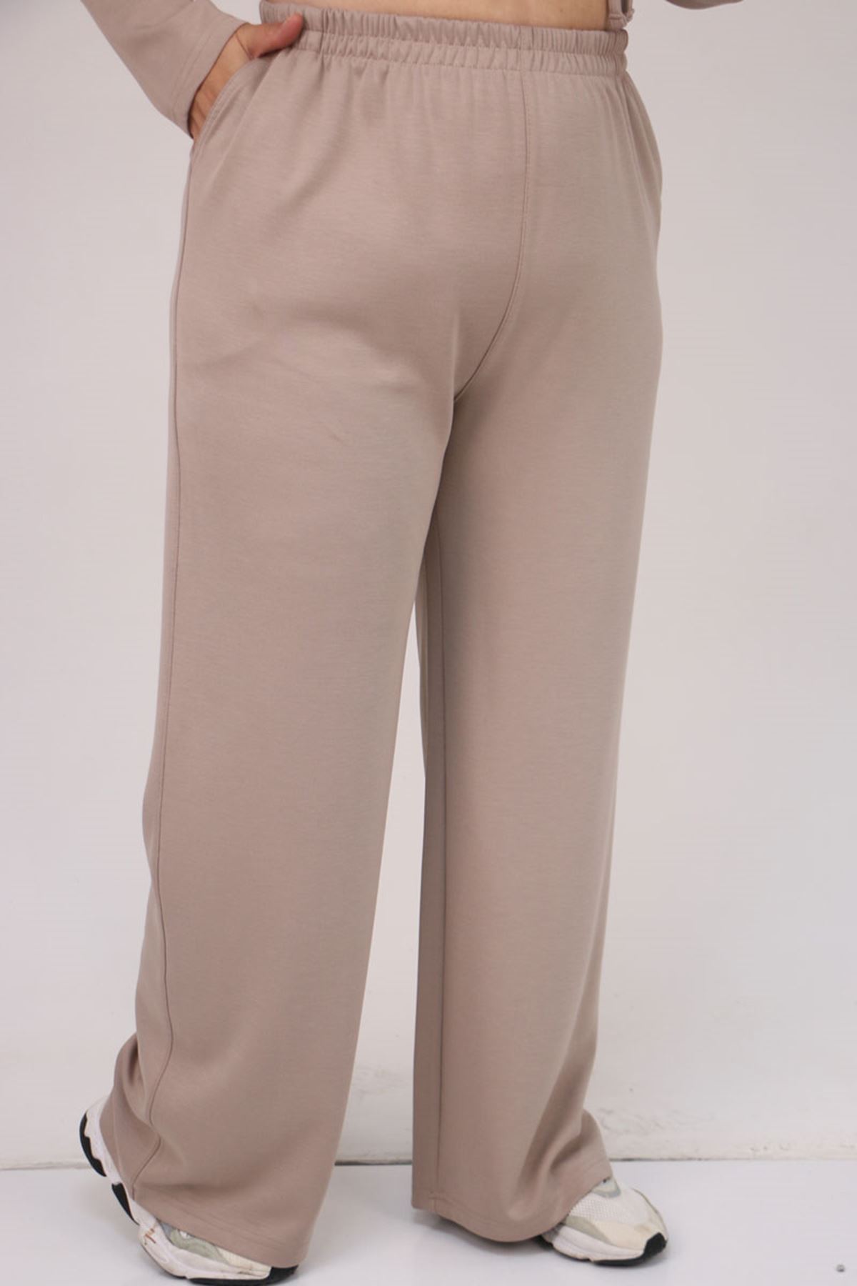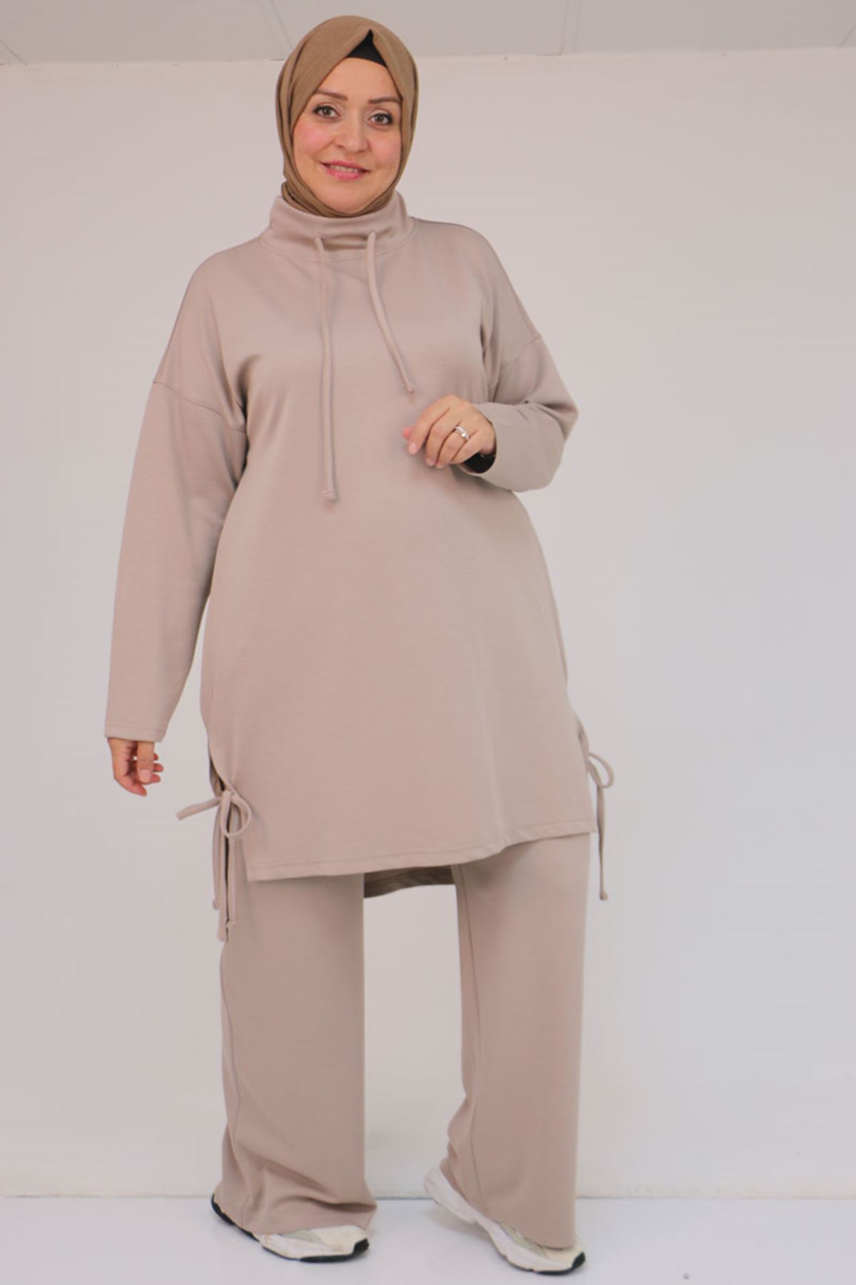 47094 Büyük Beden Boğazlı Yaka Pantolonlu Modal Takım - Vizon