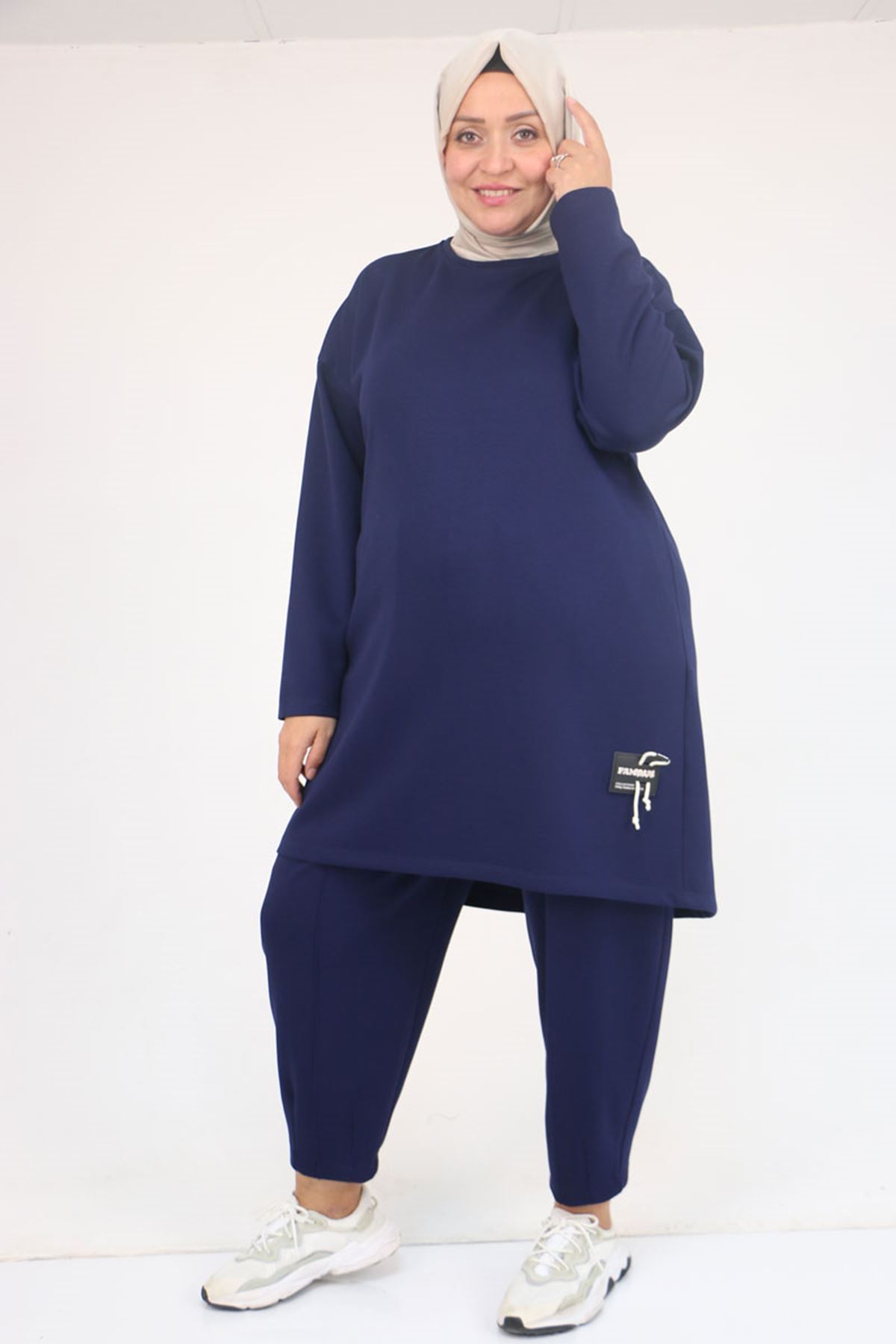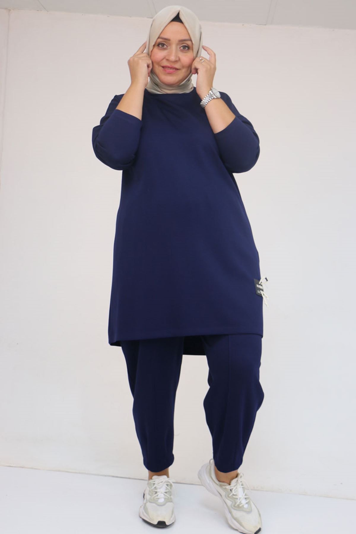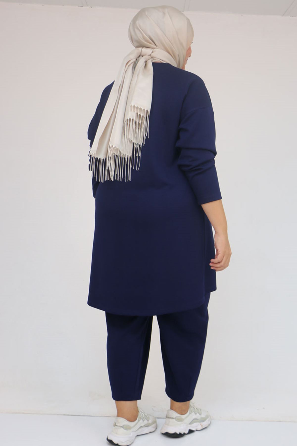 47095 Büyük Beden Yan Tarafı Arma Detaylı Modal Pantolonlu Takım - İndigo