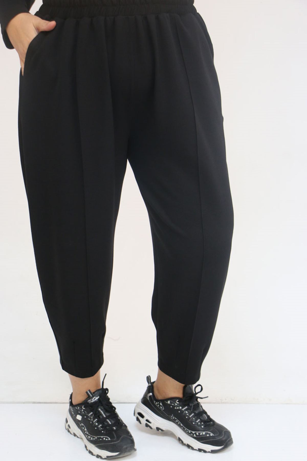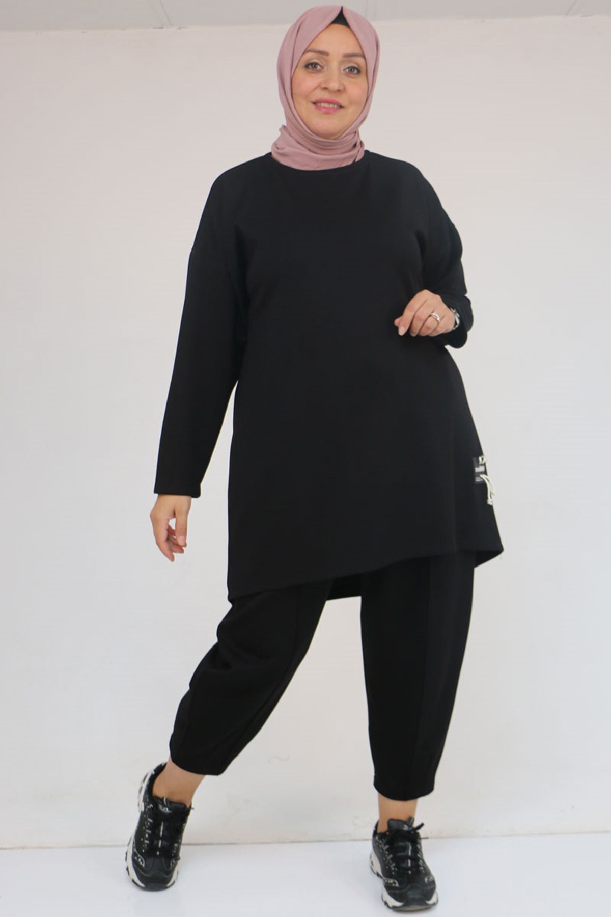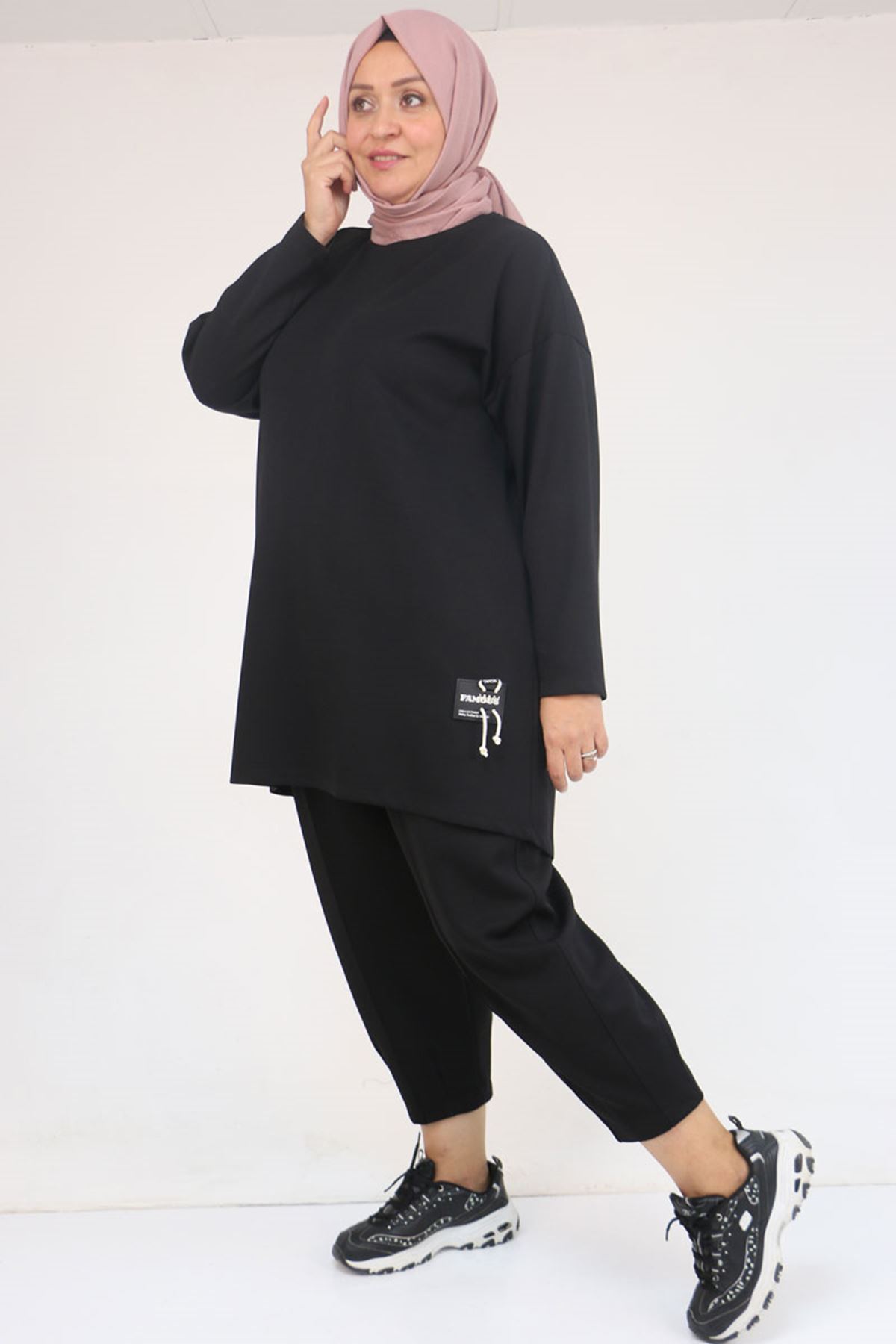 47095 Büyük Beden Yan Tarafı Arma Detaylı Modal Pantolonlu Takım - Siyah