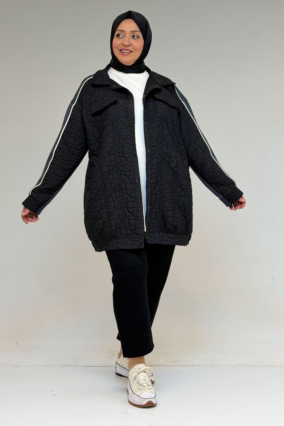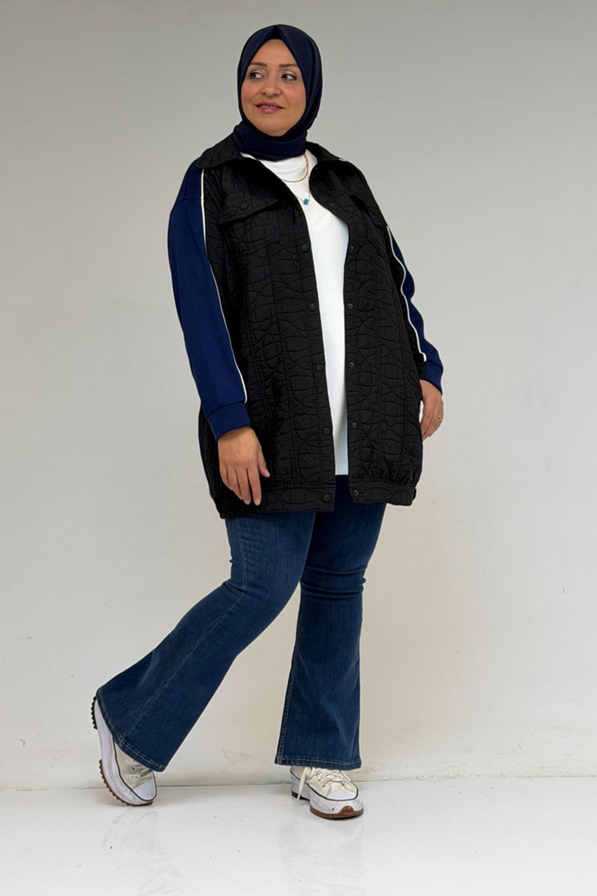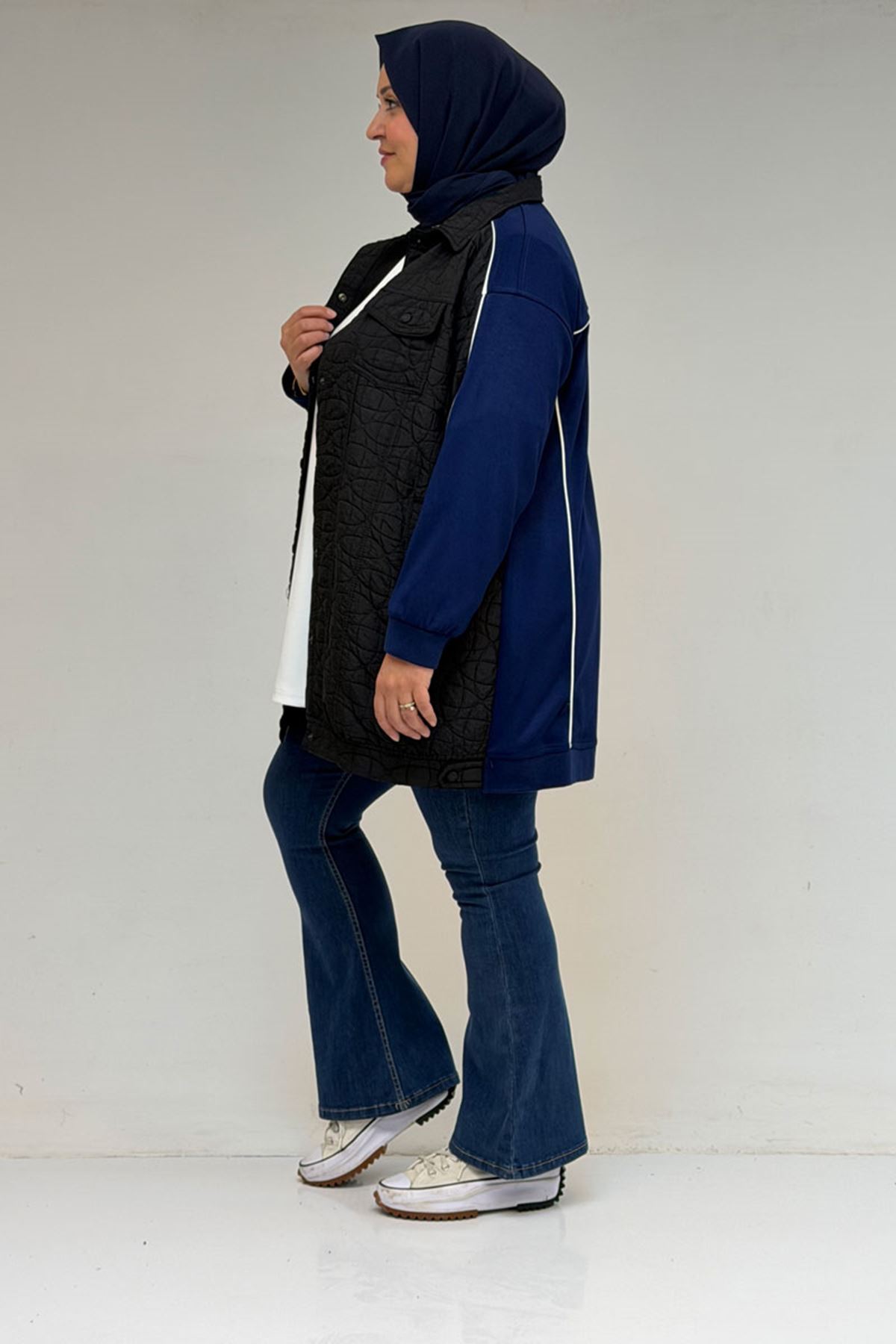 53029 Büyük Beden Biye Detaylı Kombinli Modal-Kapitone Ceket - Siyah-İndigo