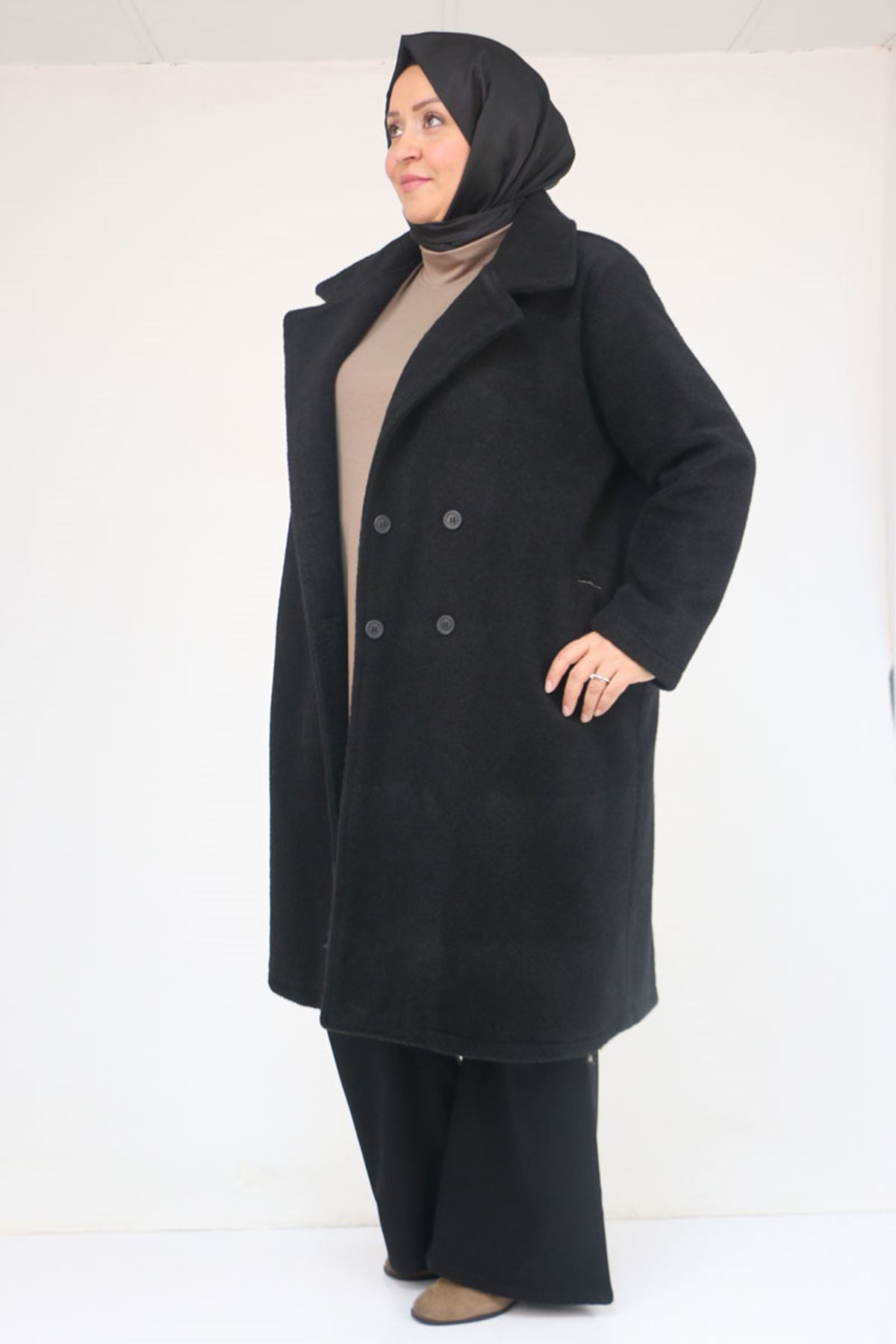 33059 Büyük Beden Düğme Detaylı Keçe Kaban - Siyah