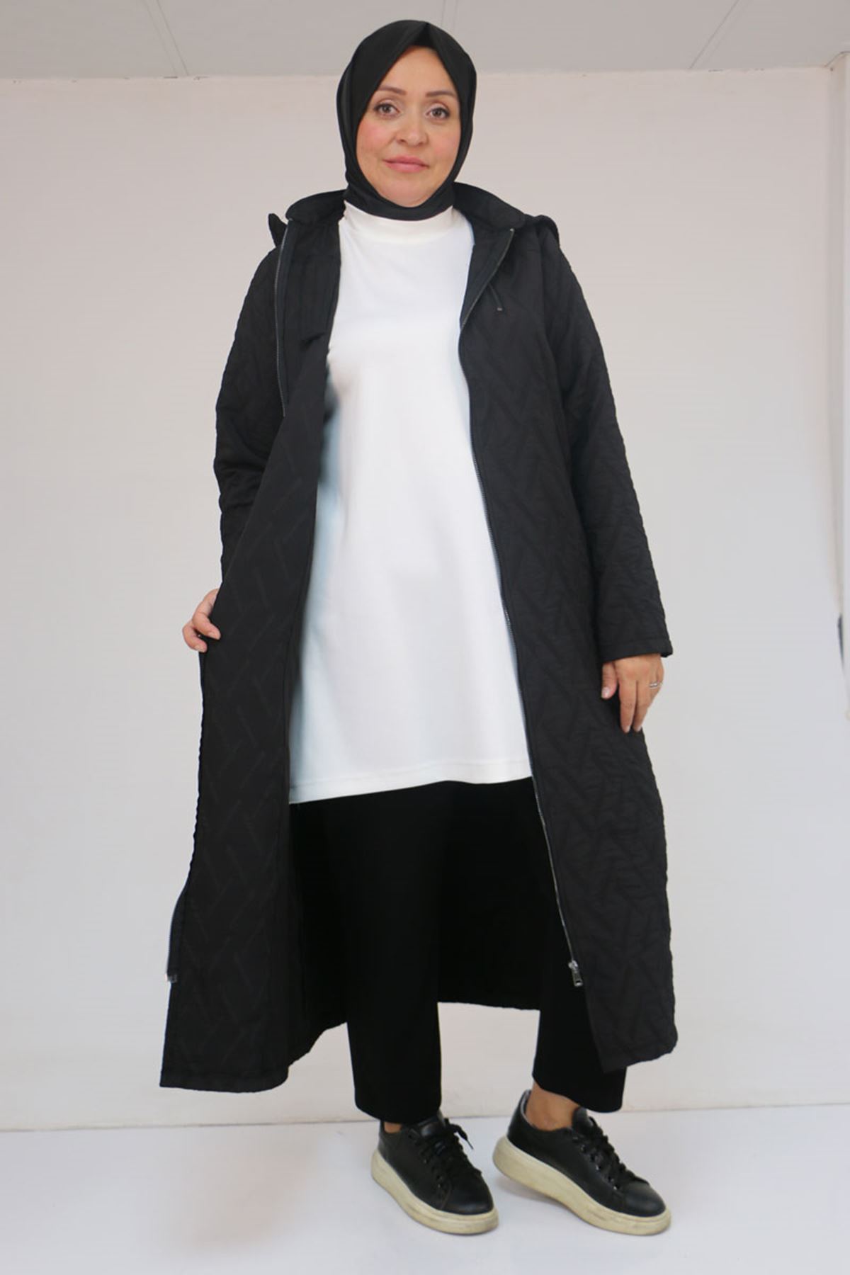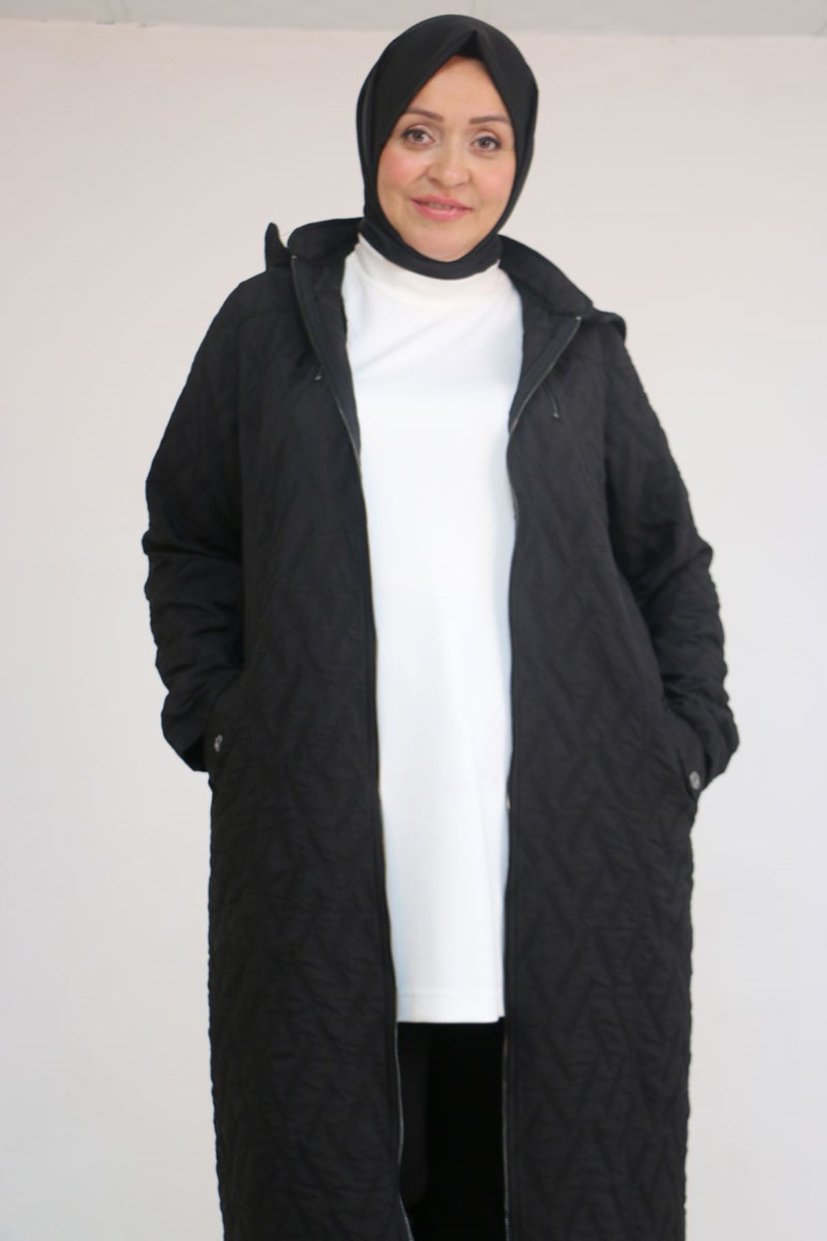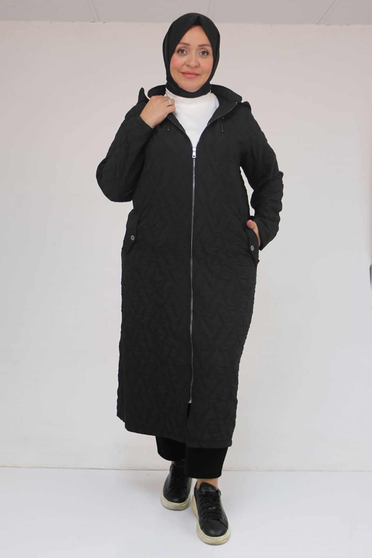 53038 Büyük Beden Kapşonlu Fermuarlı Kapitone Trençkot - Siyah