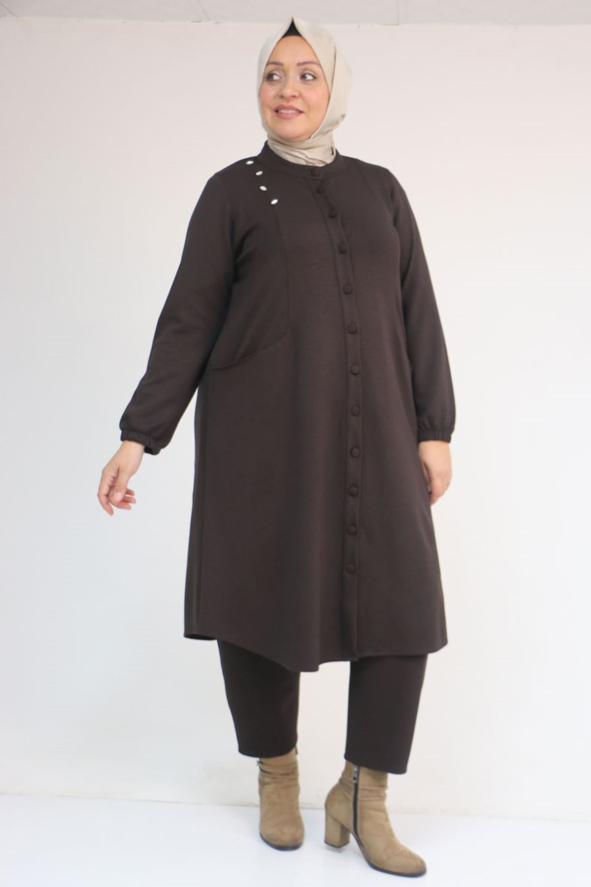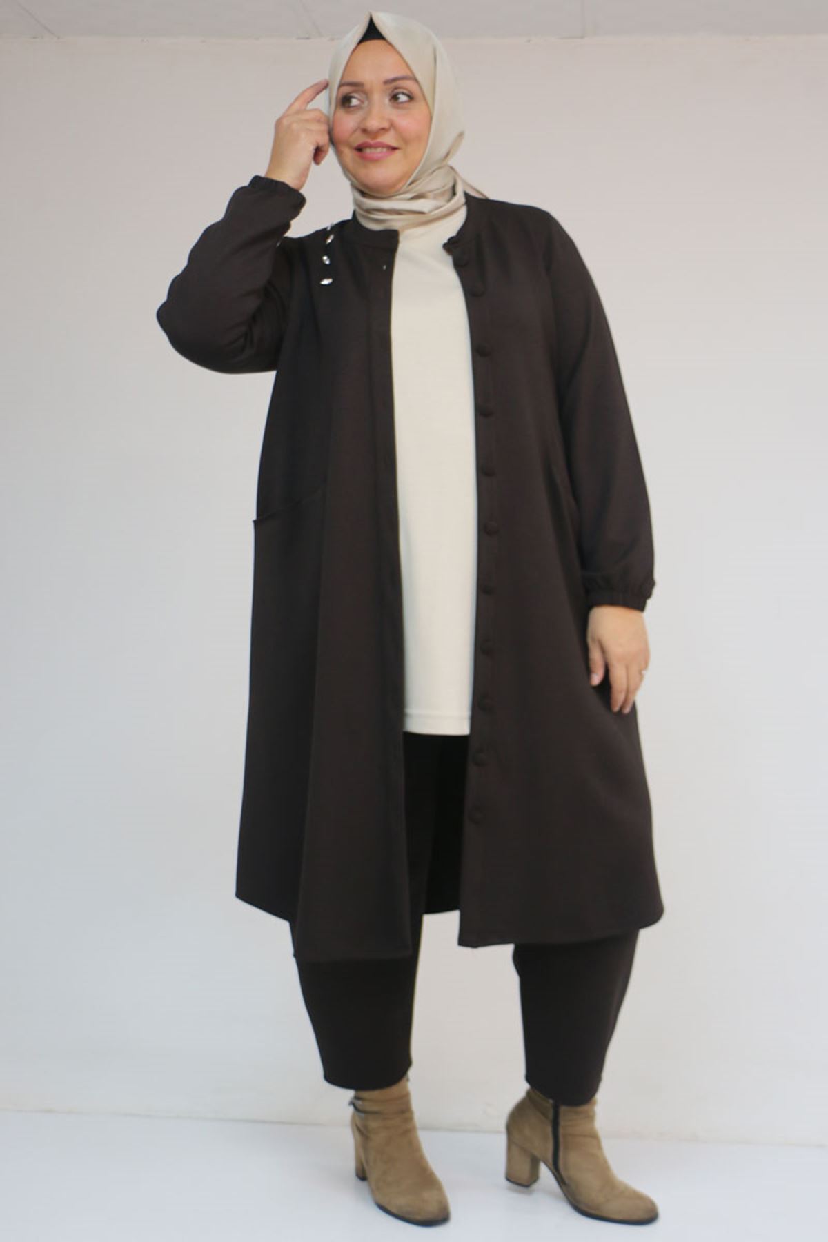 53054 Büyük Beden Boydan Düğmeli Modal Ceket - Kahve