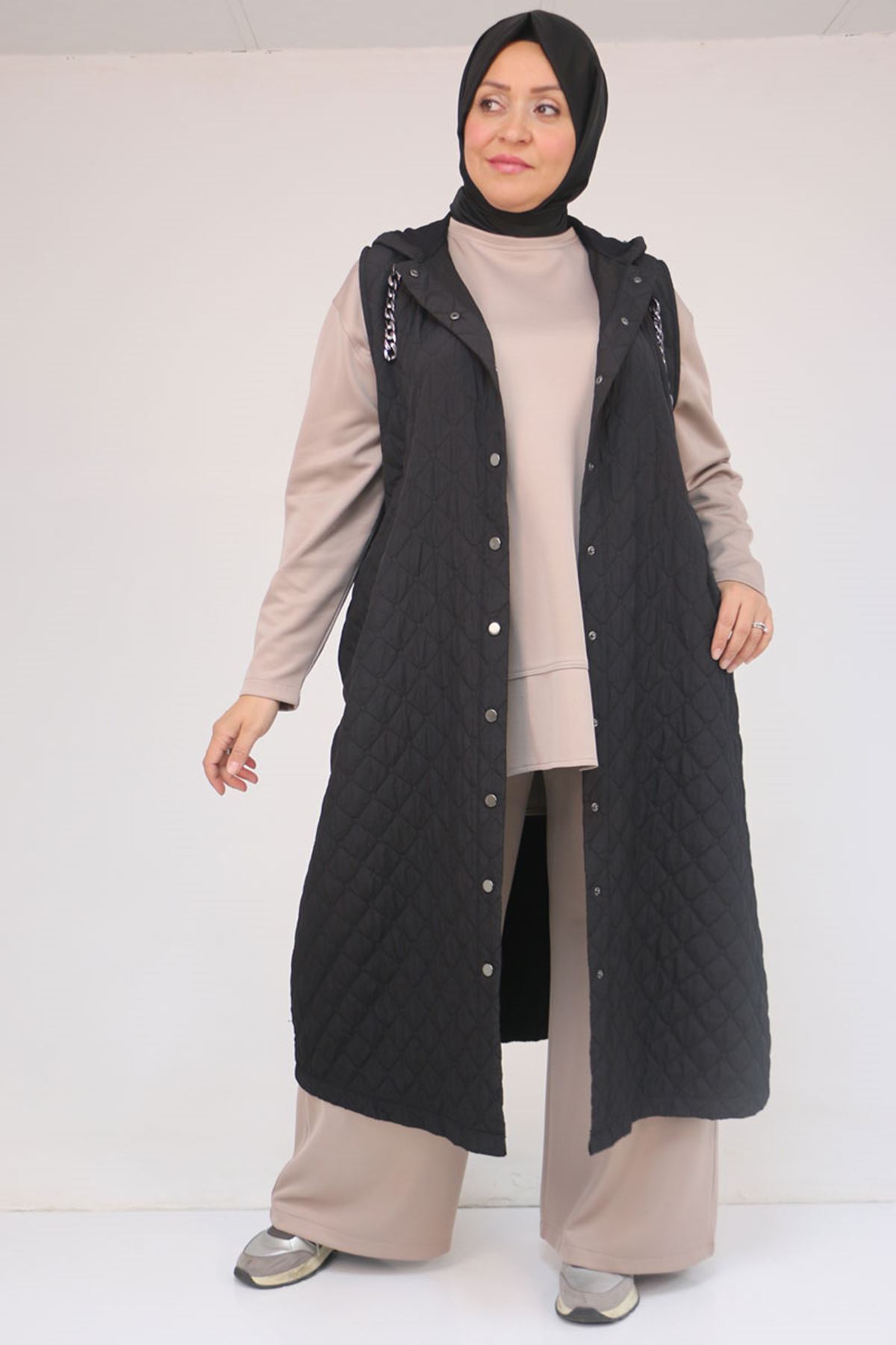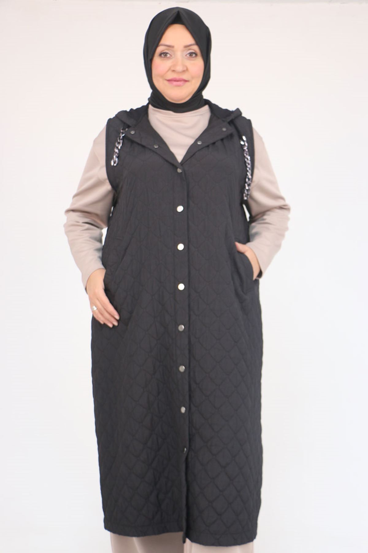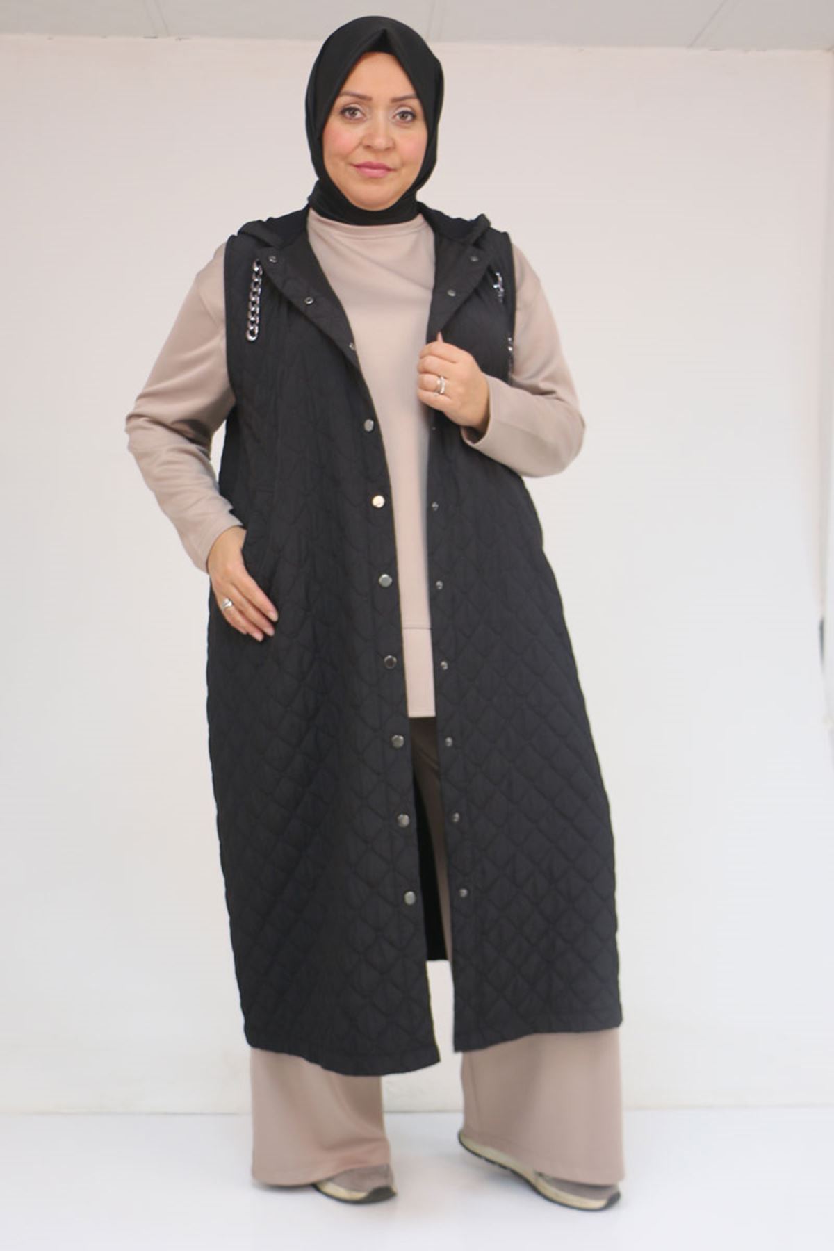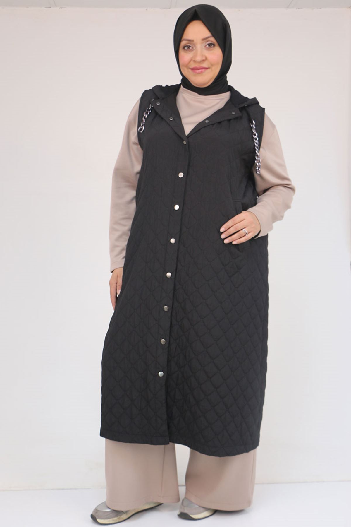 54008 Büyük Beden Zincir Kordonlu Modal-Kapitone Yelek - Siyah