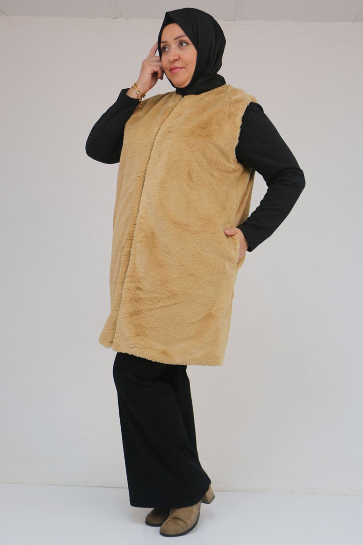 54013 Büyük Beden Cepli Rabbit Astarlı Yelek - Bej