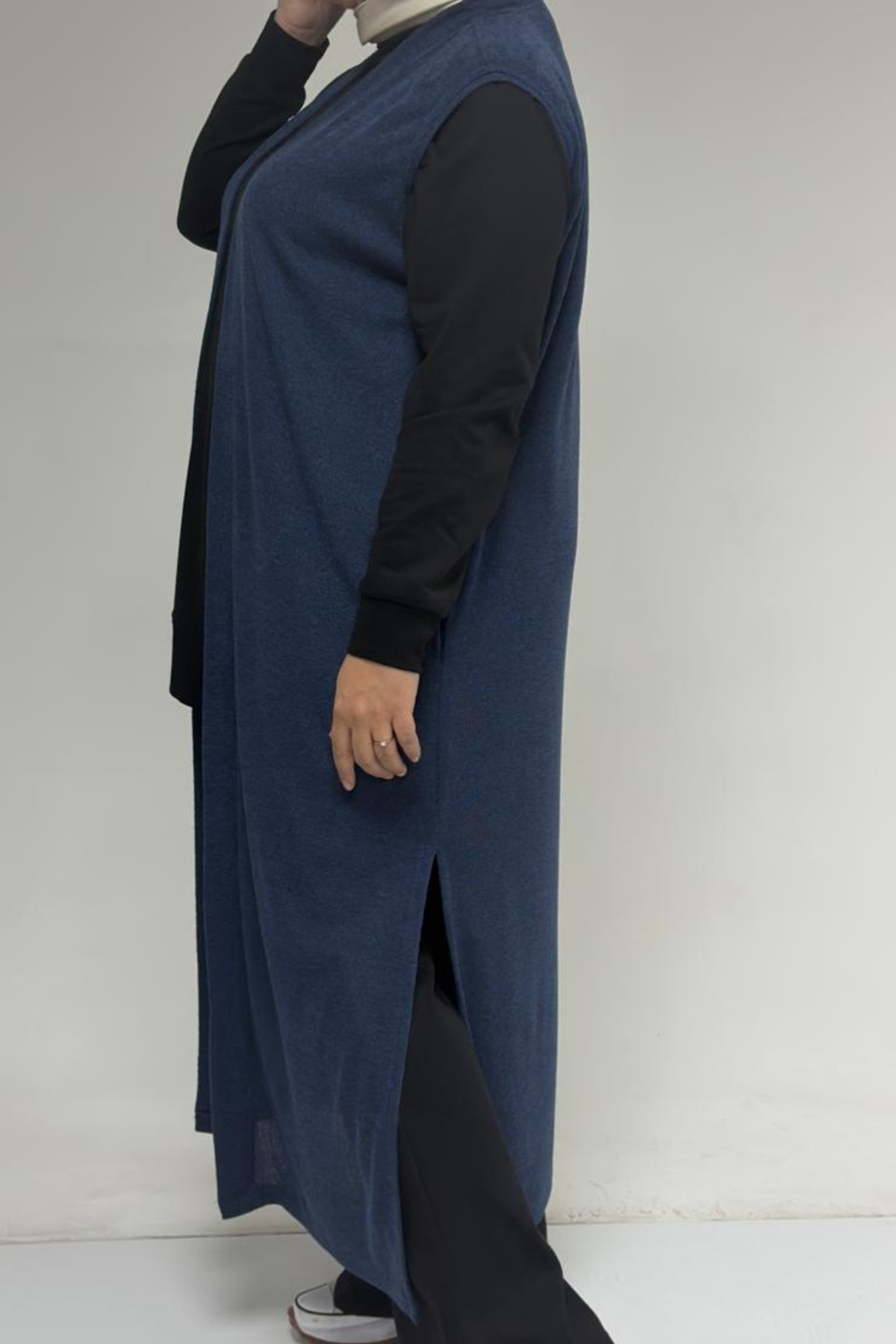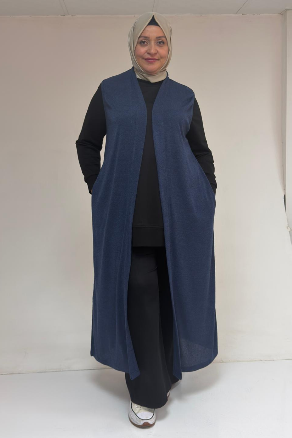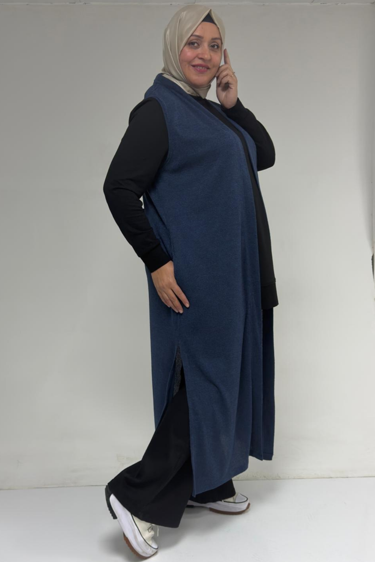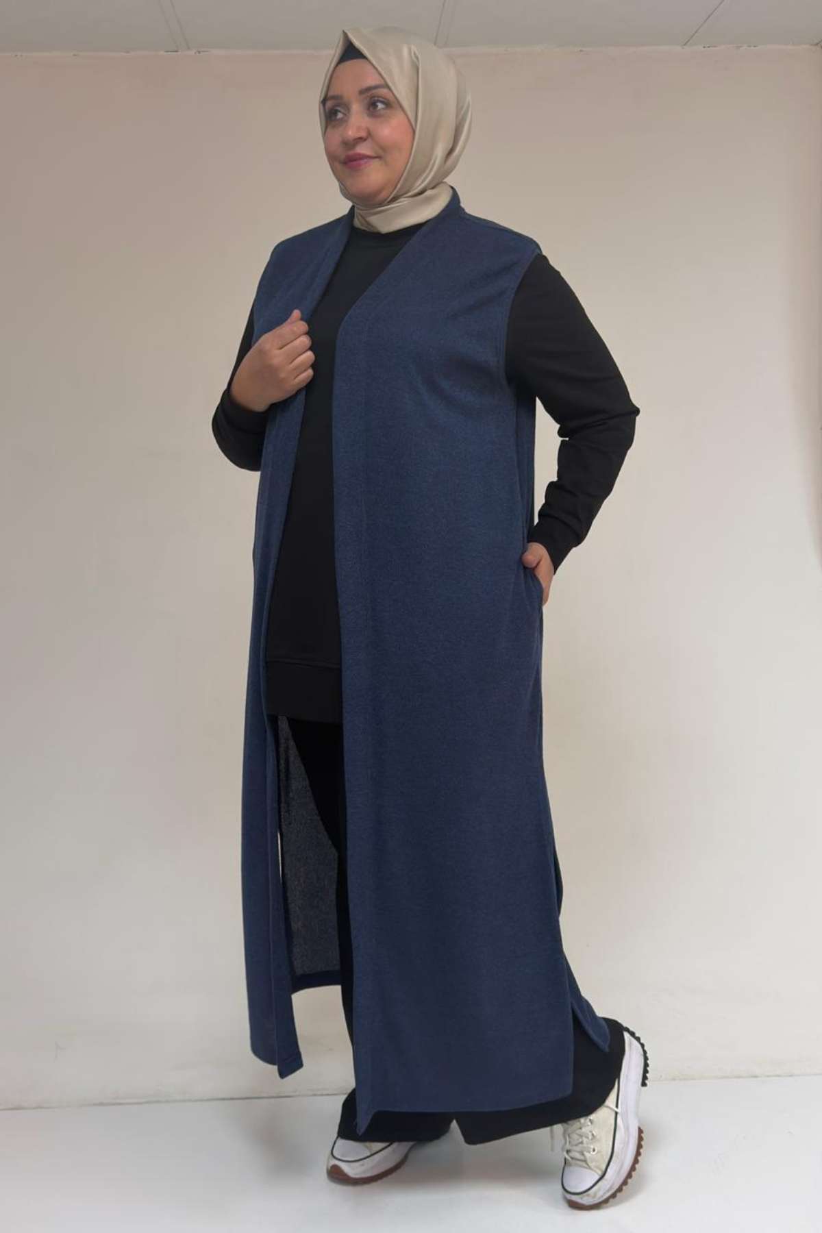 54015 Büyük Beden Yırtmaçlı Cepli Uzun Mir Yelek - İndigo