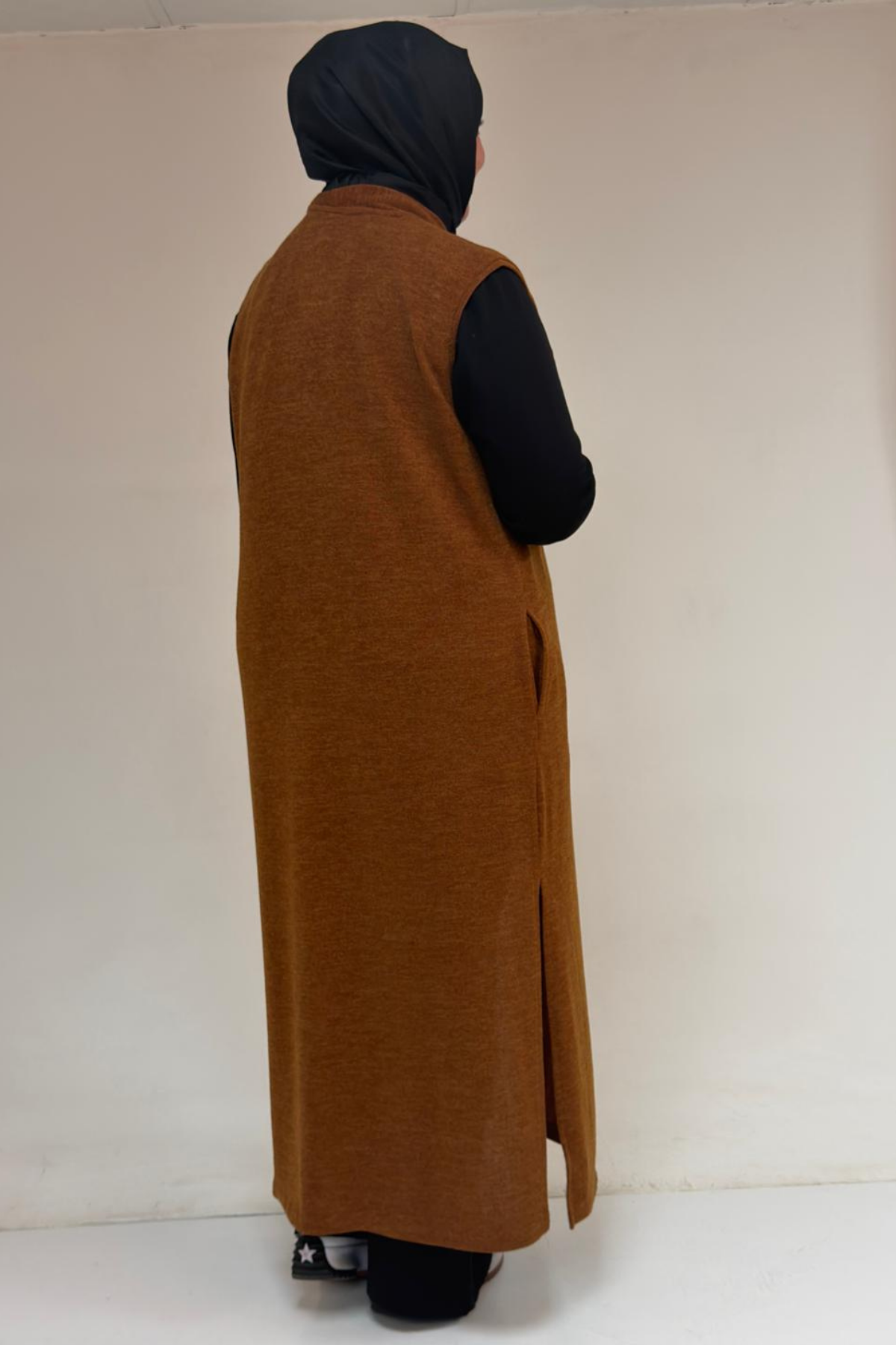 54015 Büyük Beden Yırtmaçlı Cepli Uzun Mir Yelek - Taba