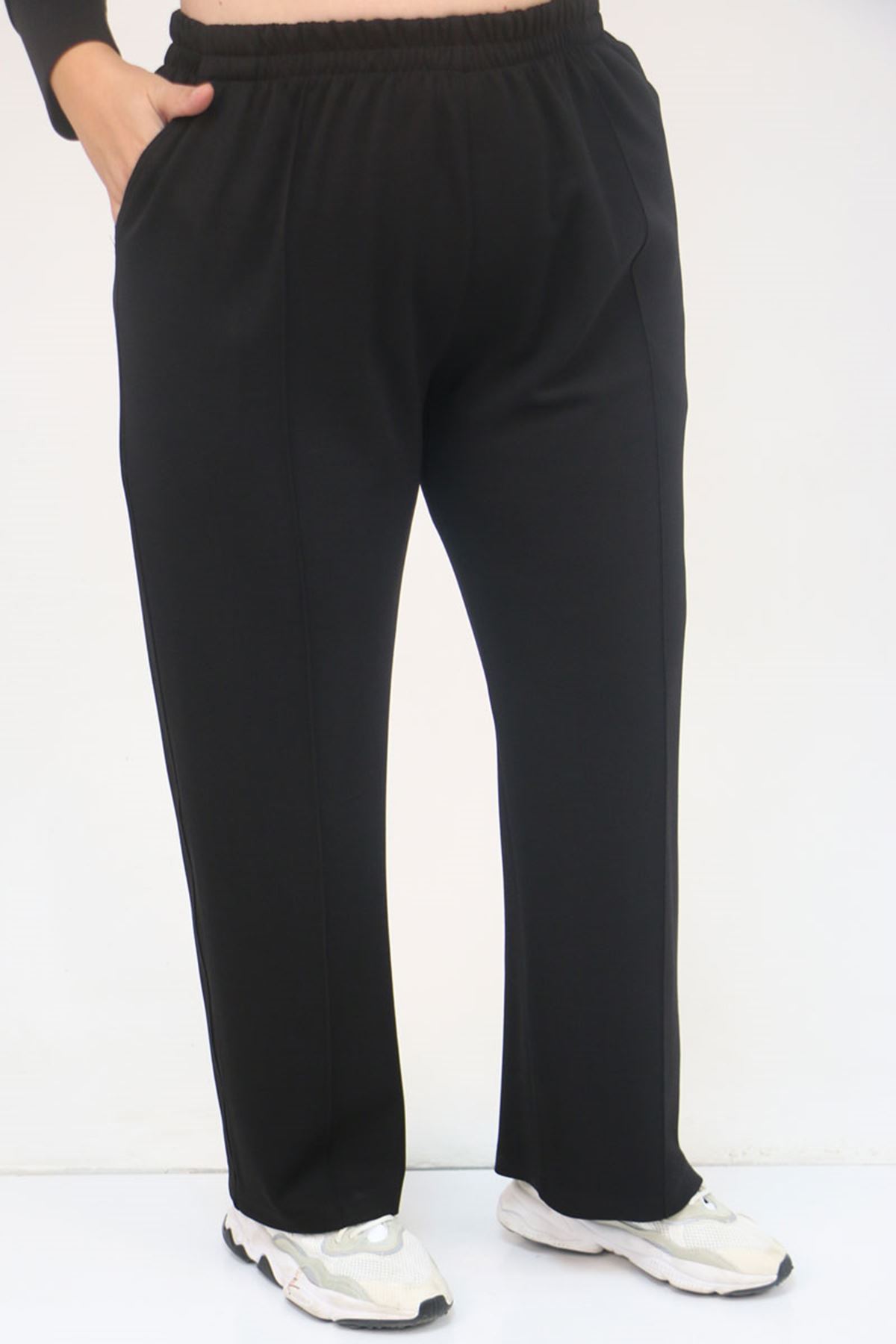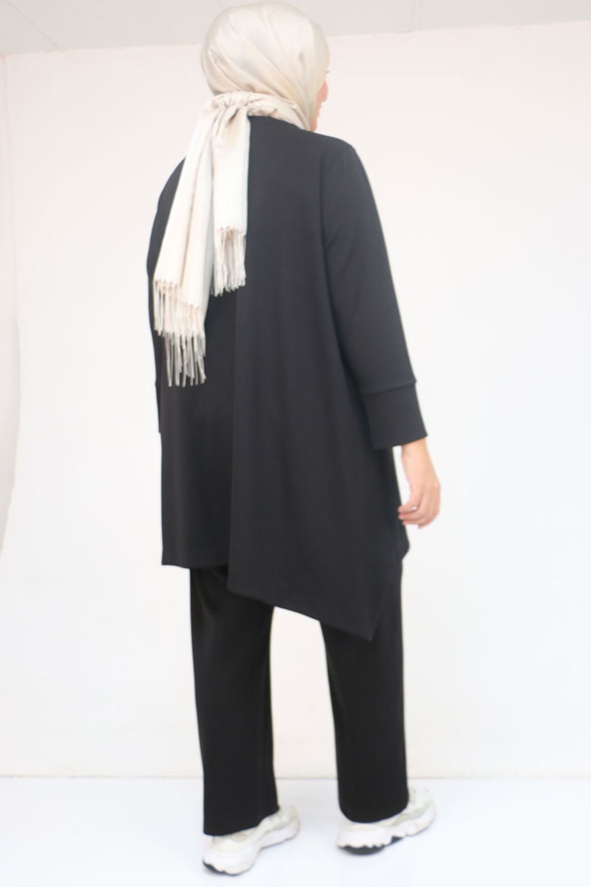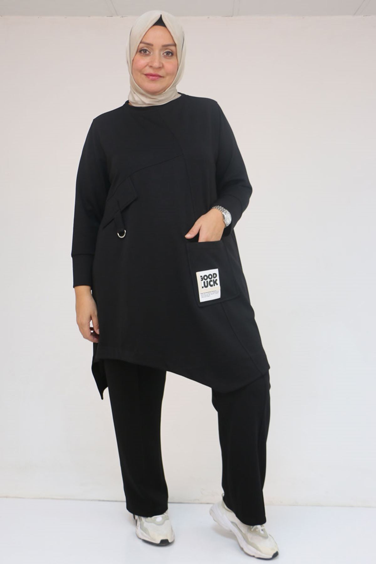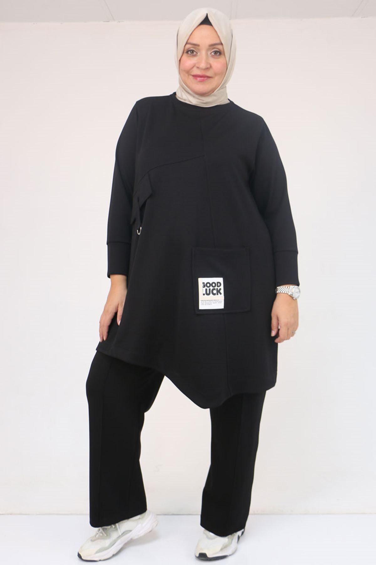 57041 Büyük Beden Cepte Arma Detaylı Modal Pantolonlu Takım - Siyah