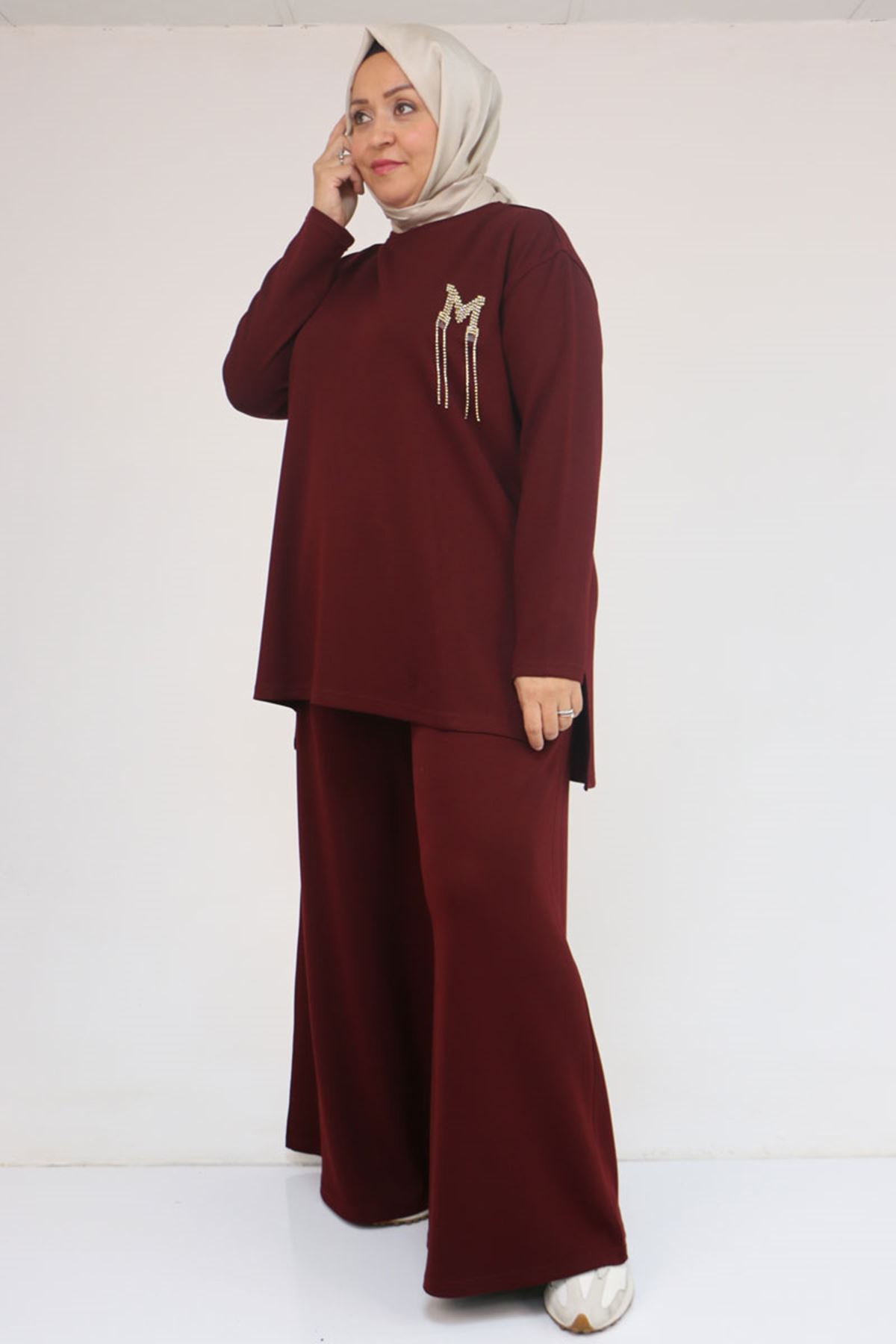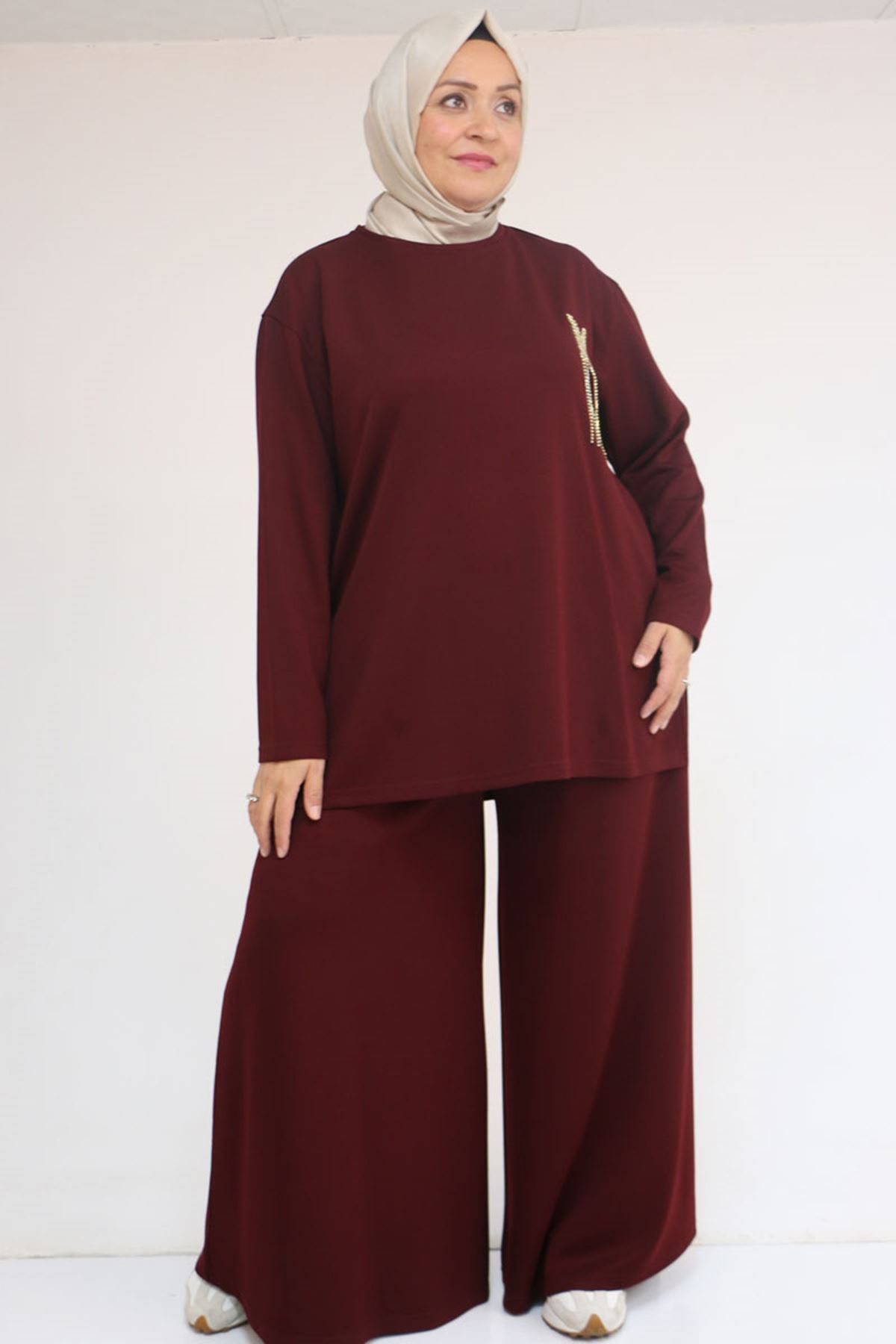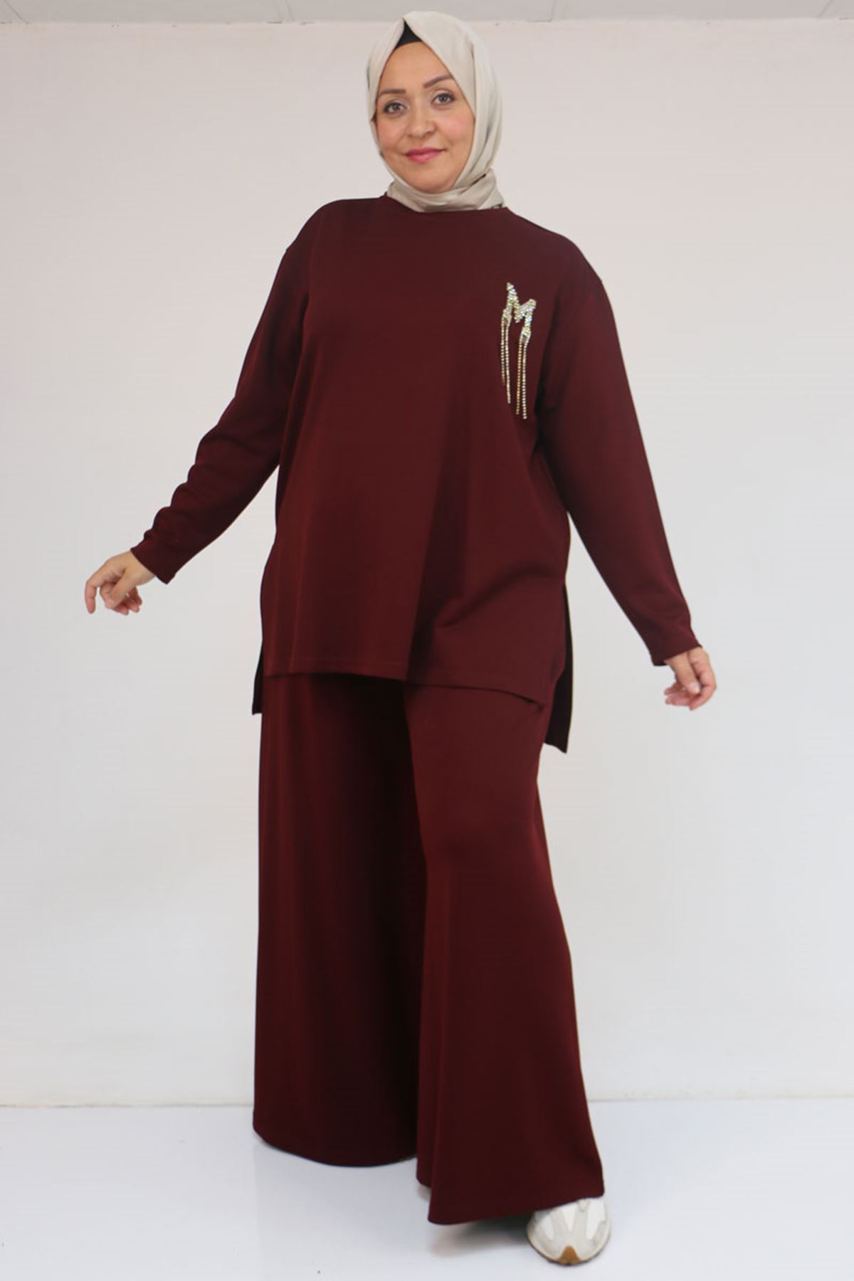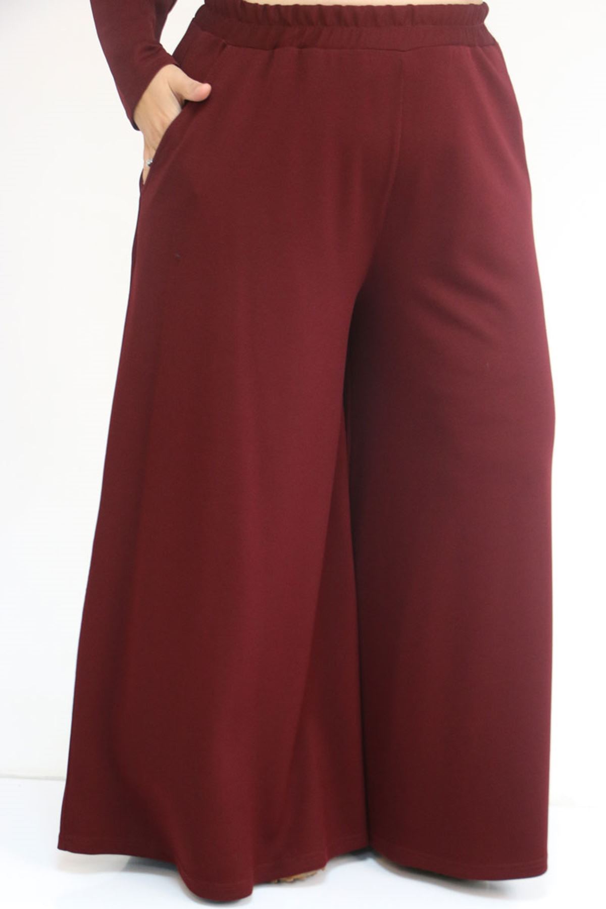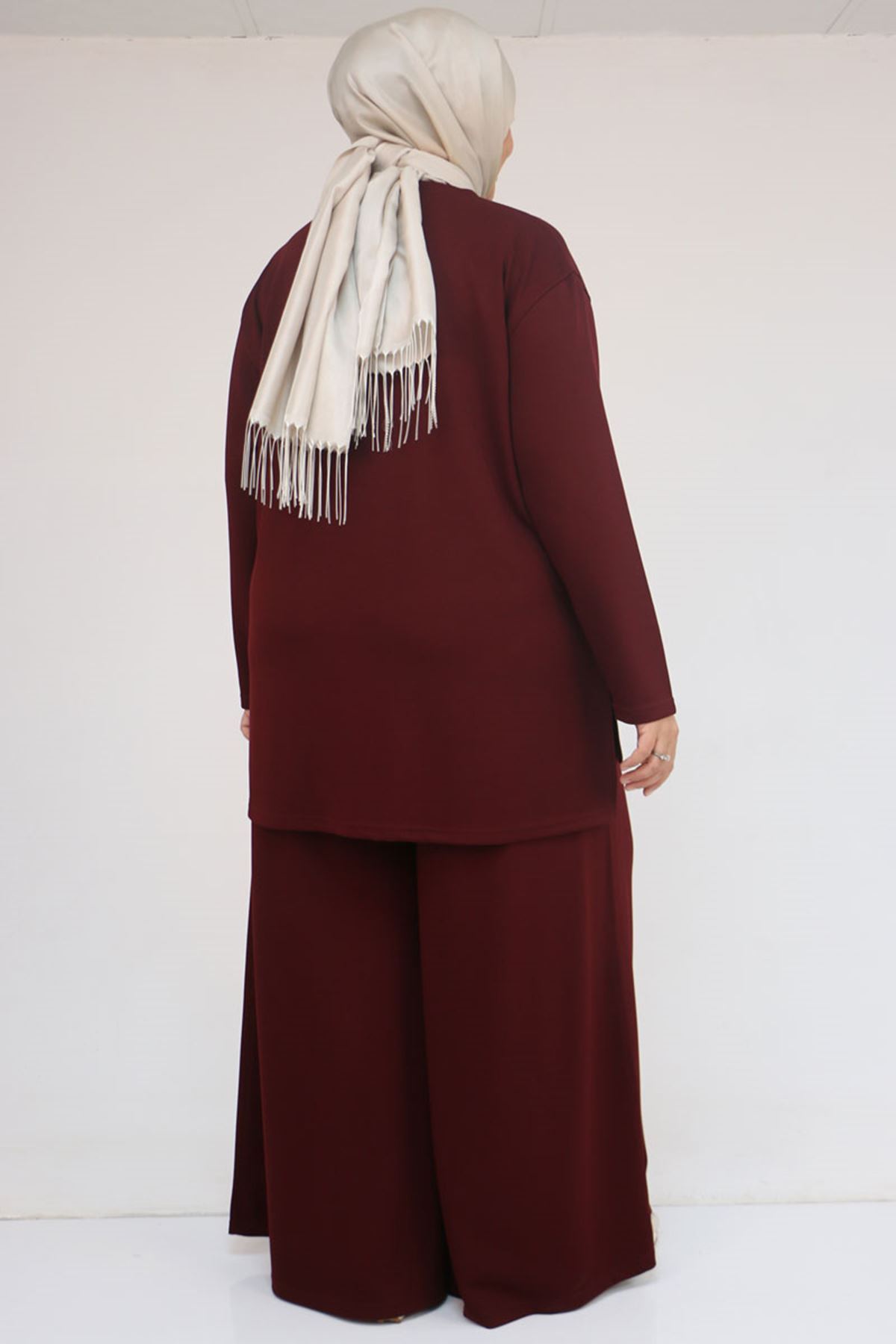57043 Büyük Beden Yanı Yırtmaçlı Modal Pantolonlu Takım - Bordo