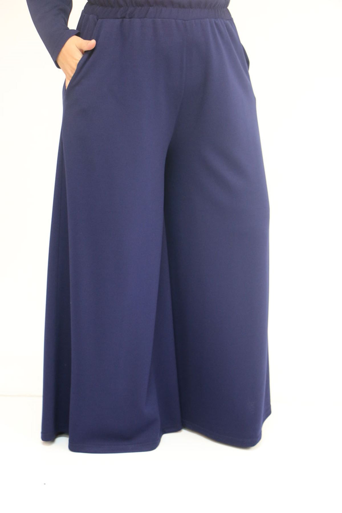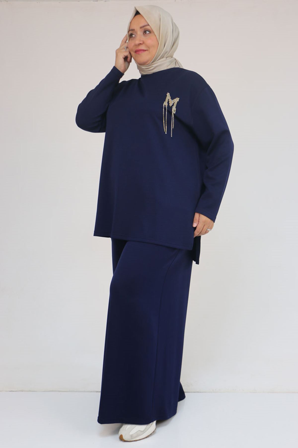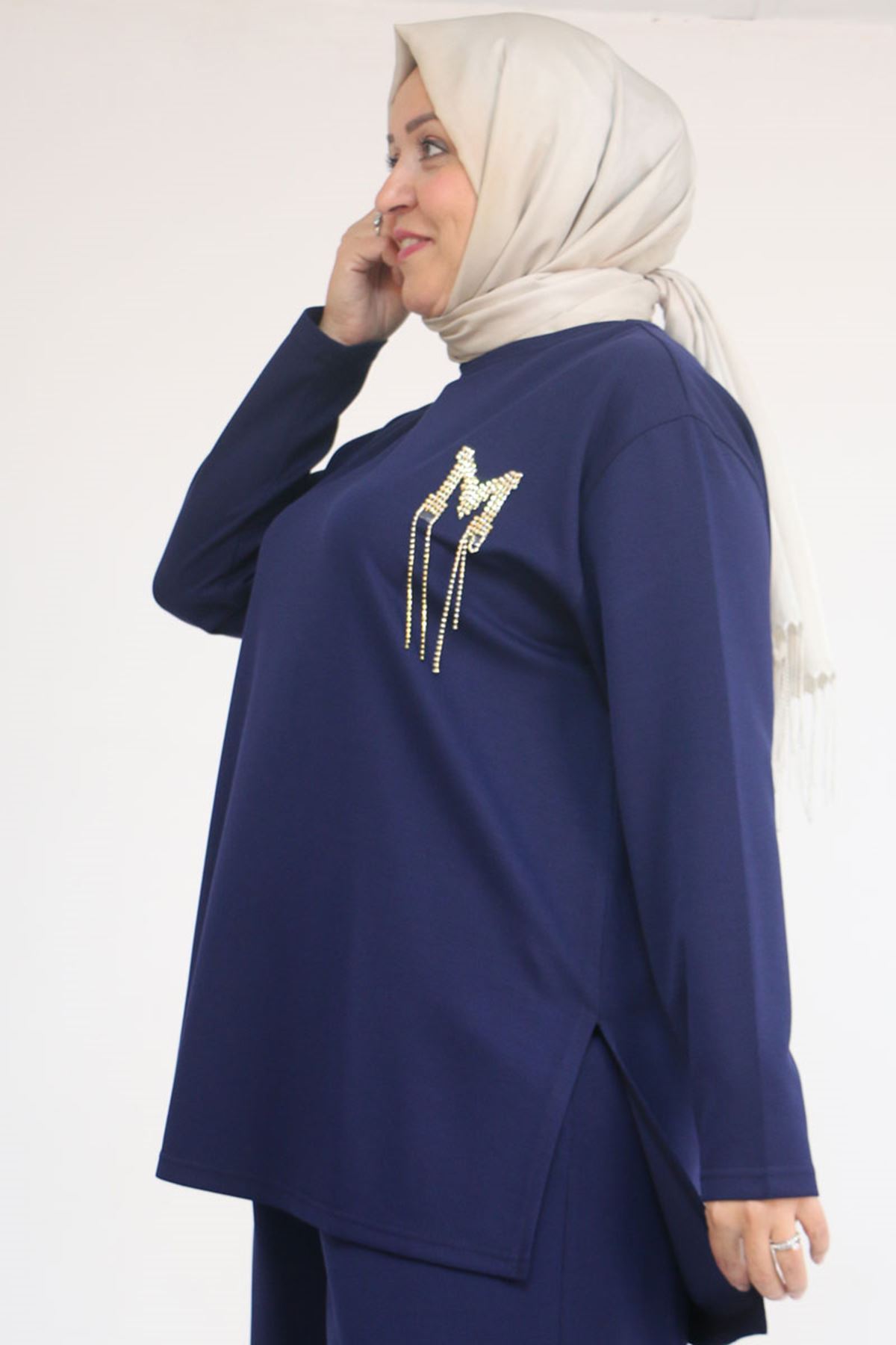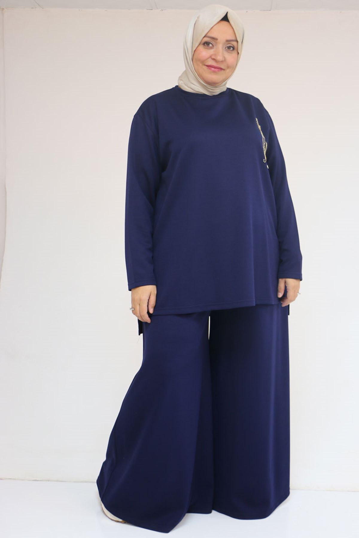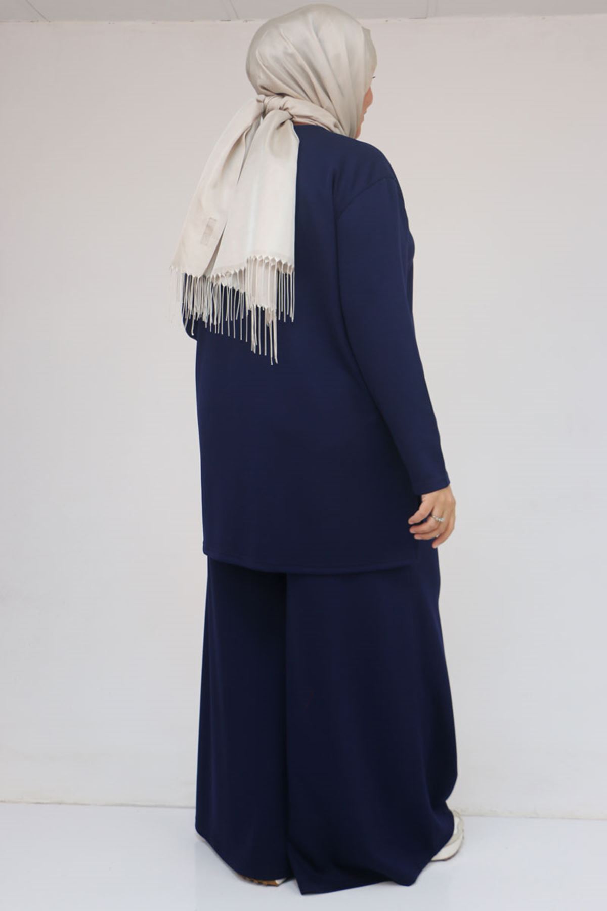 57043 Büyük Beden Yanı Yırtmaçlı Modal Pantolonlu Takım - İndigo