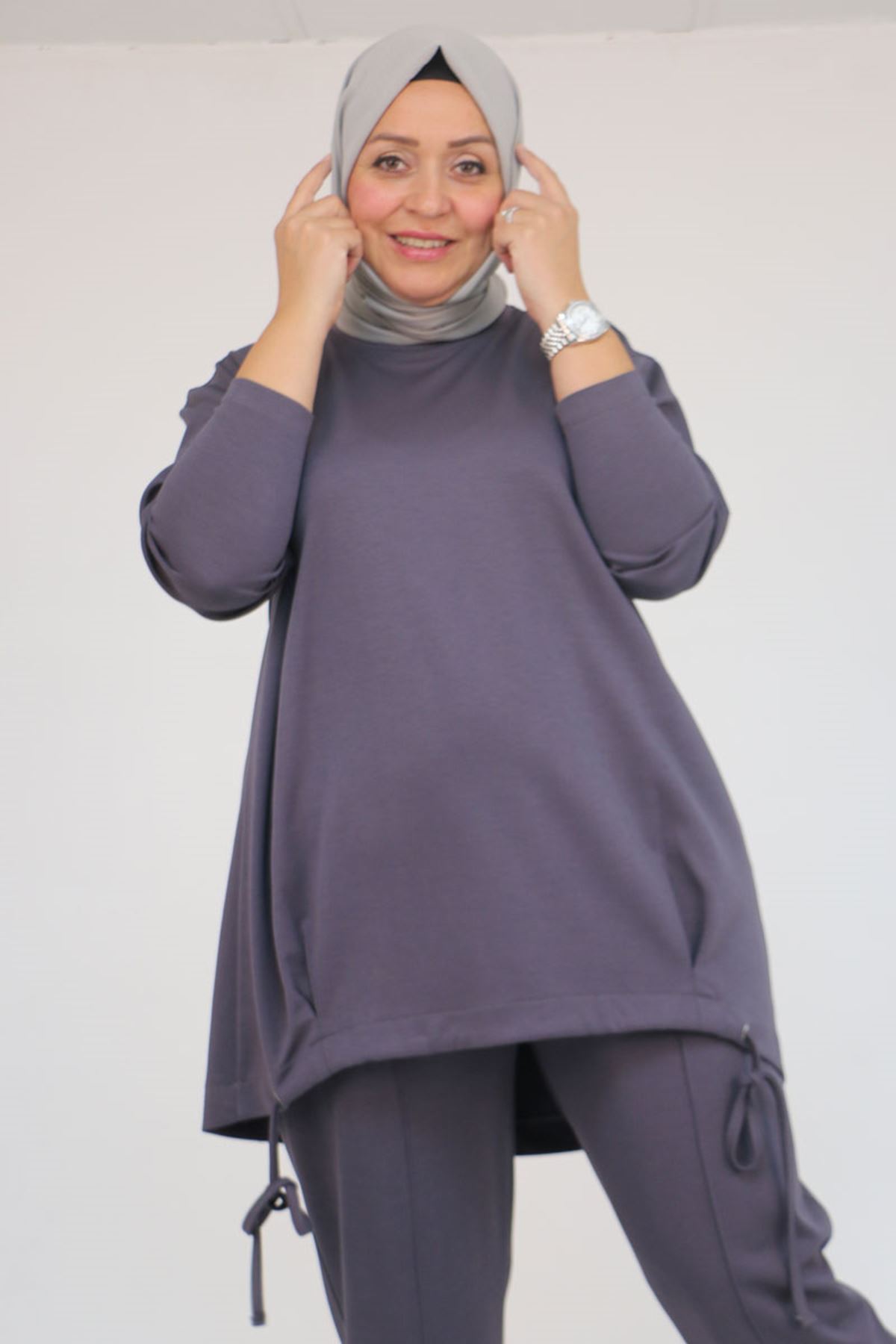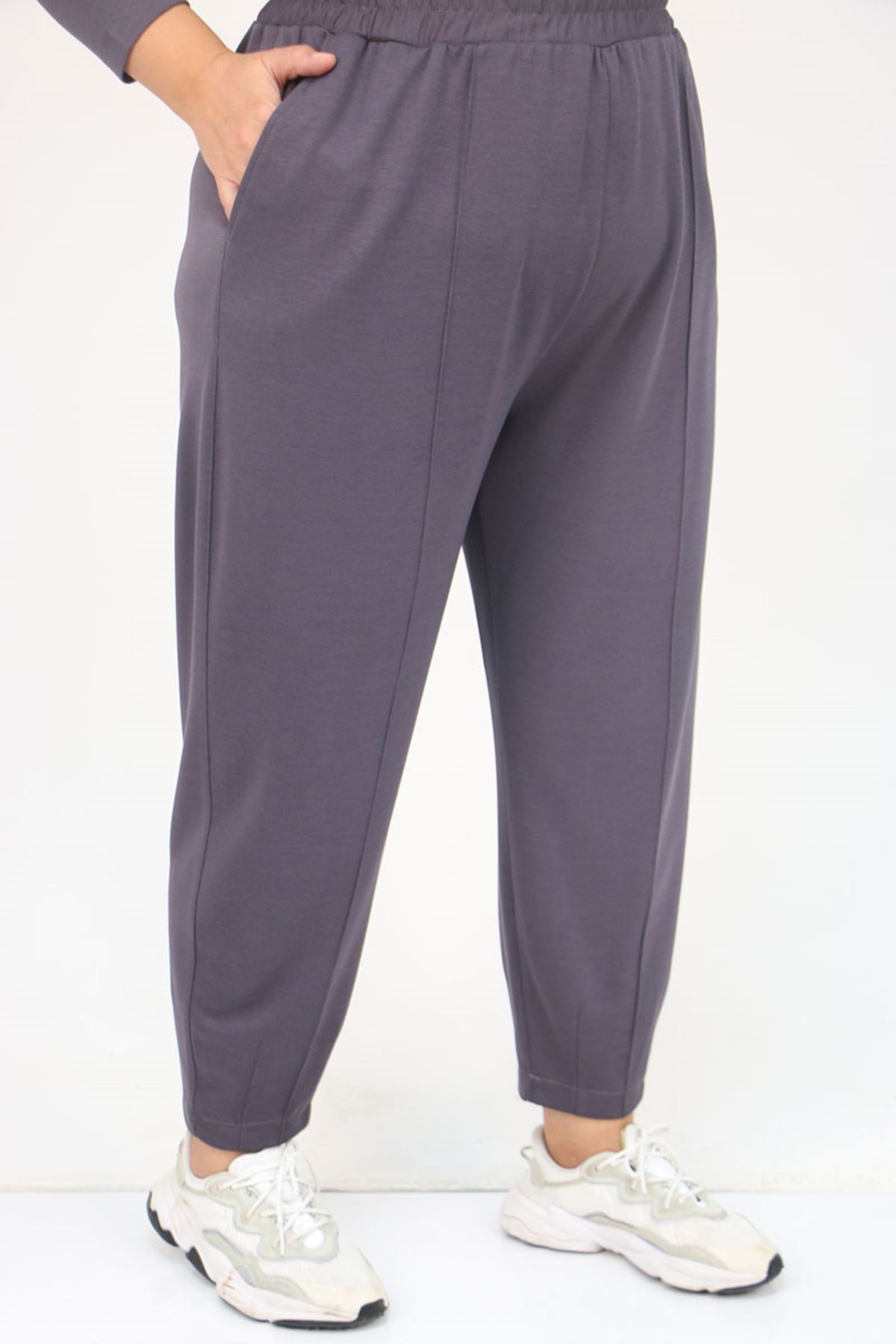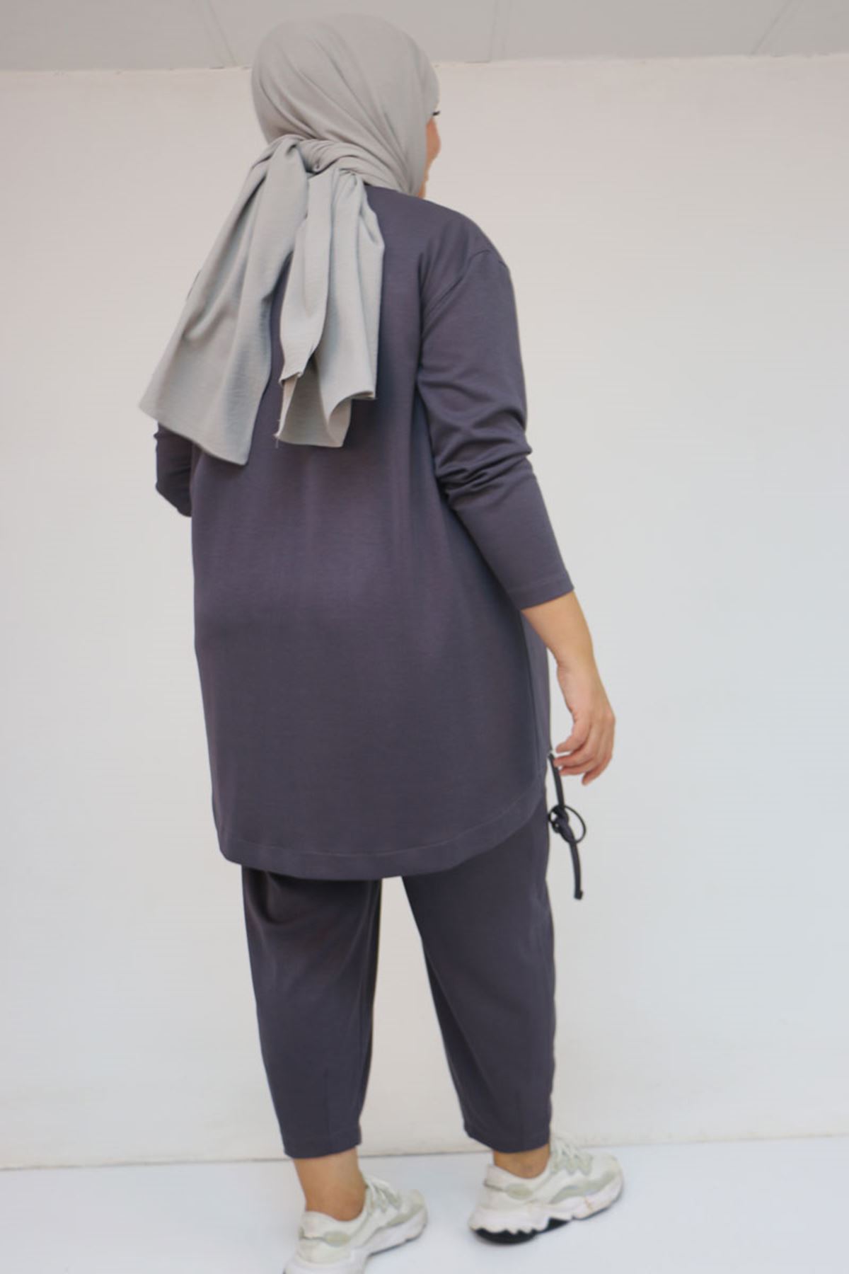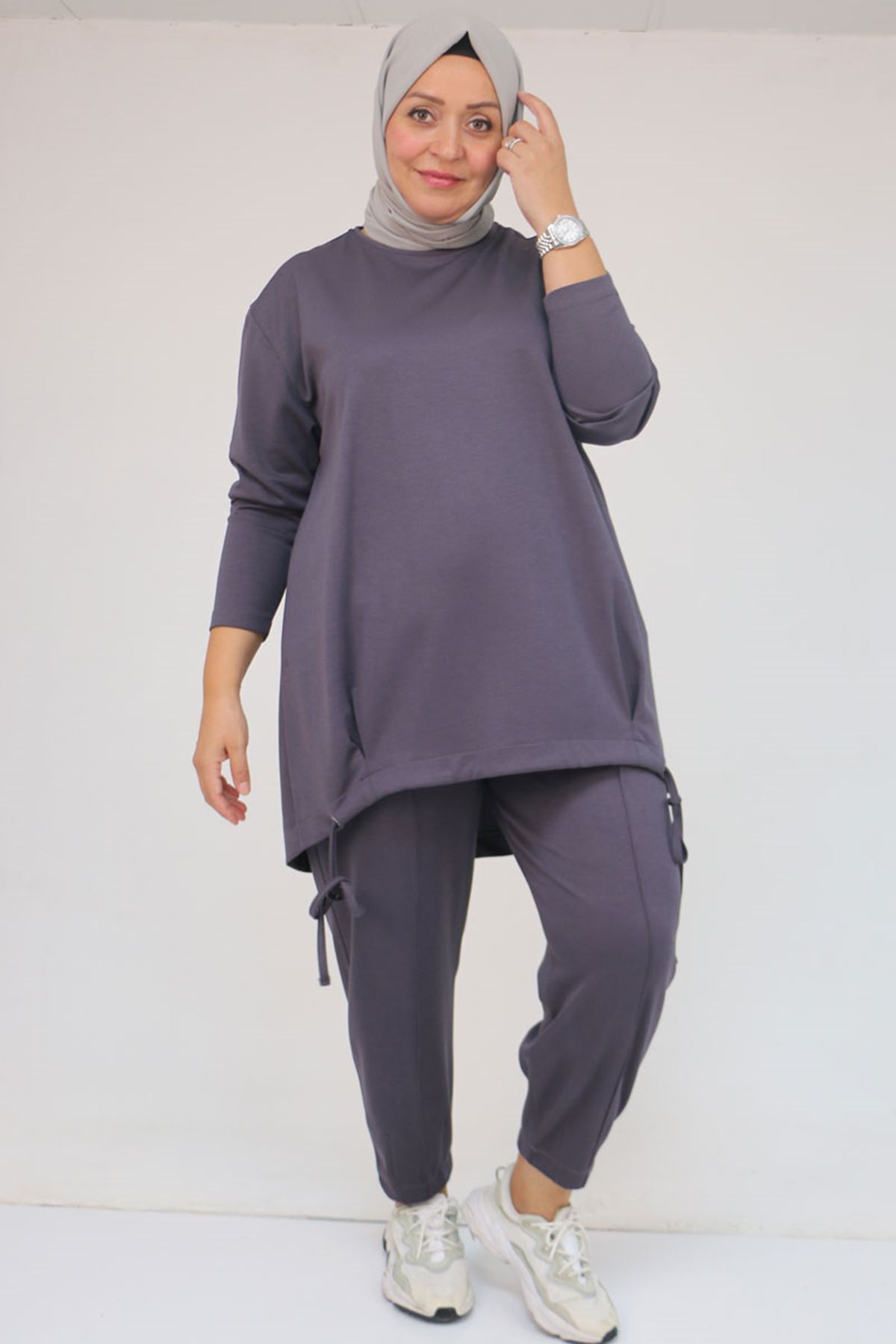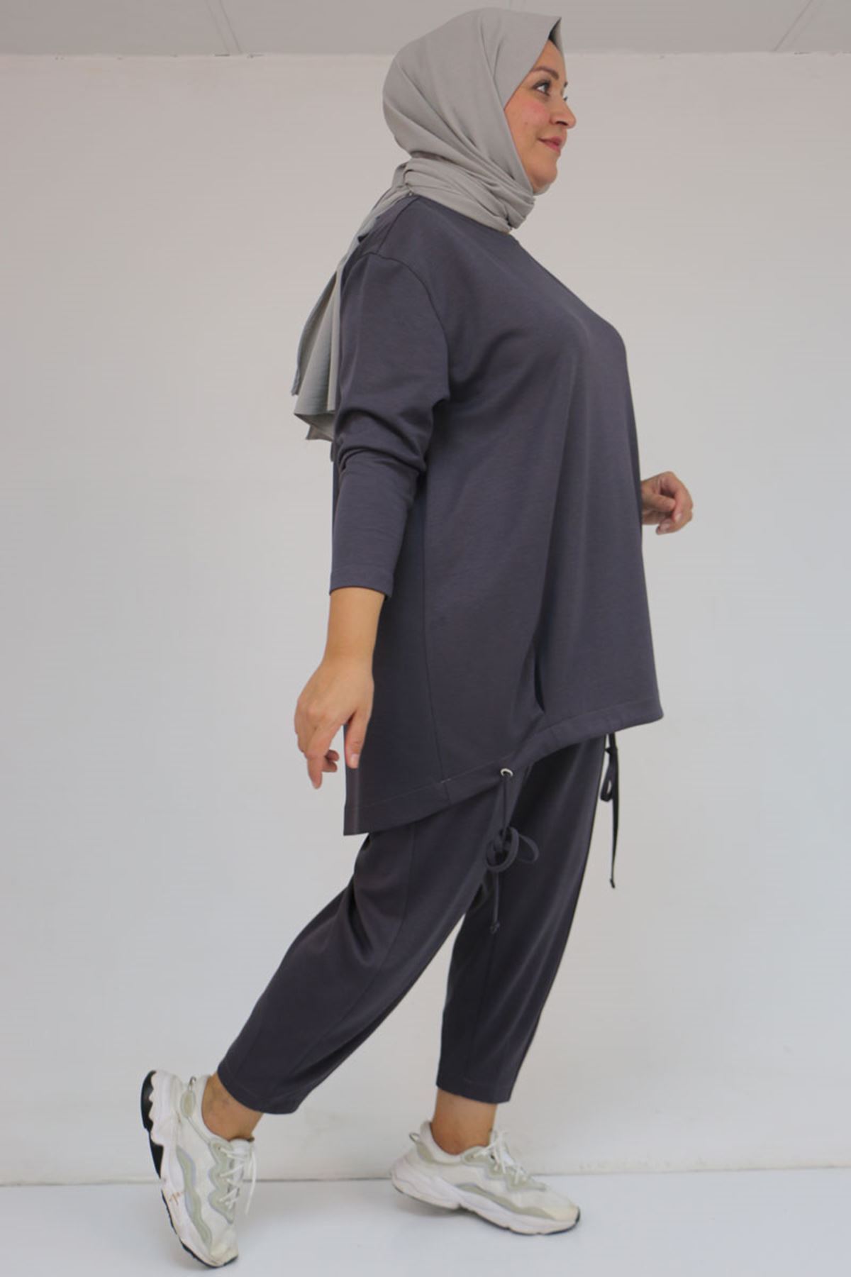 57045 Büyük Beden Önü Bağlama İp Detaylı Modal Pantolonlu Takım - Antrasit