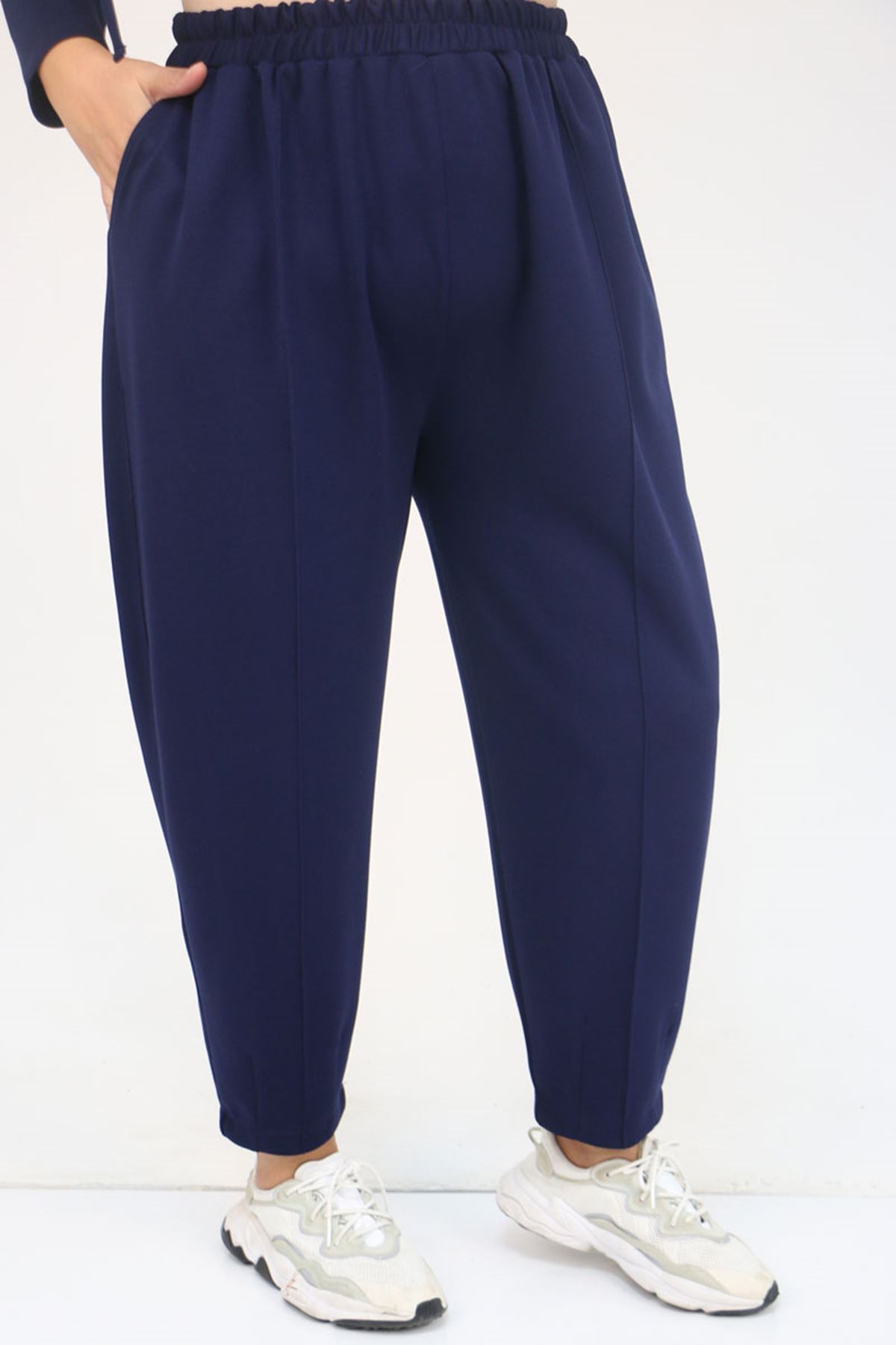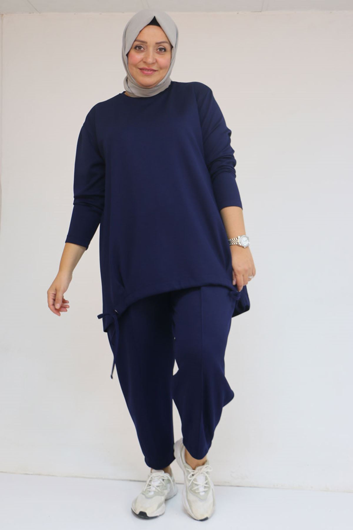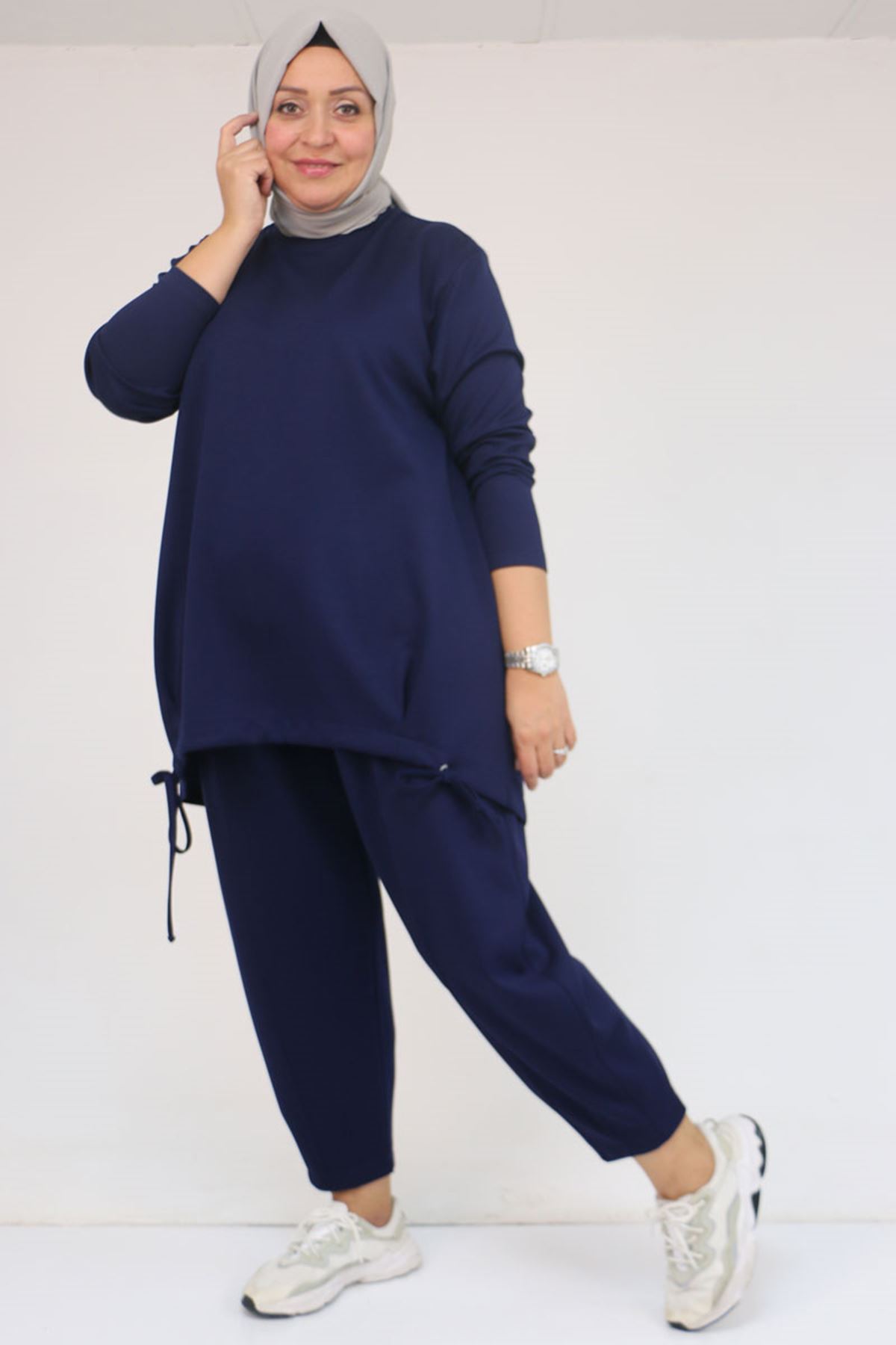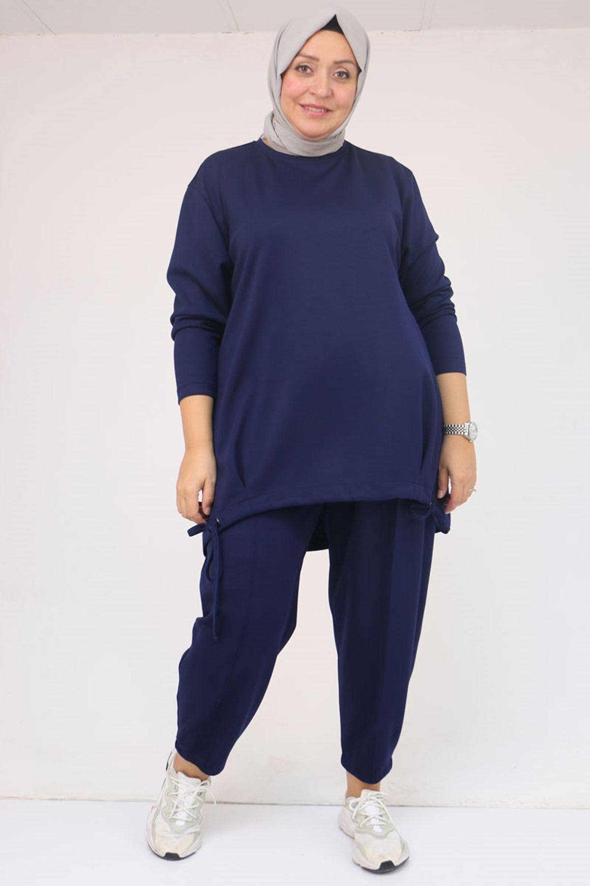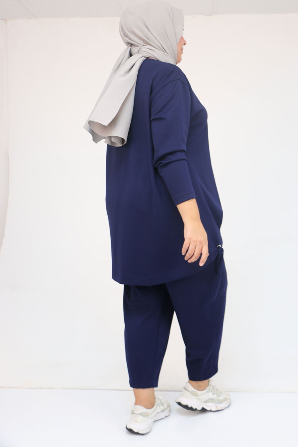 57045 Büyük Beden Önü Bağlama İp Detaylı Modal Pantolonlu Takım - İndigo