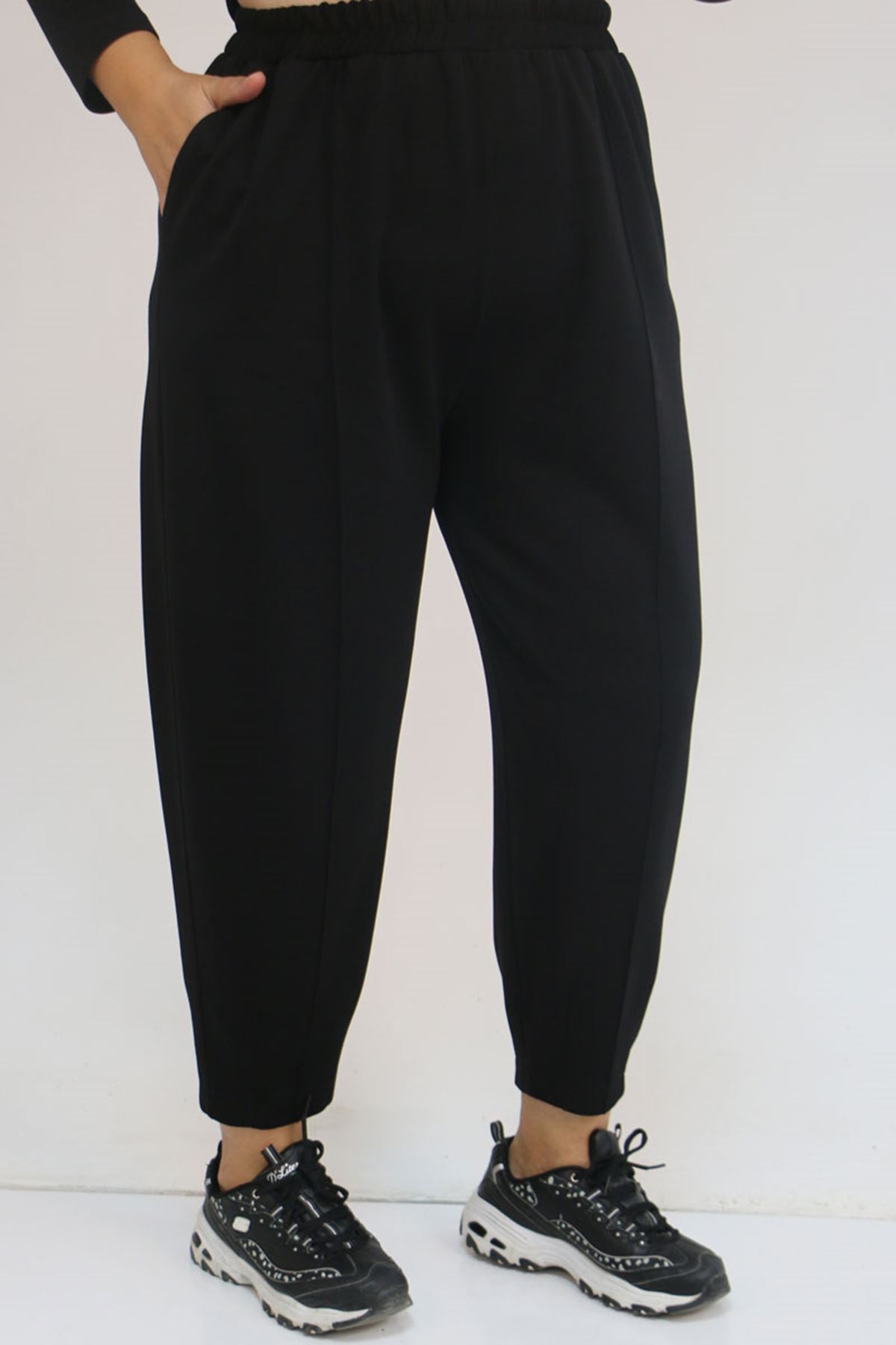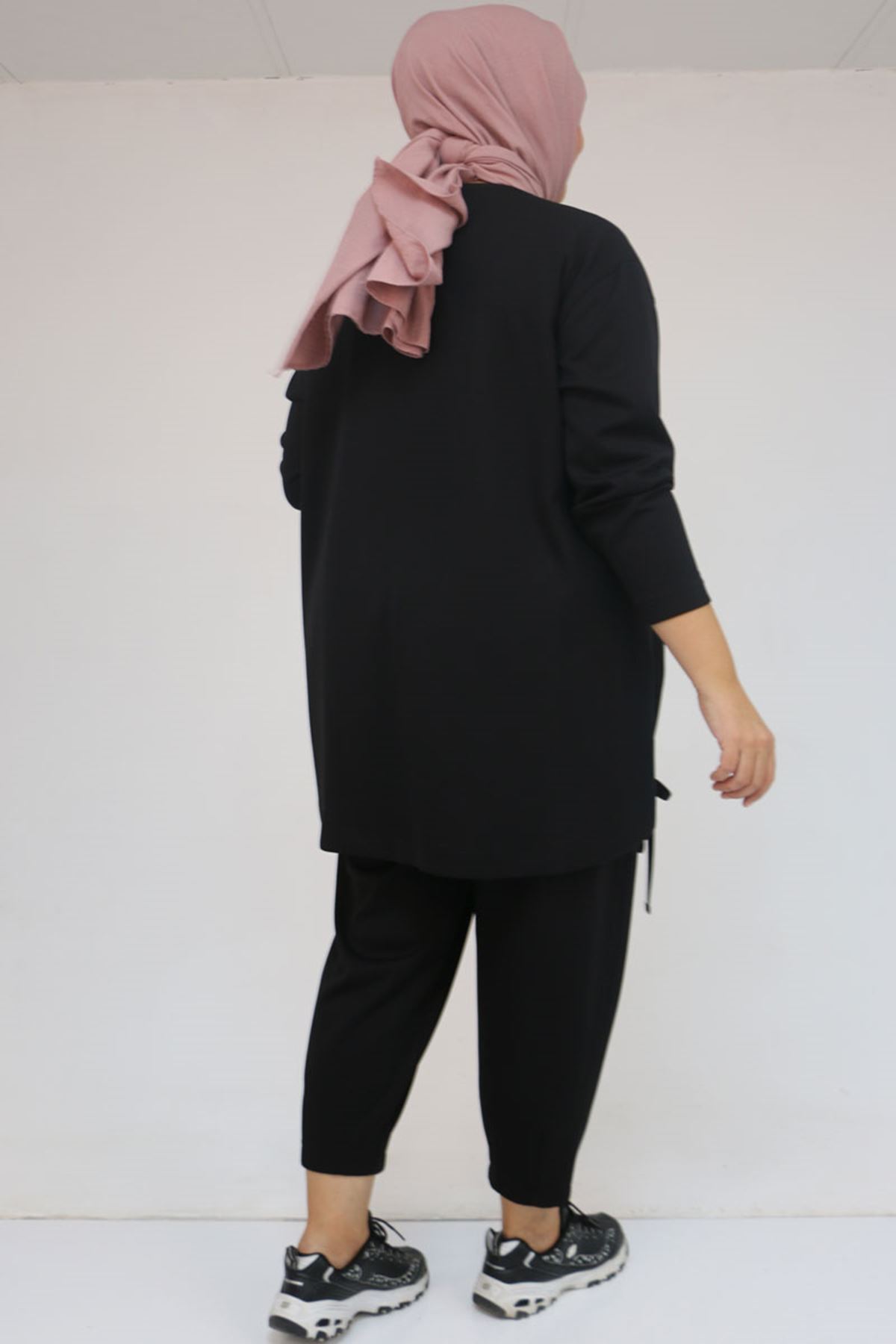 57045 Büyük Beden Önü Bağlama İp Detaylı Modal Pantolonlu Takım - Siyah