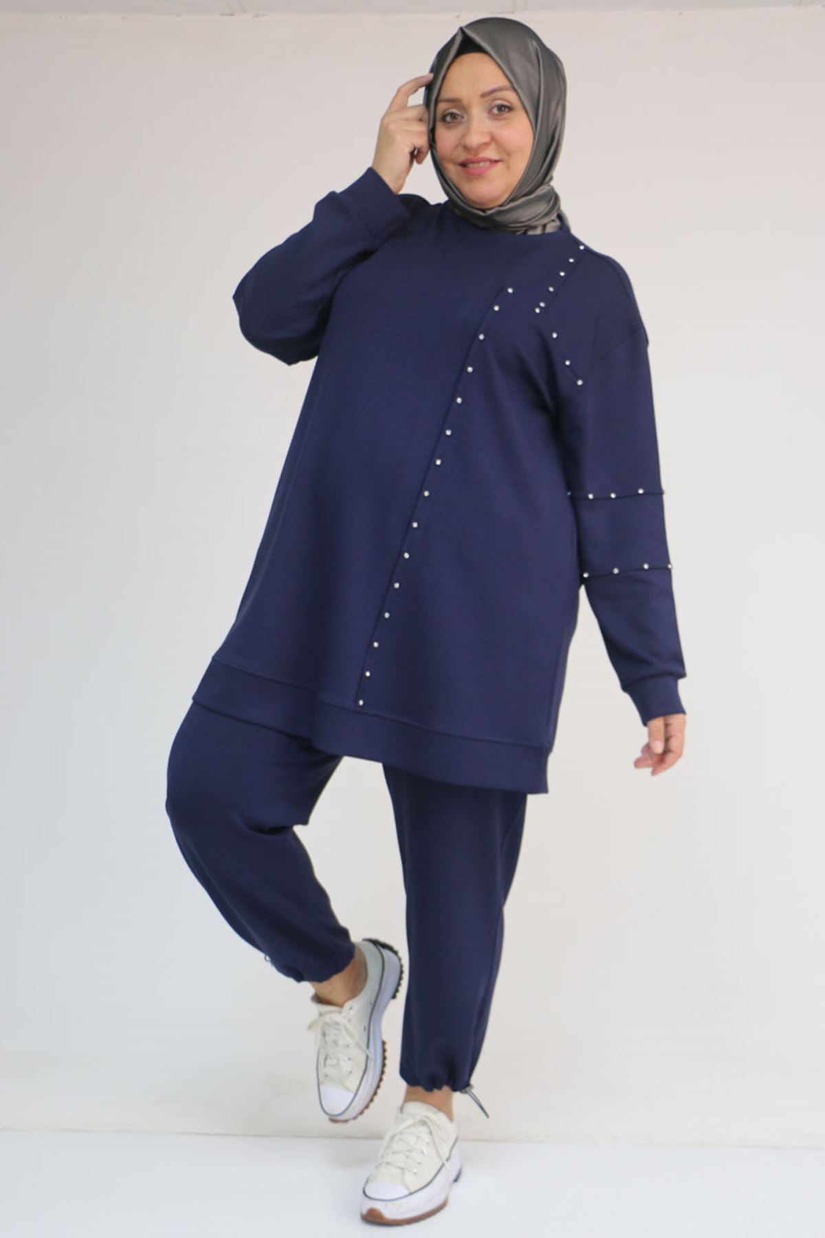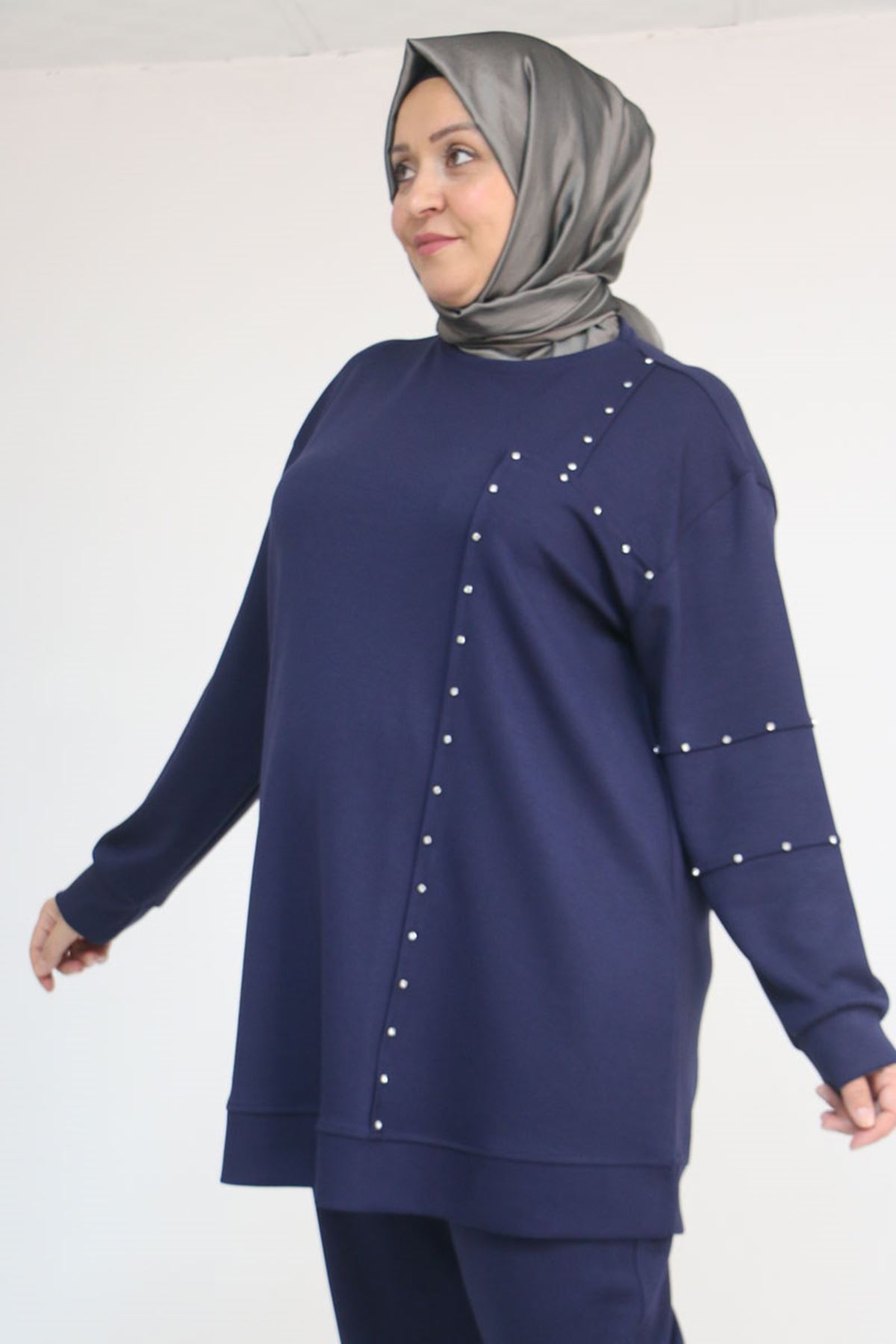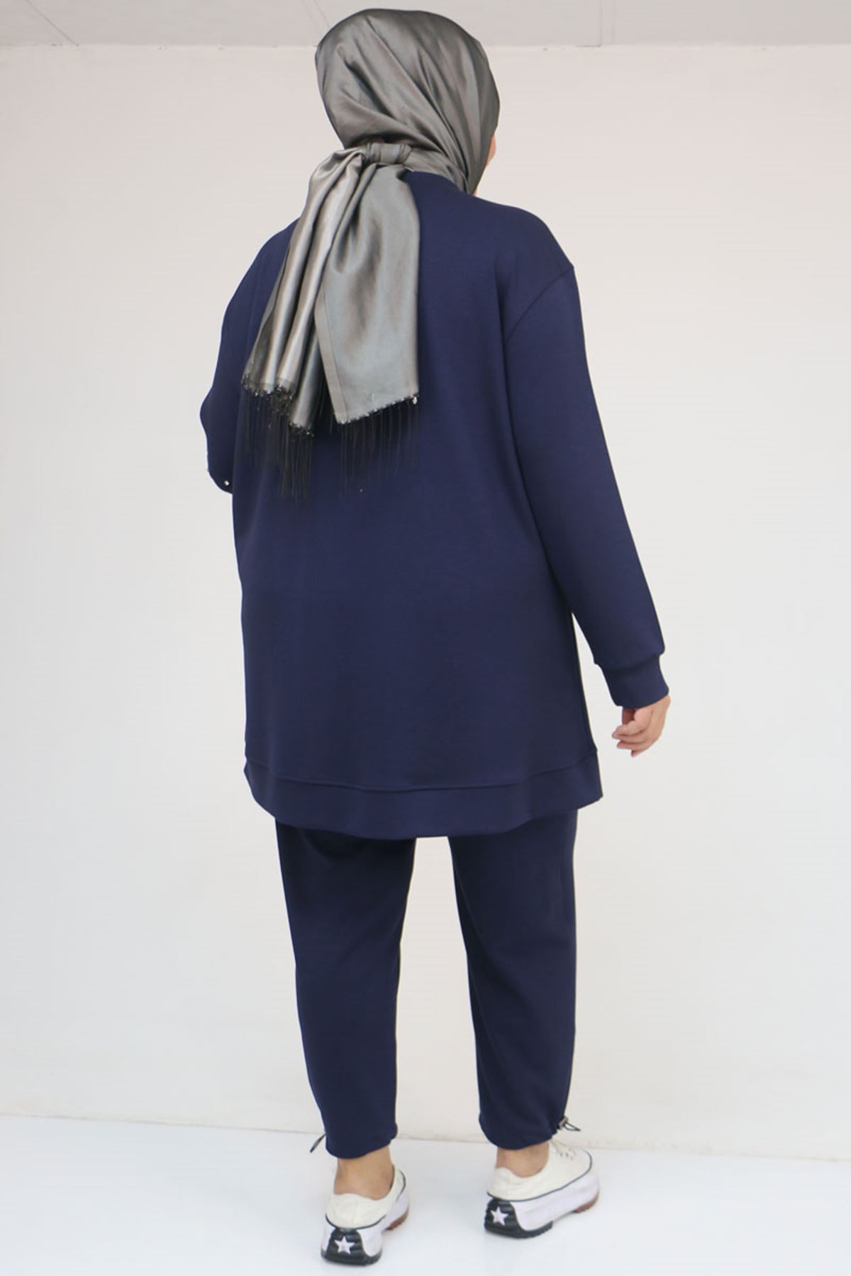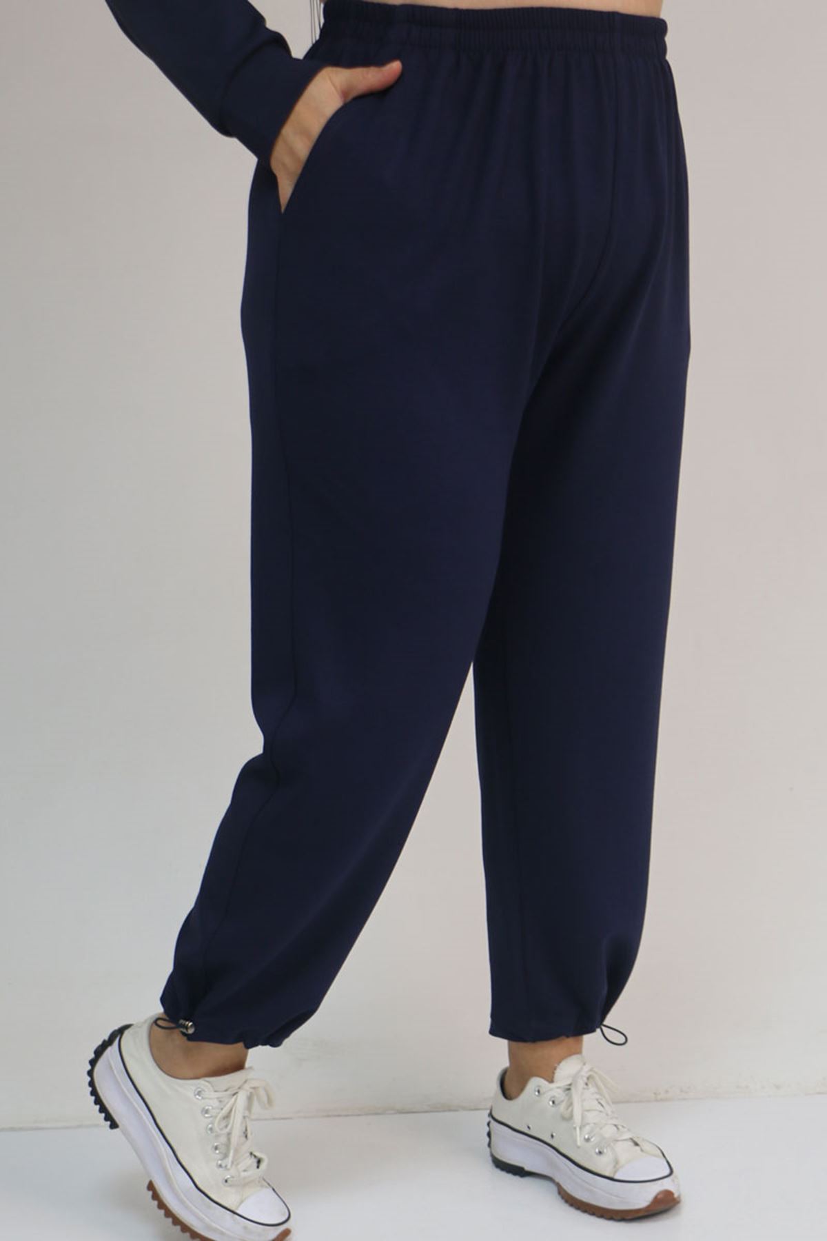 57052 Büyük Beden Pantolon Paçası Lastikli İkili Modal Takım - İndigo