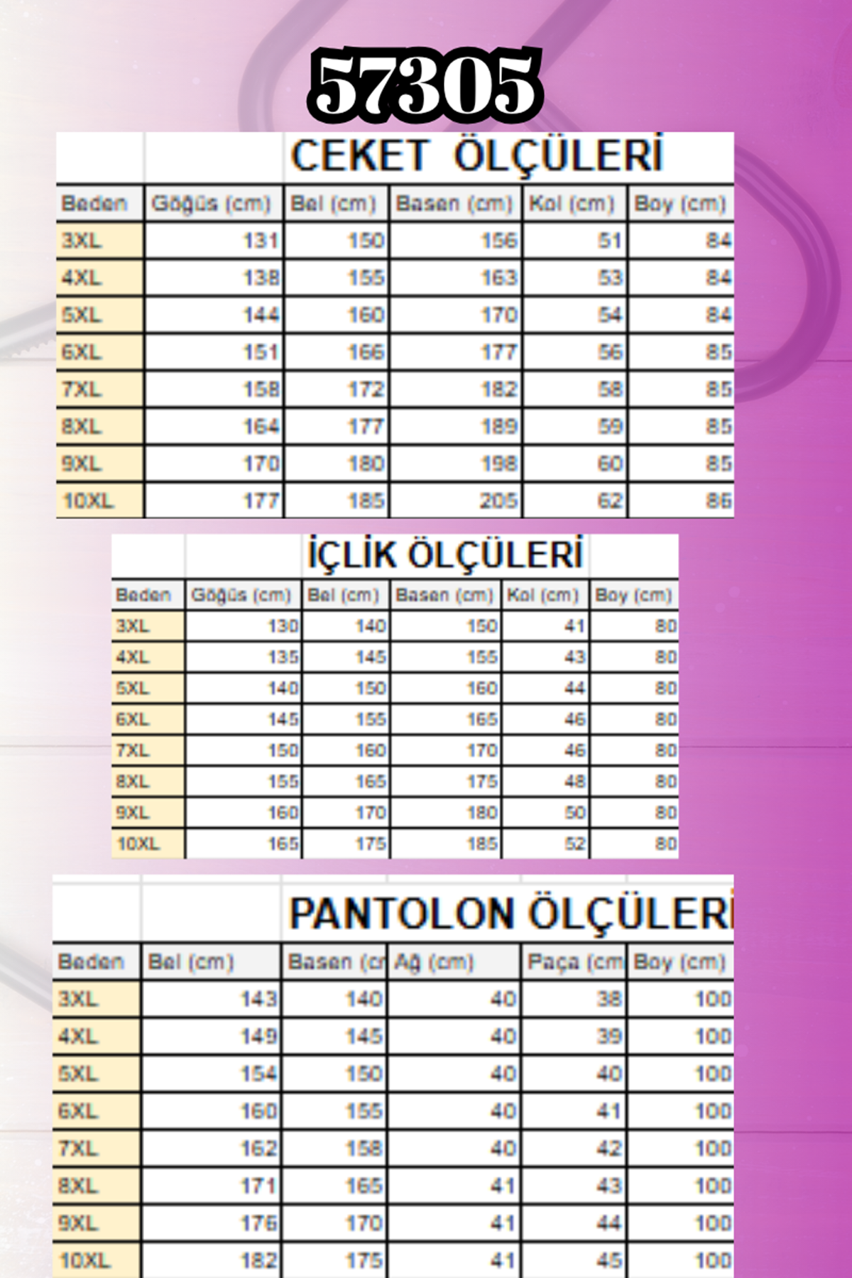 BEL GENİŞLİĞİ :88 cm GÖĞÜS GENİŞLİĞİ :103 cm BASEN :116 cm