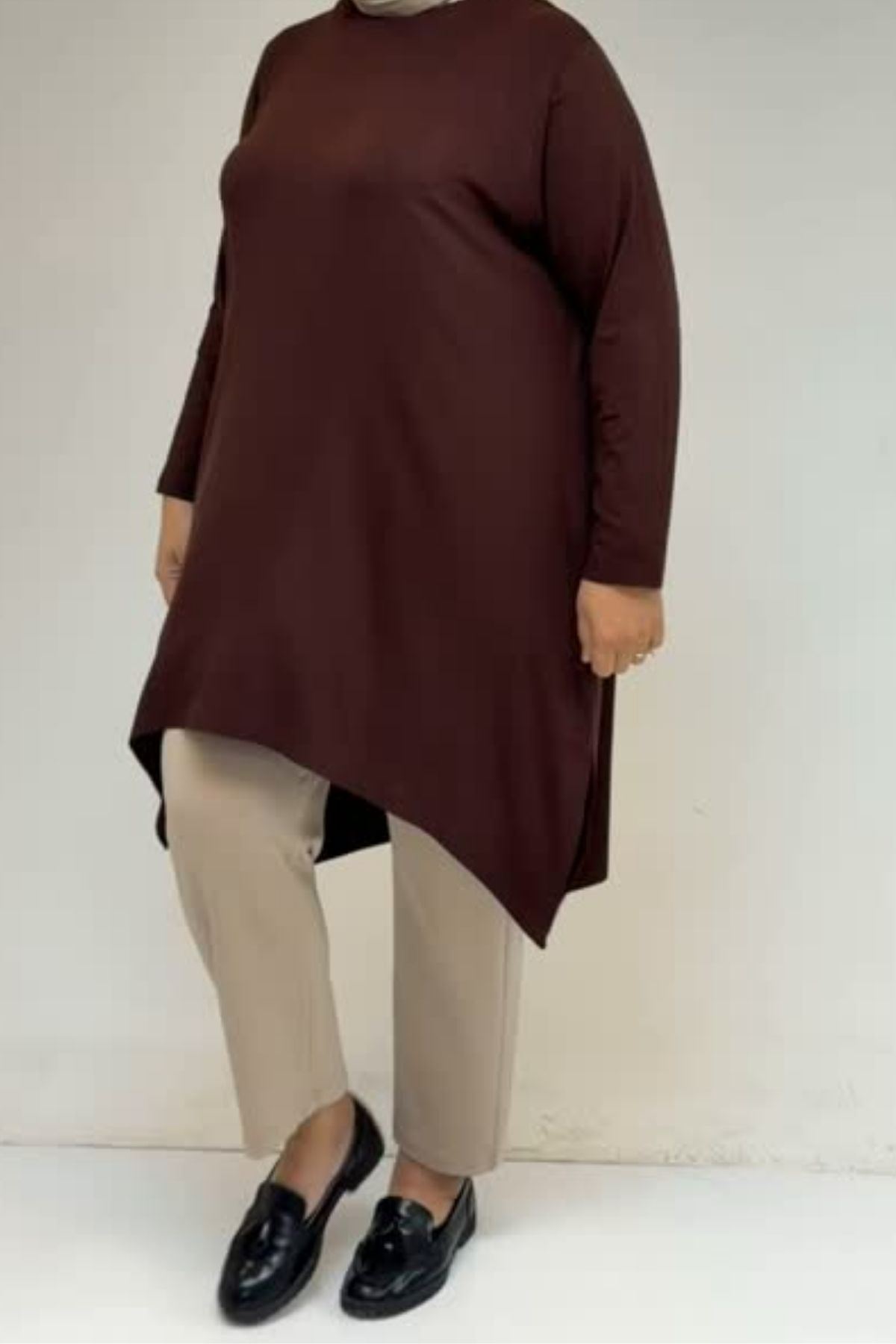 58070 Büyük Beden Asimetrik Kesim Penye Tunik - Kahve
