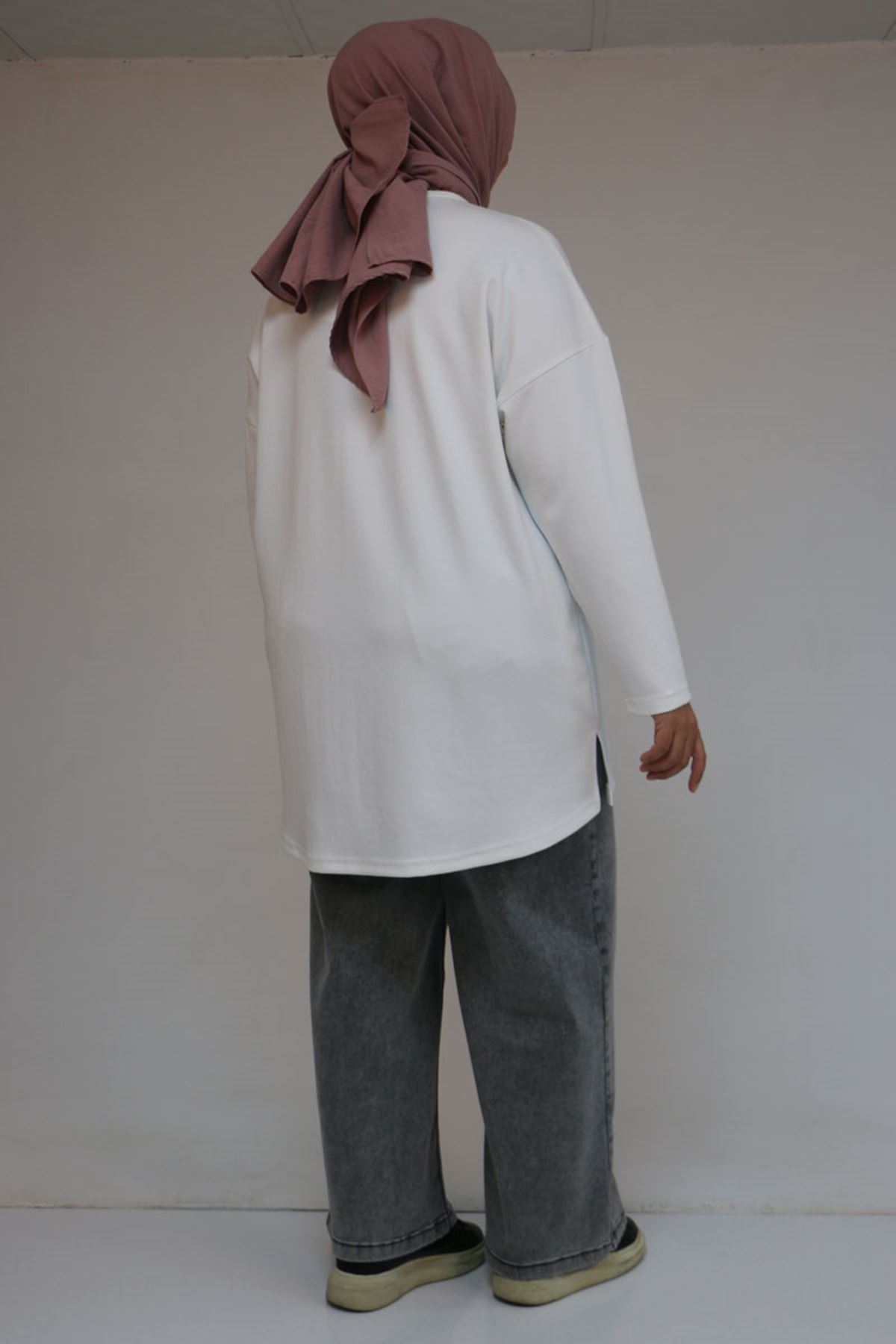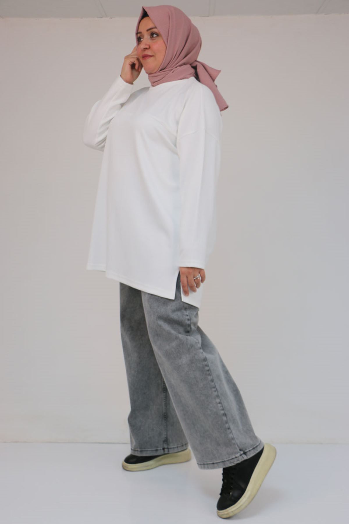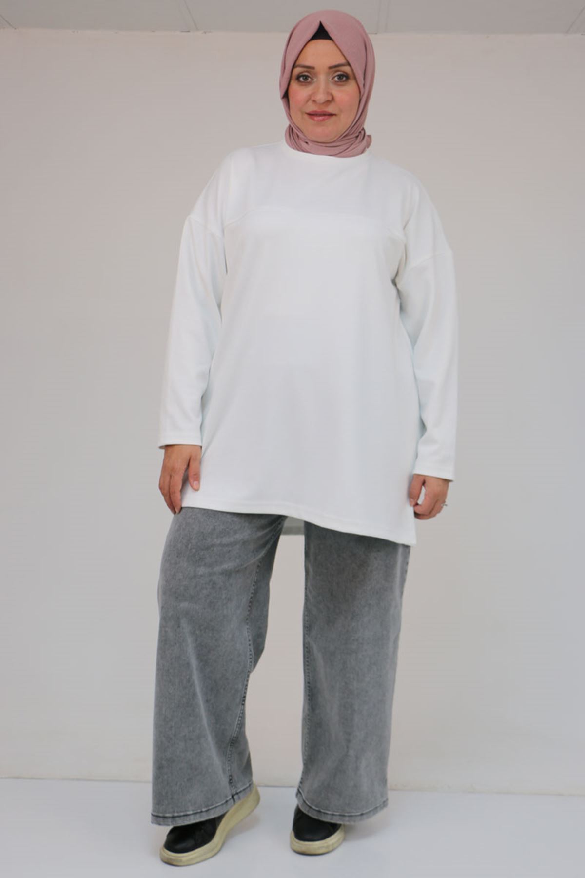 58132 Büyük Beden Önü Çıma Detaylı Yanı Yırtmaçlı Modal Tunik - Ekru