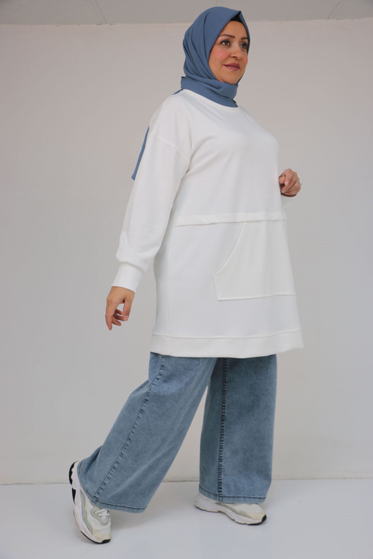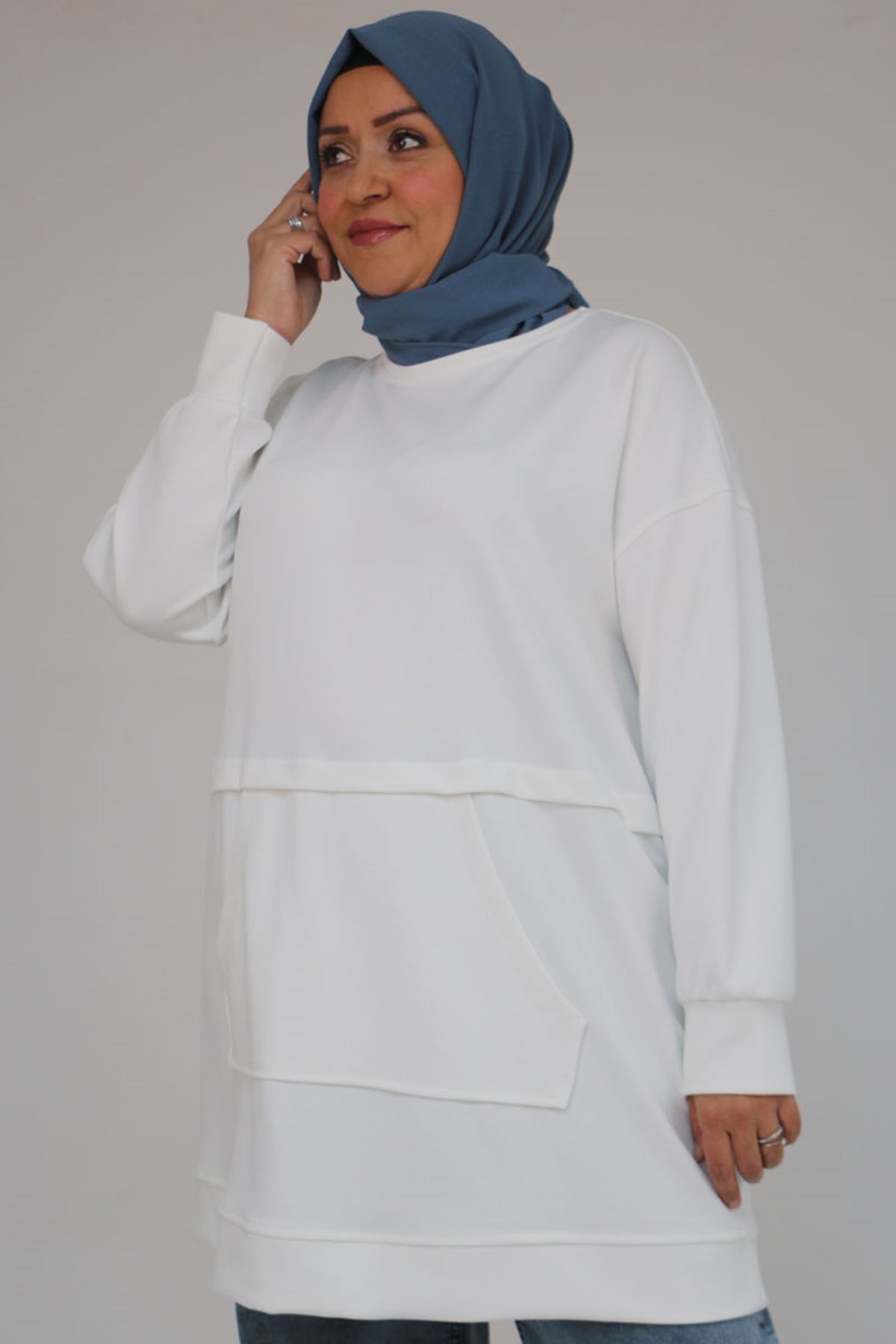 58133 Büyük Beden Kanguru Cepli Modal Tunik - Ekru