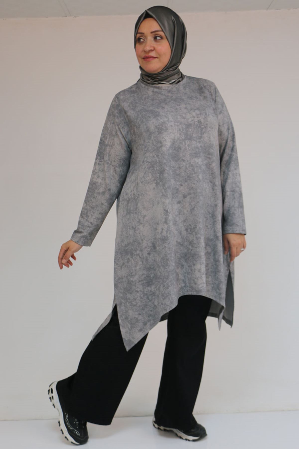 58163 Büyük Beden Eteği Simetri Kesim Batik Tunik - Gri