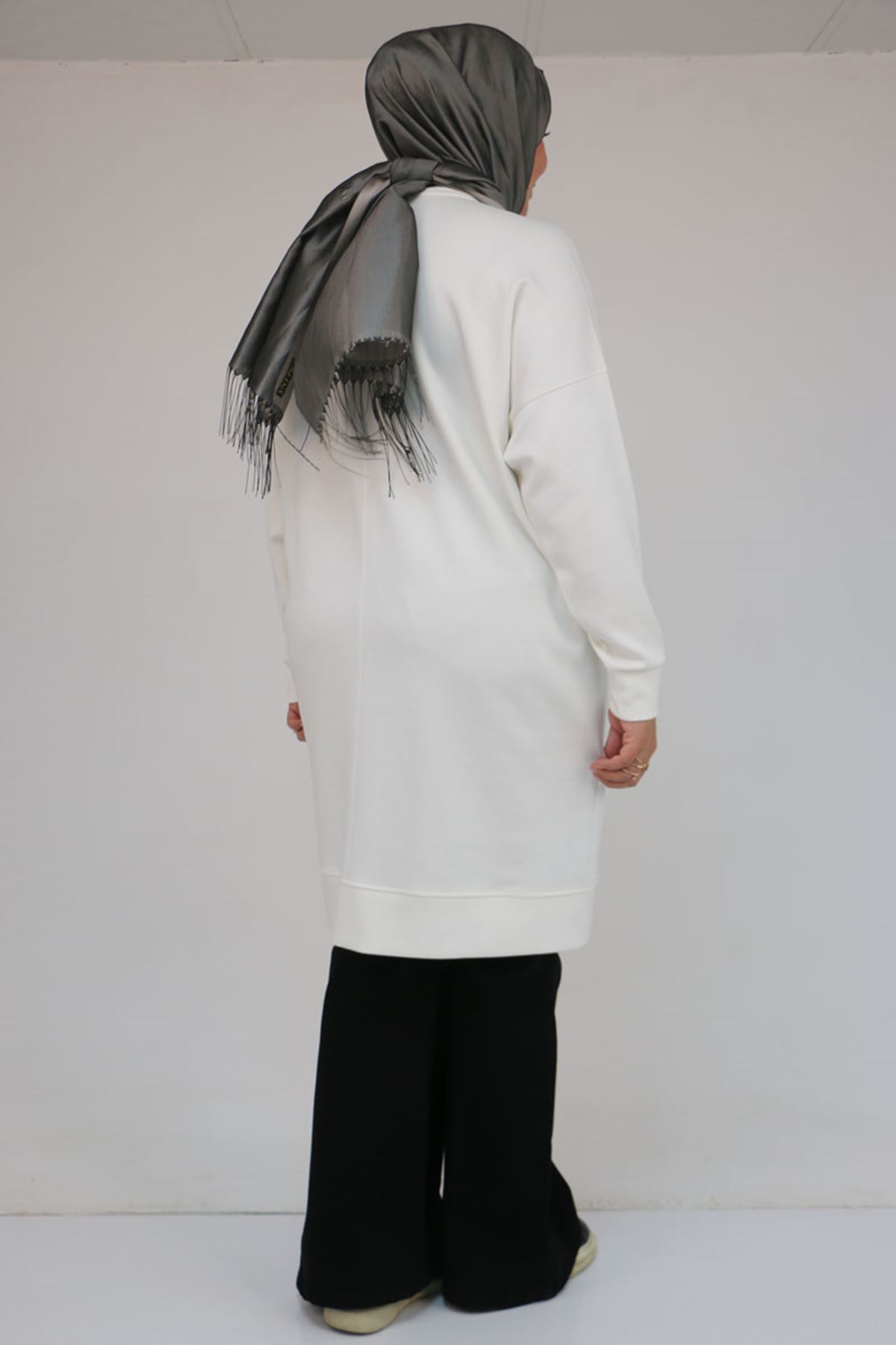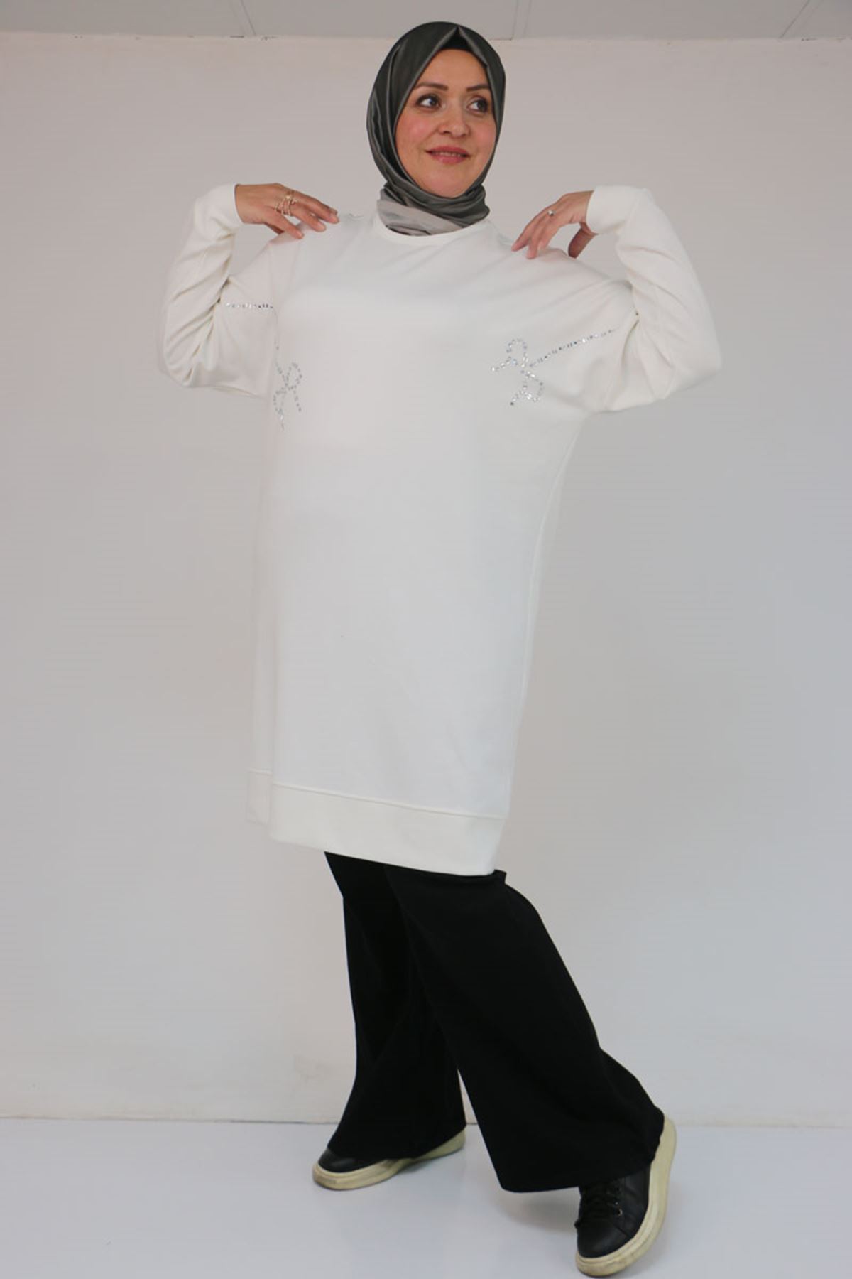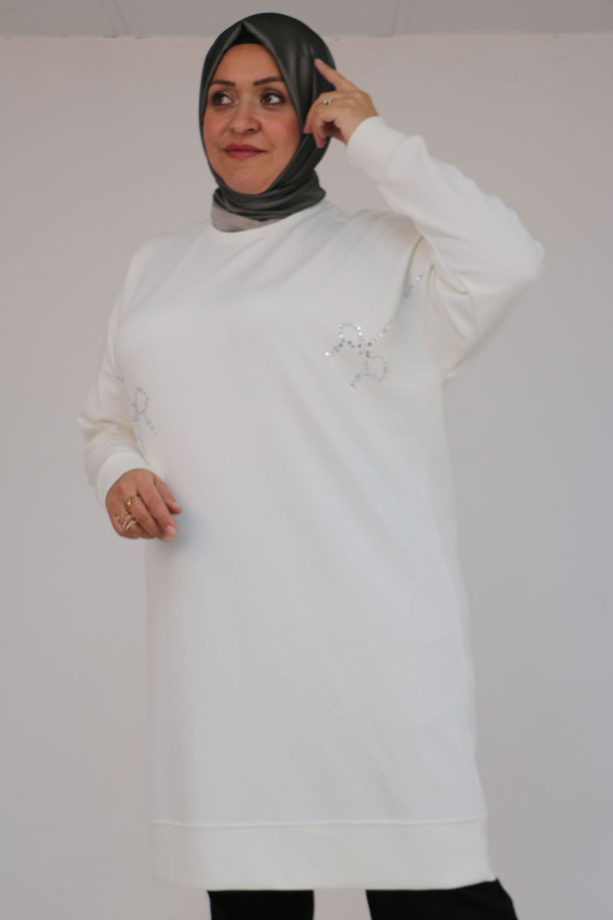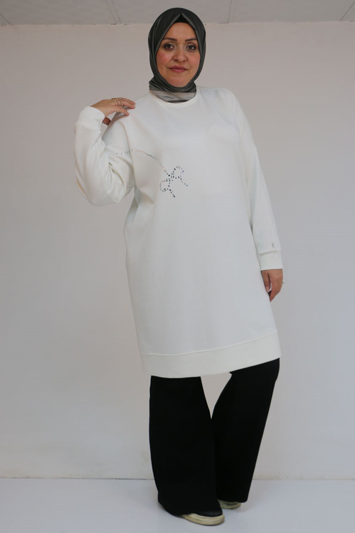 58165 Büyük Beden Taş Baskı Detaylı Modal Tunik - Ekru
