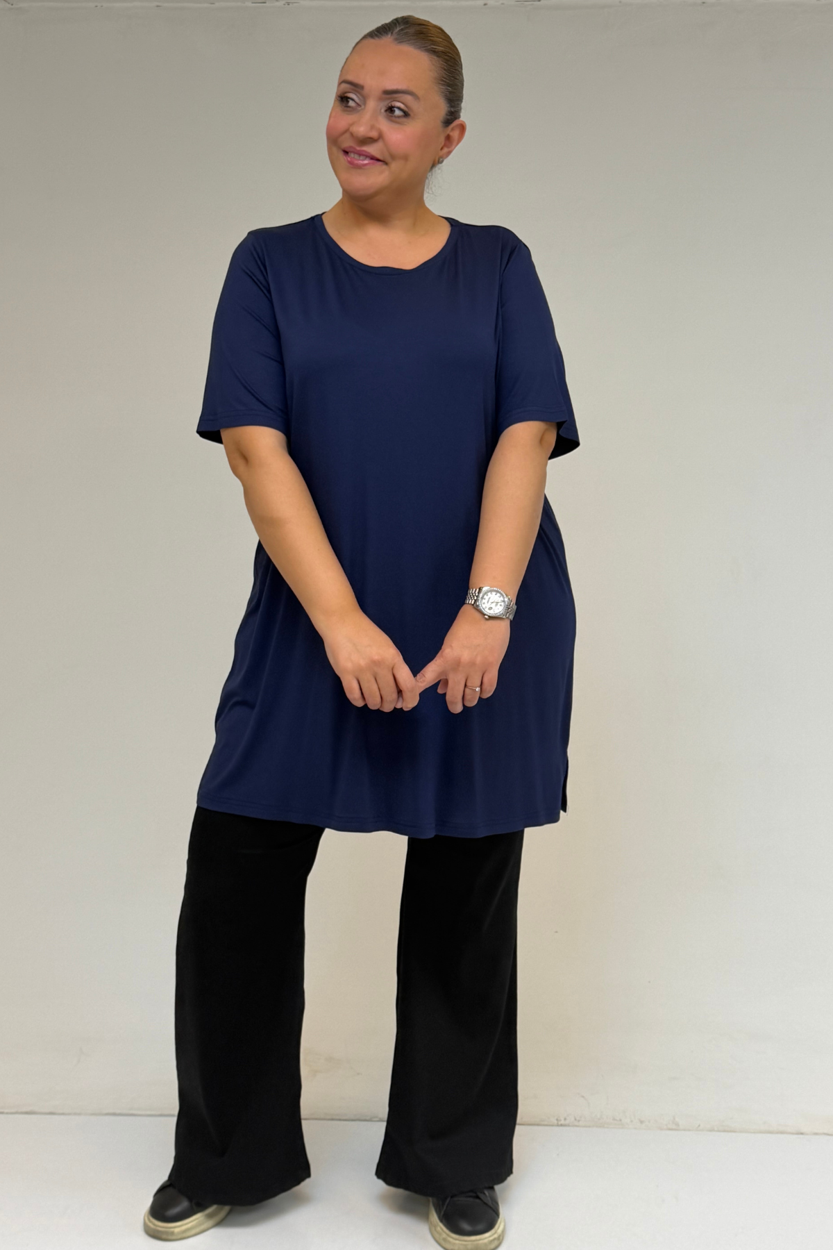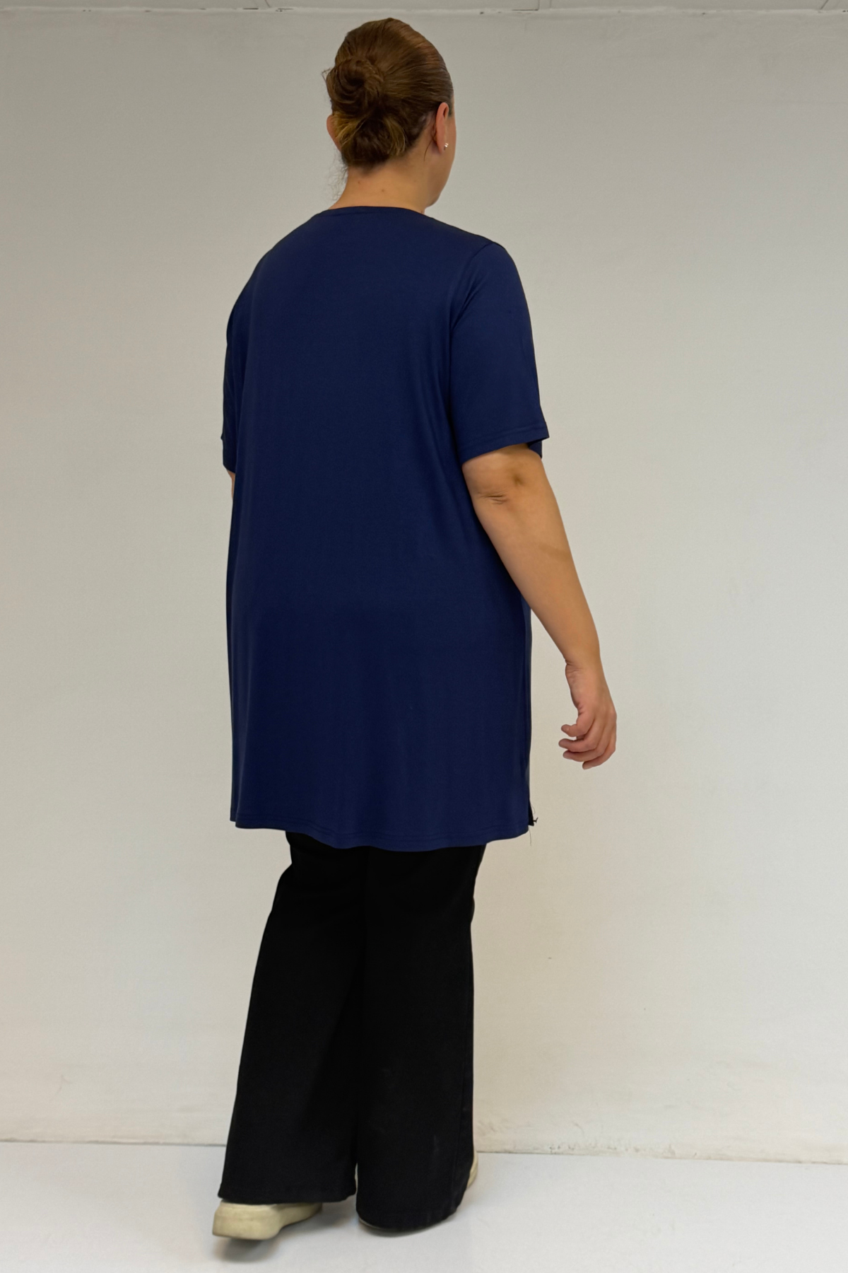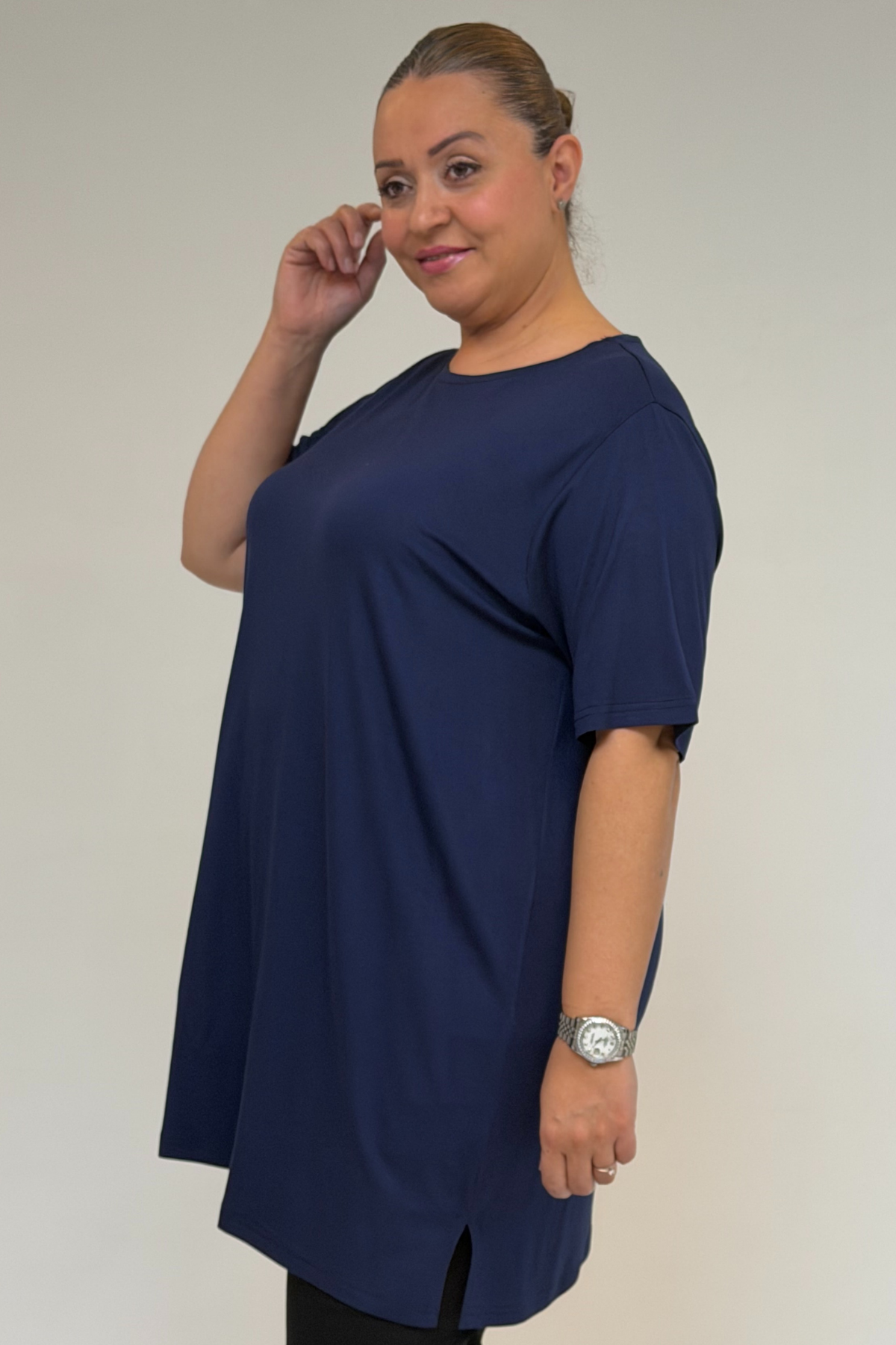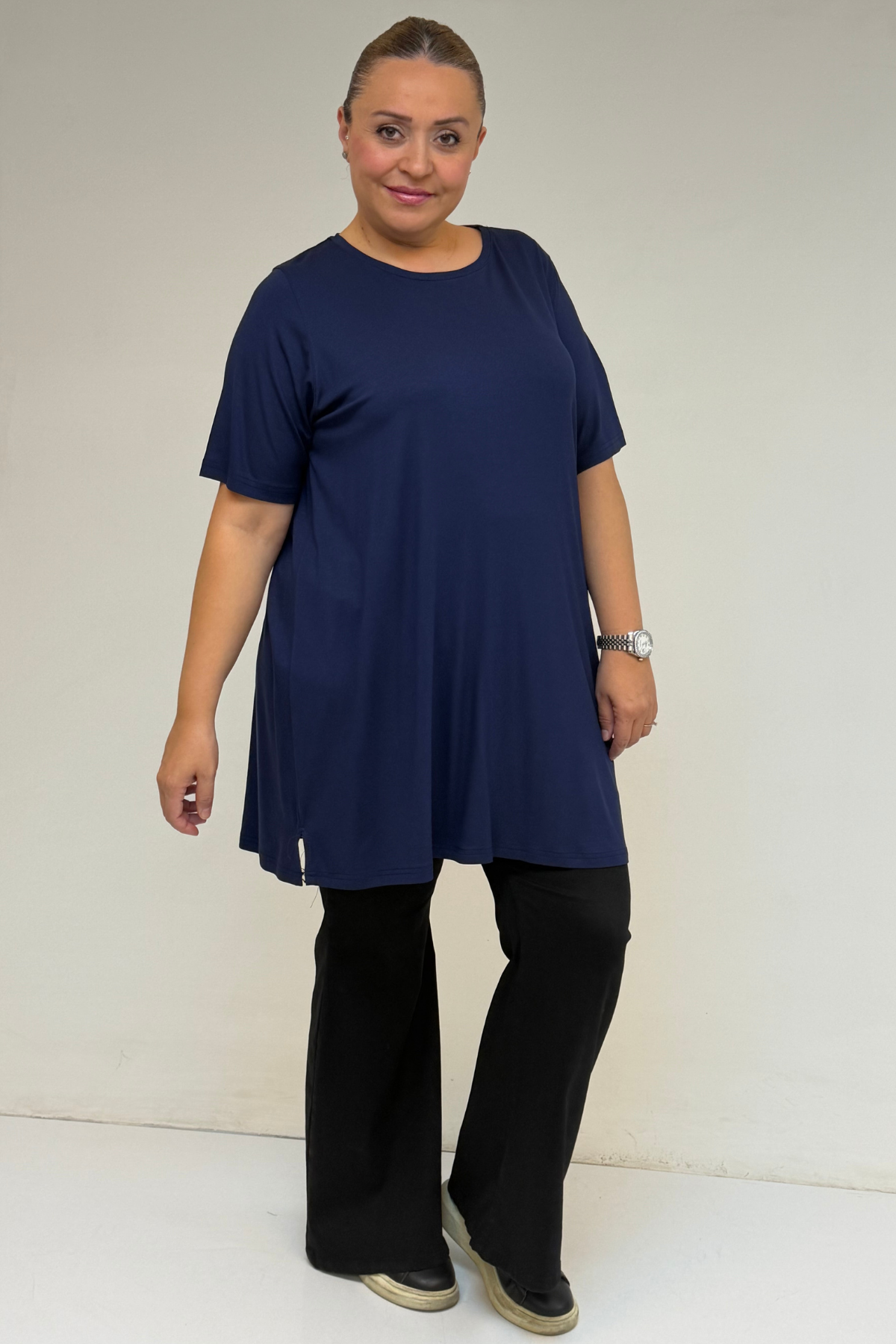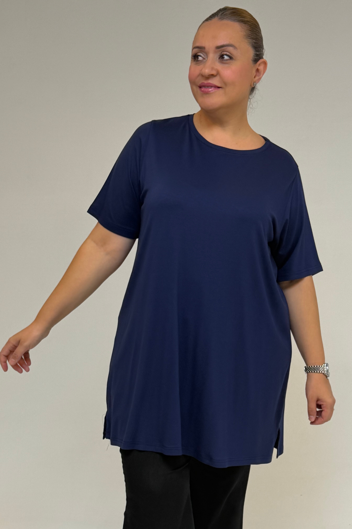 58507 Büyük Beden Yakası Biyeli Penye Tişört - İndigo
