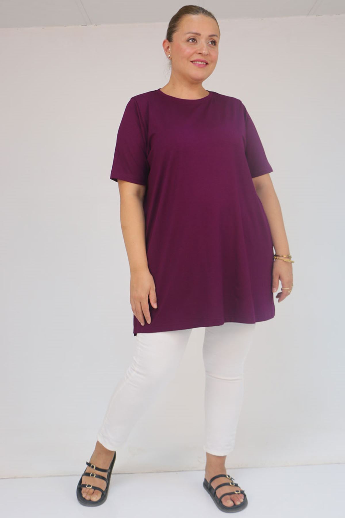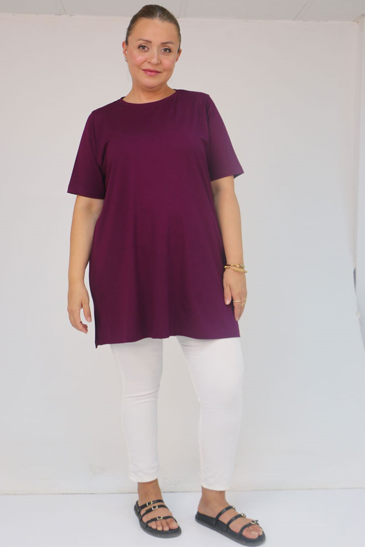 58507 Büyük Beden Yakası Biyeli Penye Tişört - Mürdüm