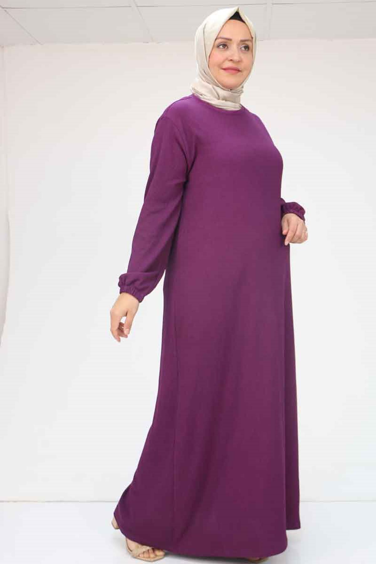 32025 Büyük Beden Bürümcük Kolu Lastikli Elbise - Mürdüm