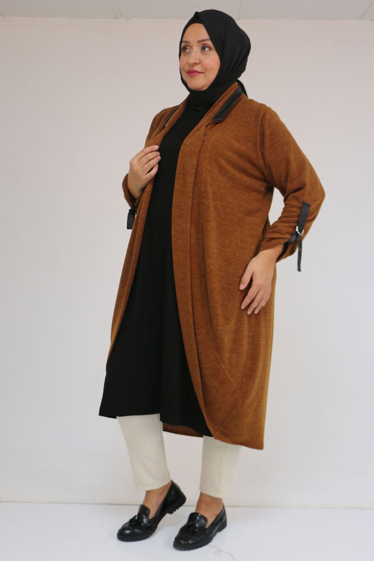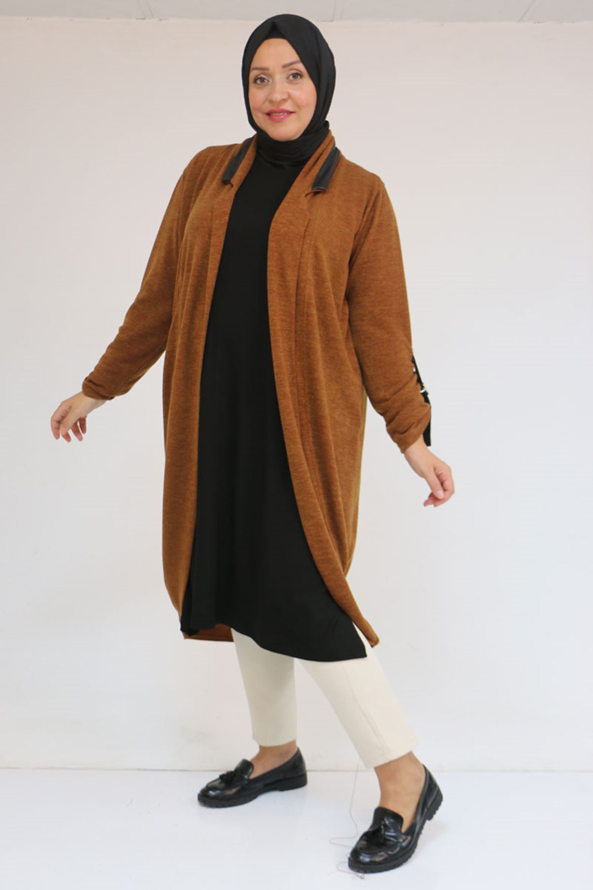 33056 Büyük Beden Petek Triko Waterport Detaylı Ceket -Taba