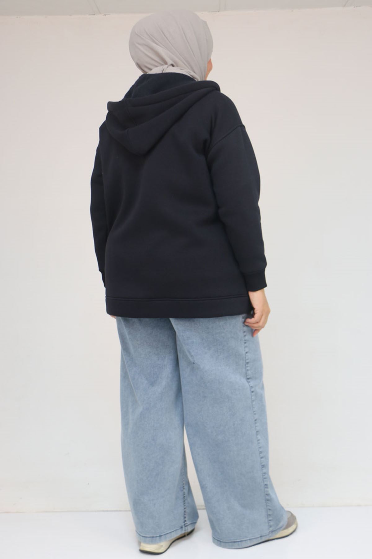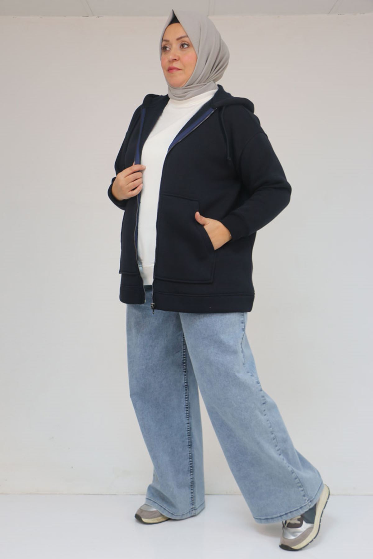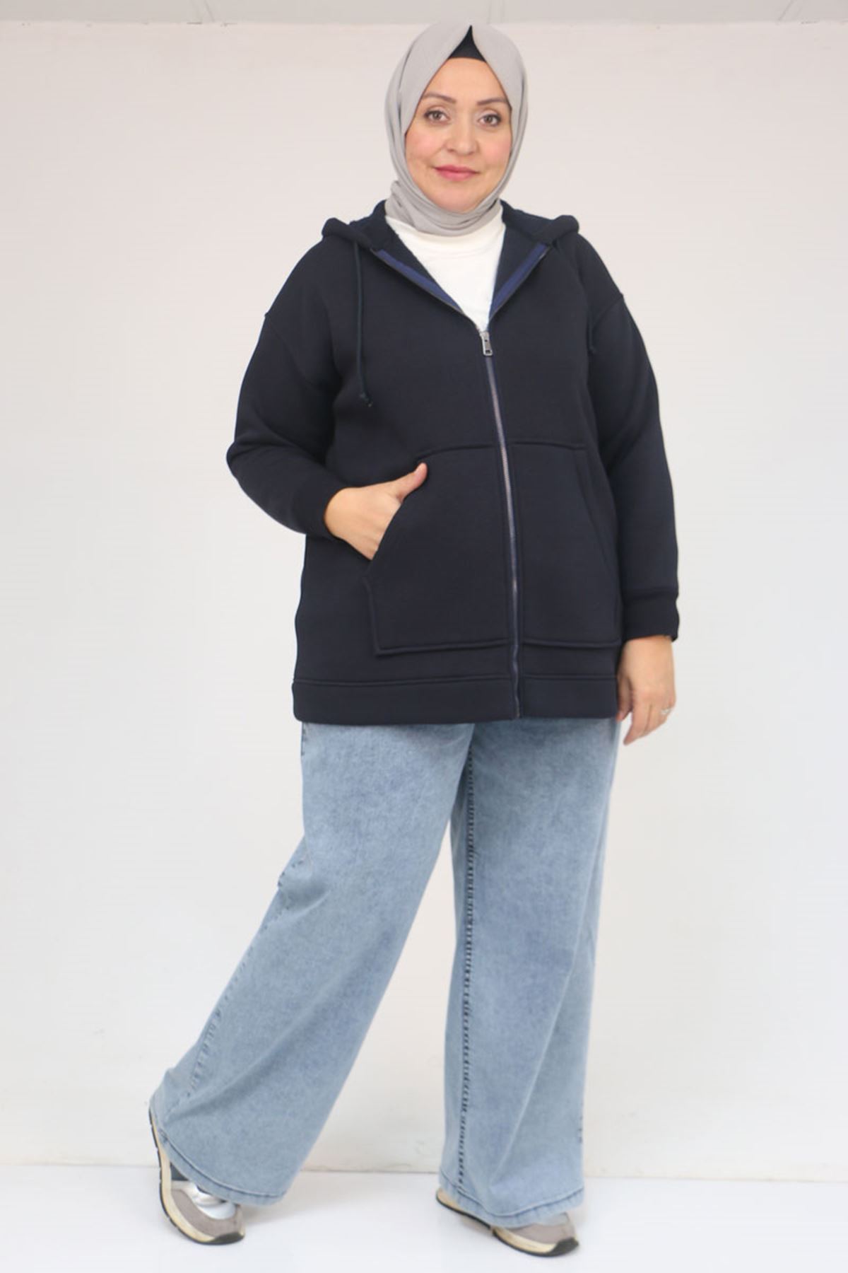 43069 Büyük Beden Eteği Ribanalı Üç İplik Ceket - Lacivert