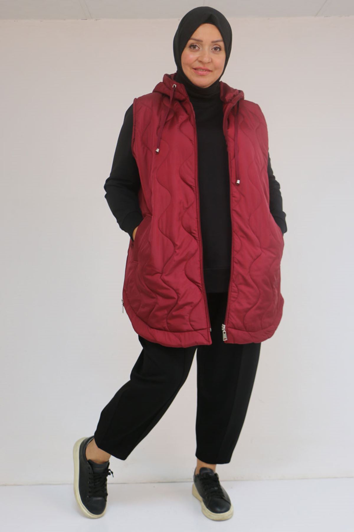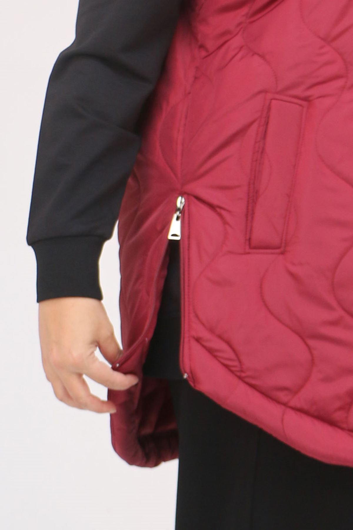 44007 Büyük Beden Yanı Yırtaçlı Oval Kesim Kapitone Yelek - Bordo