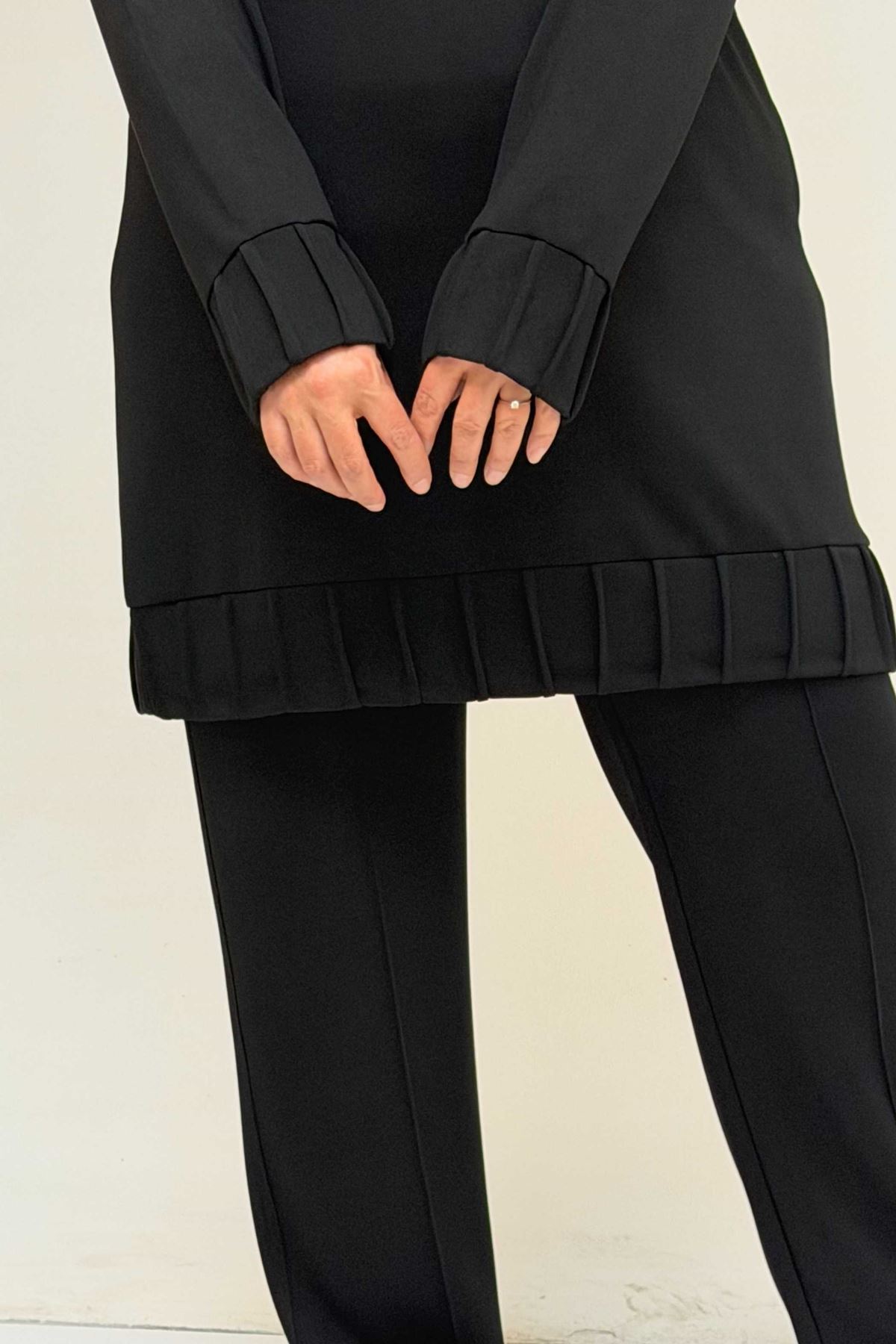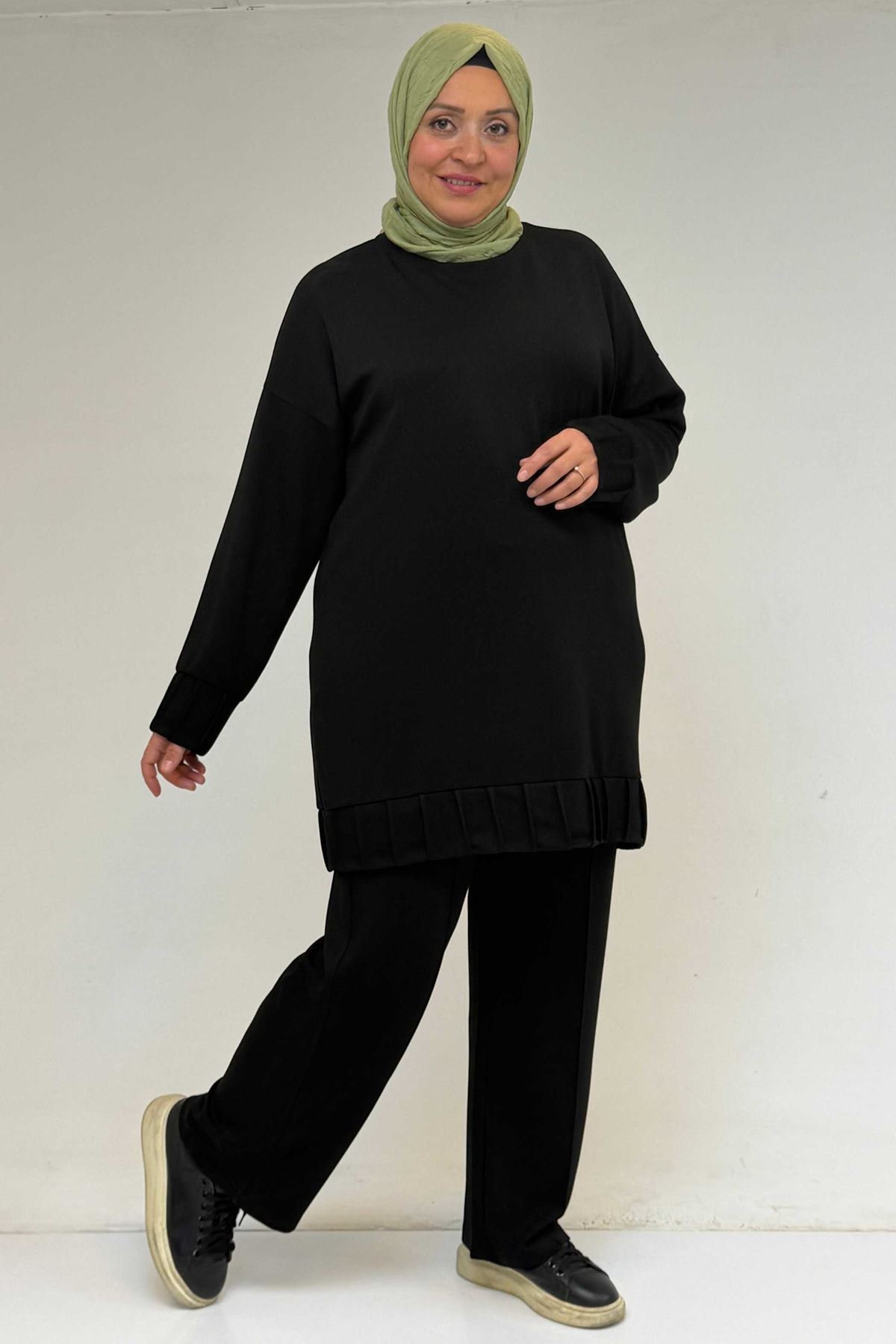 47069 Büyük Beden Çıma Detaylı Modal Pantolonlu Takım - Siyah