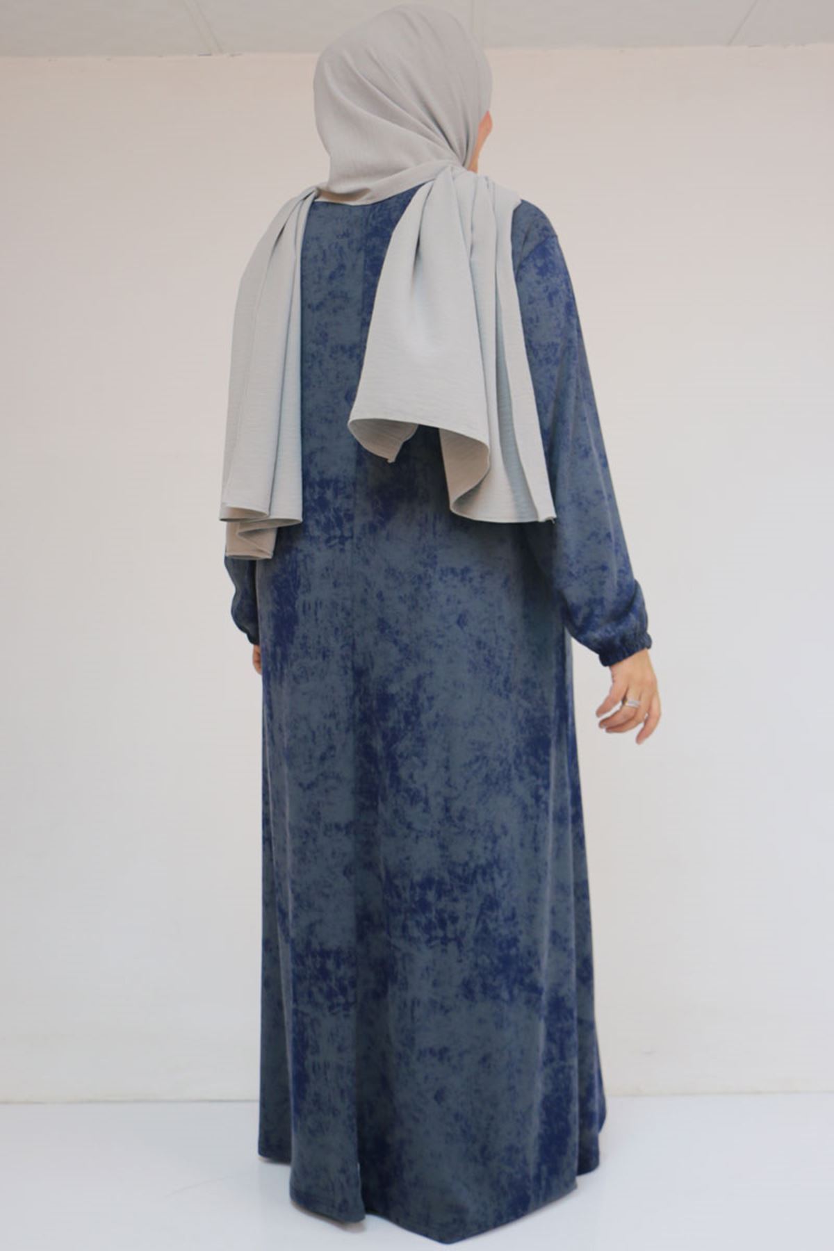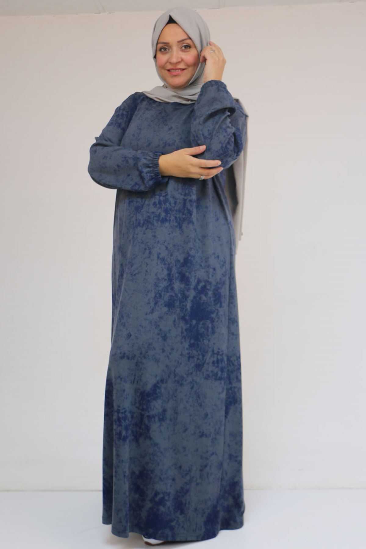 52030 Büyük Beden Kolu Lastikli Modal Elbise - Batik İndigo