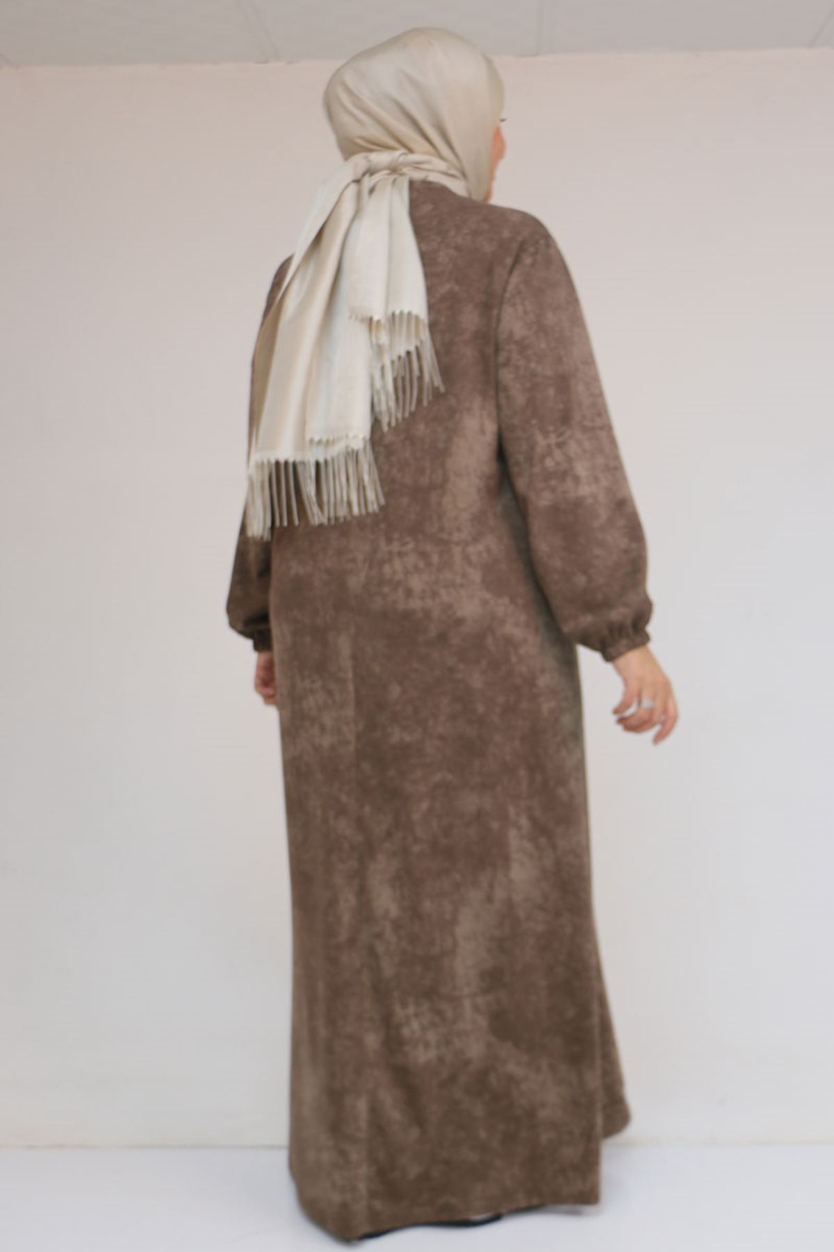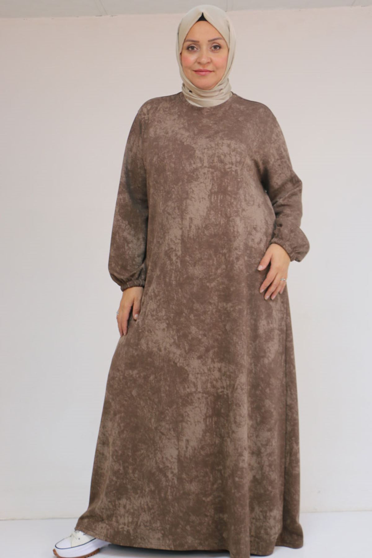 52030 Büyük Beden Kolu Lastikli Modal Elbise - Batik Vizon