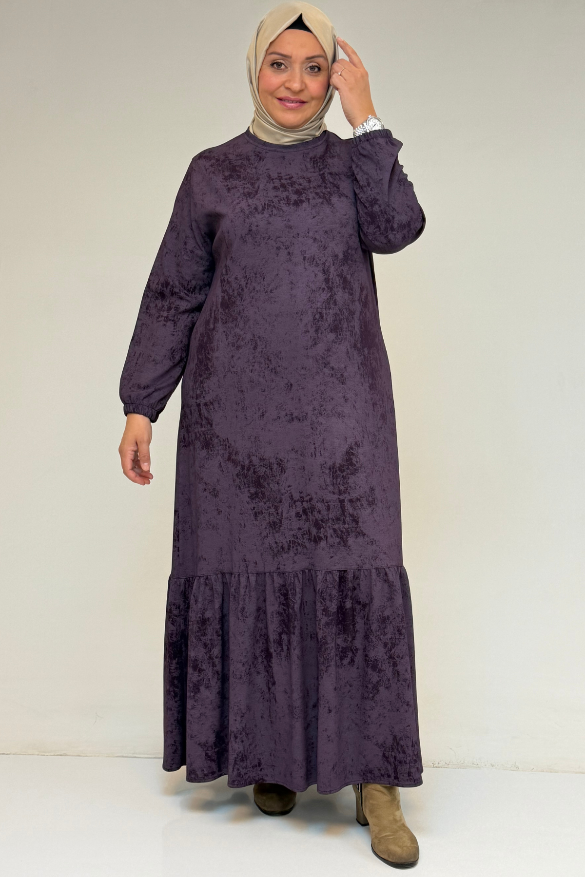 52032 Büyük Beden Eteği Fırfırlı Batik Modal Elbise - Batik Mürdüm
