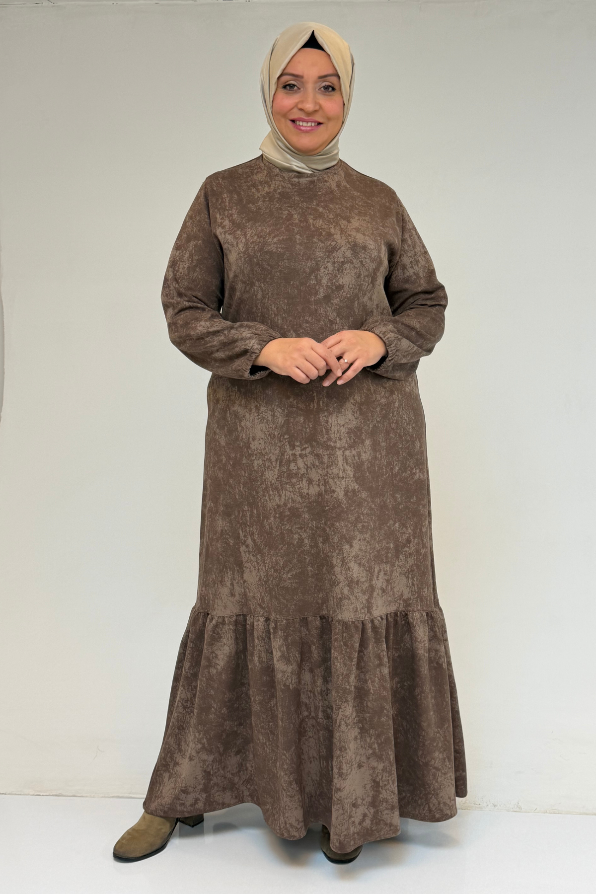 52032 Büyük Beden Eteği Fırfırlı Batik Modal Elbise - Batik Vizon