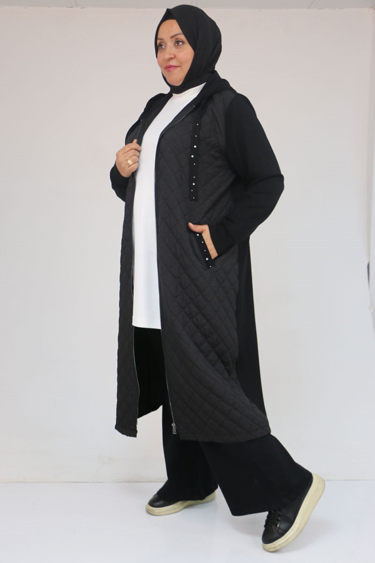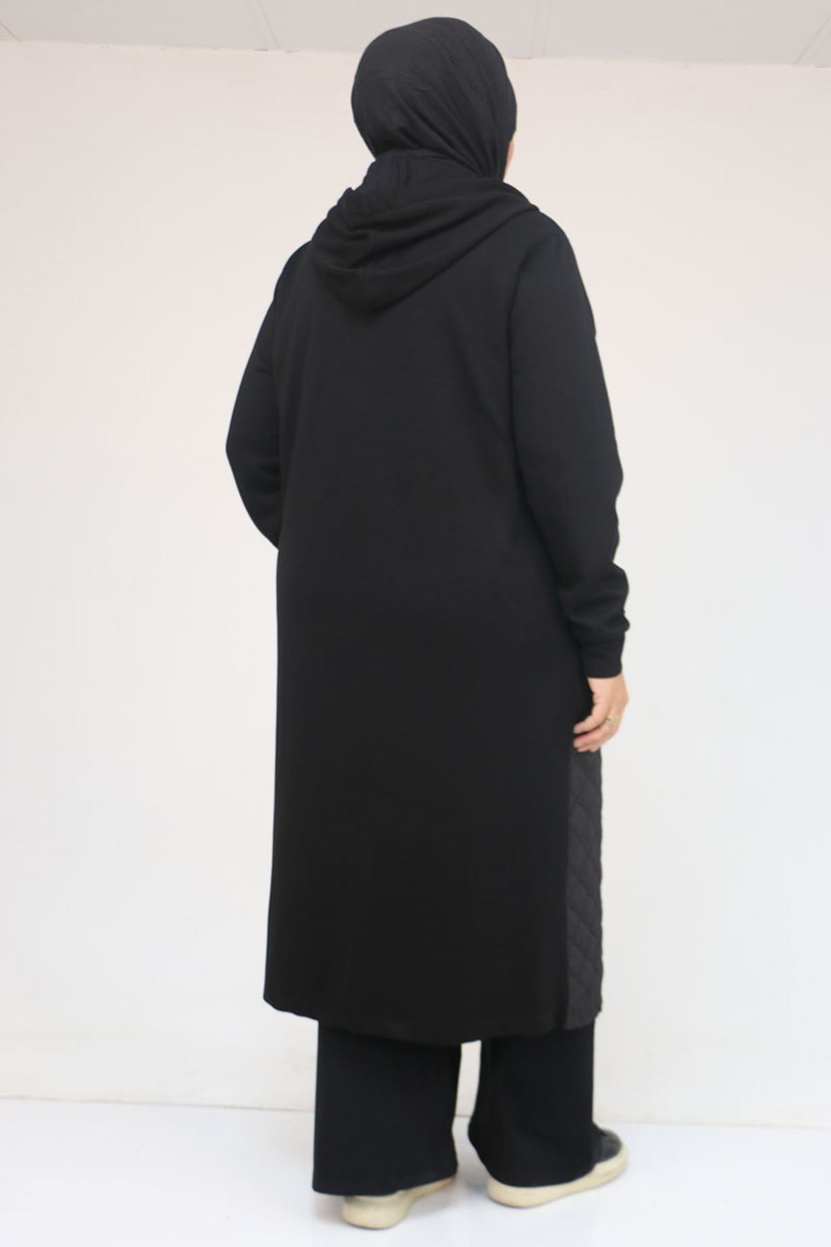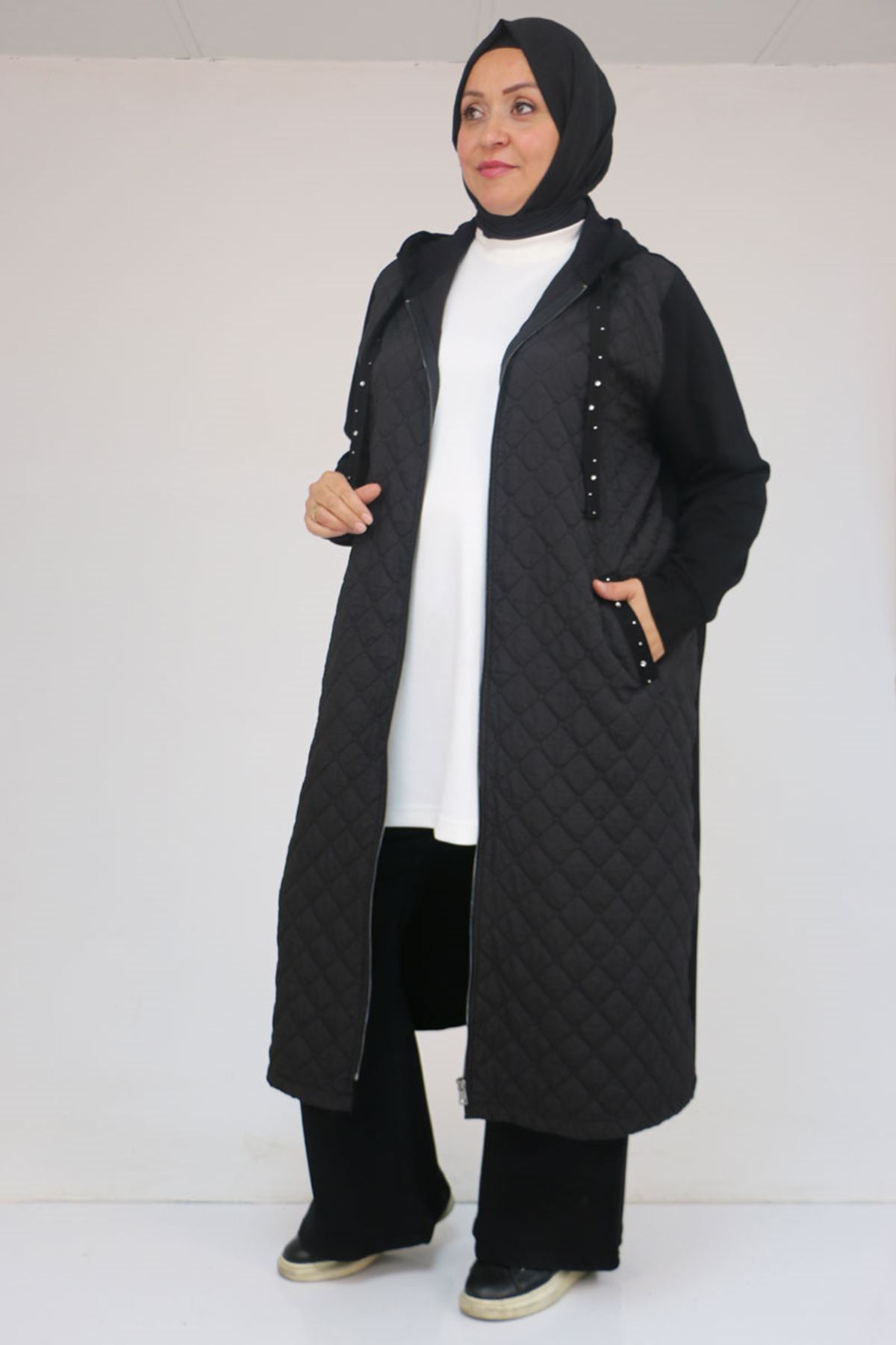 53041 Büyük Beden Modal - Kapitone Kombinli Kap - Siyah