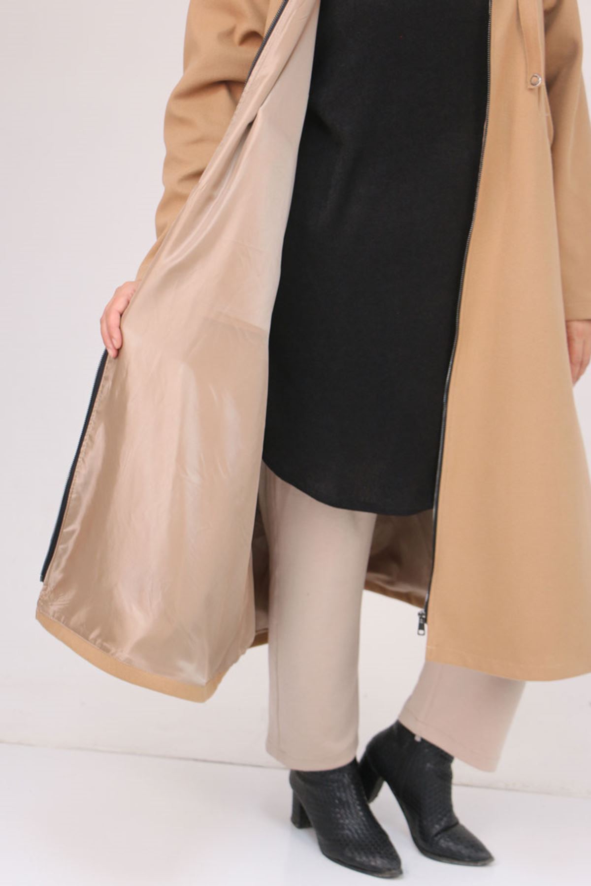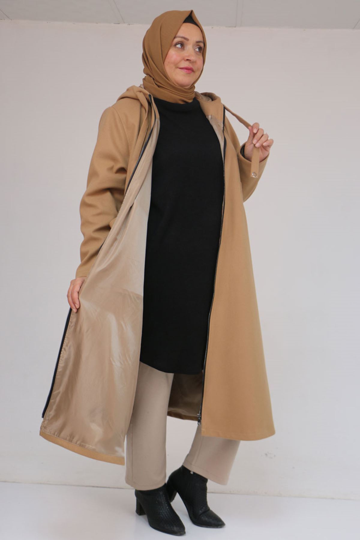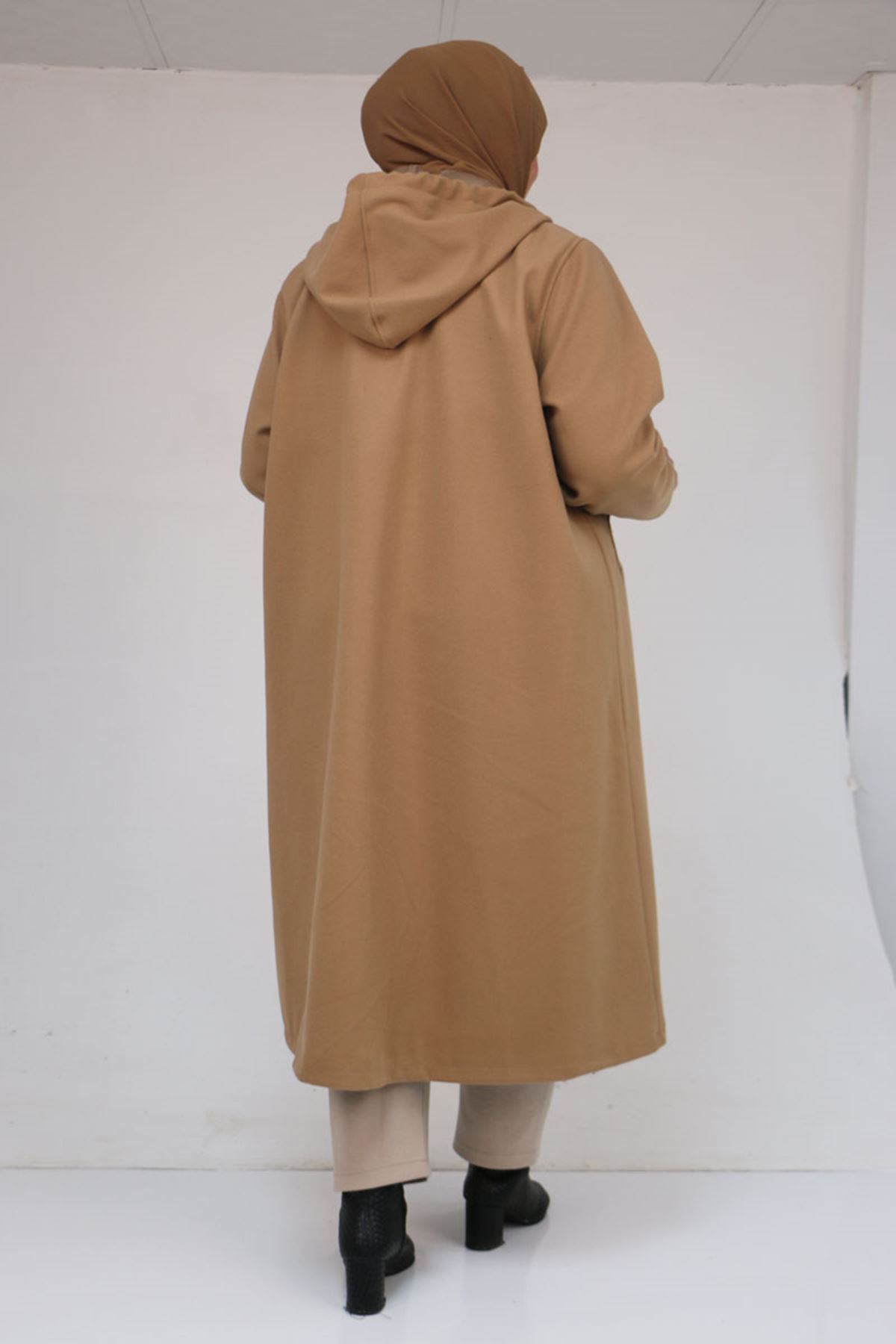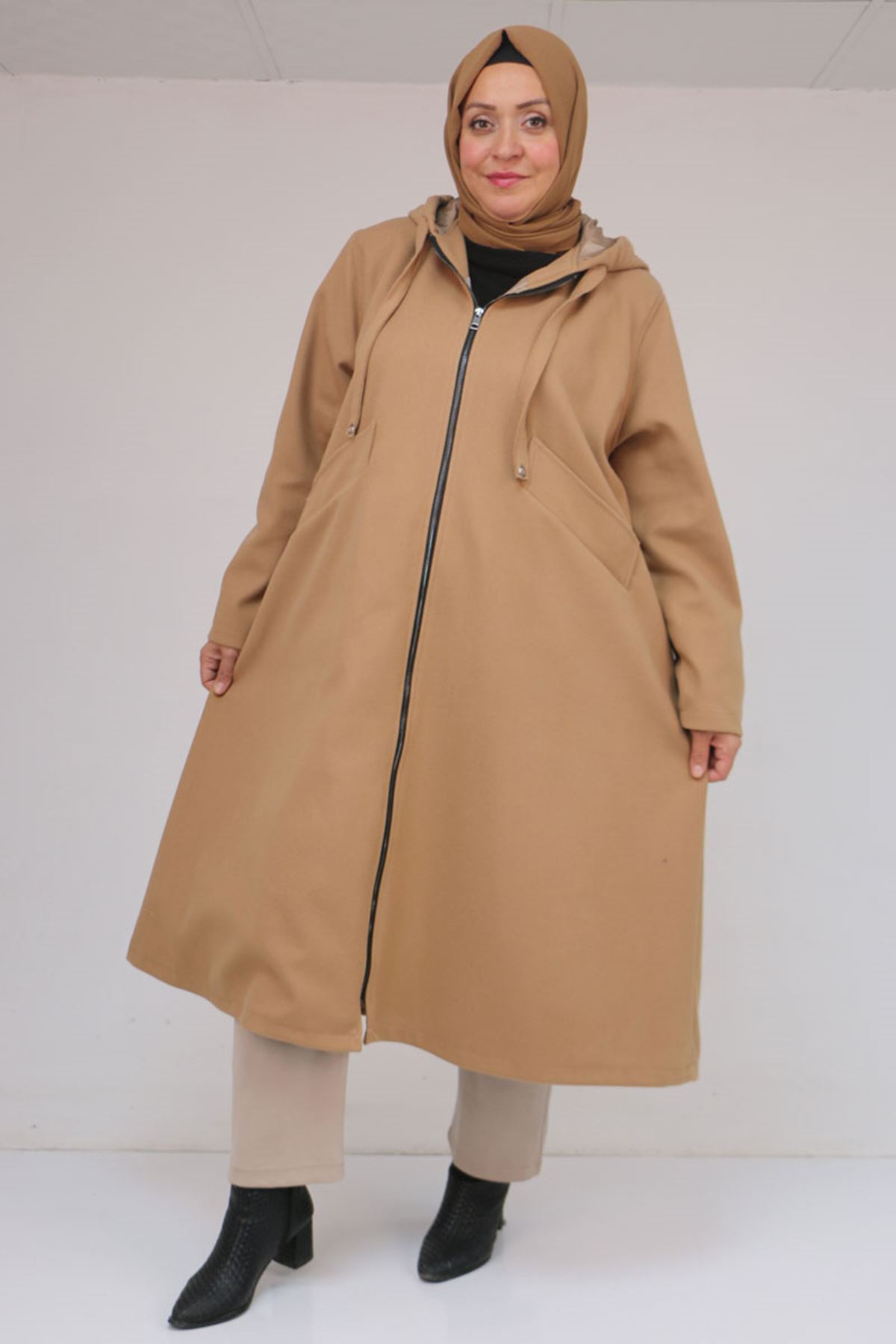 53046 Büyük Beden Kapşonlu İp Kordonlu Kaşe Kaban - Vizon