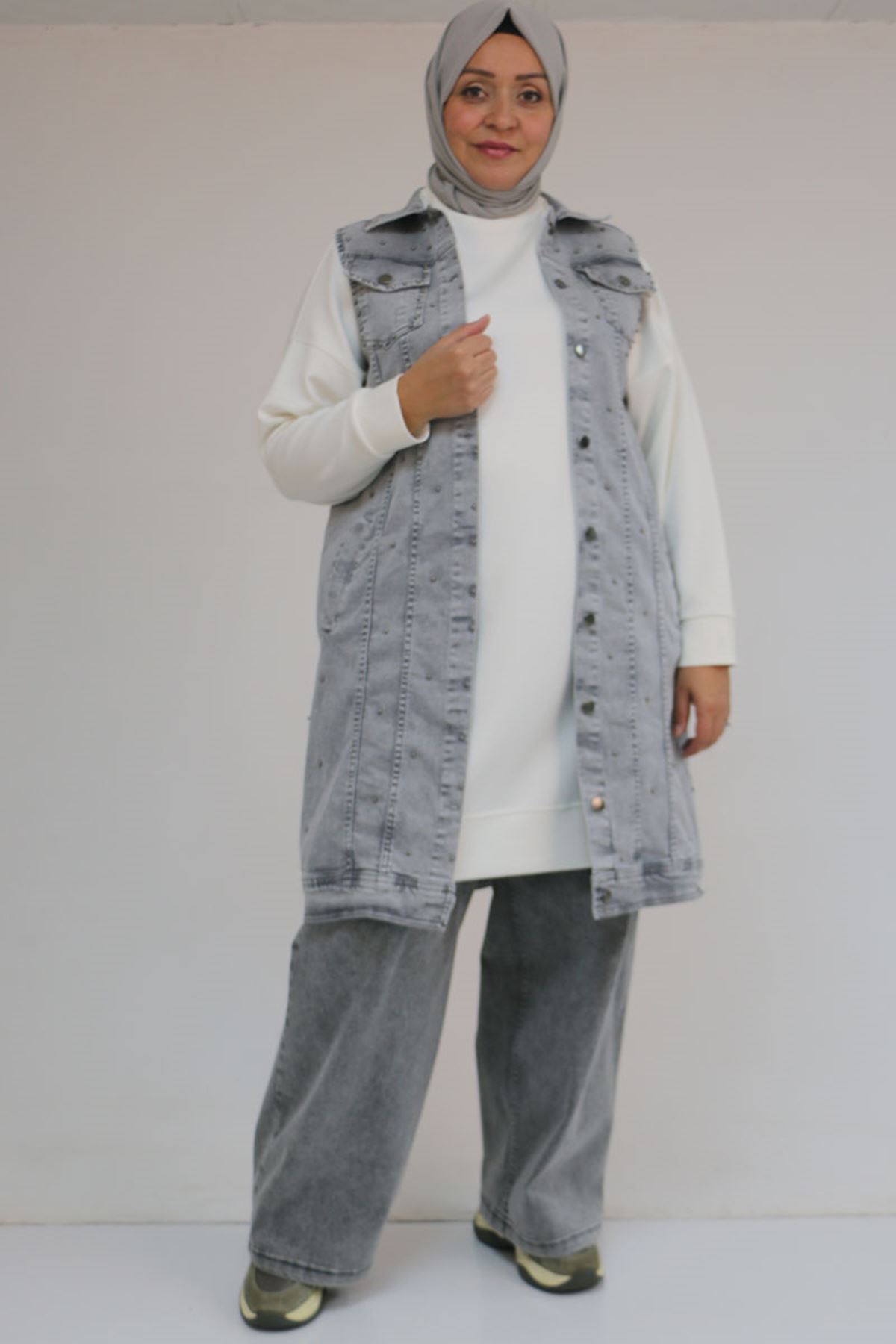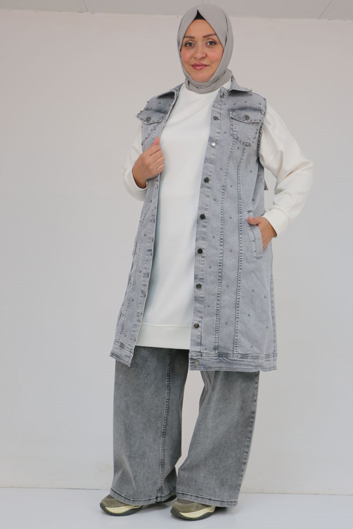 54007 Büyük Beden Çift Cepli İnci Çakmalı Kot Yelek - Kar Yıkama Gri