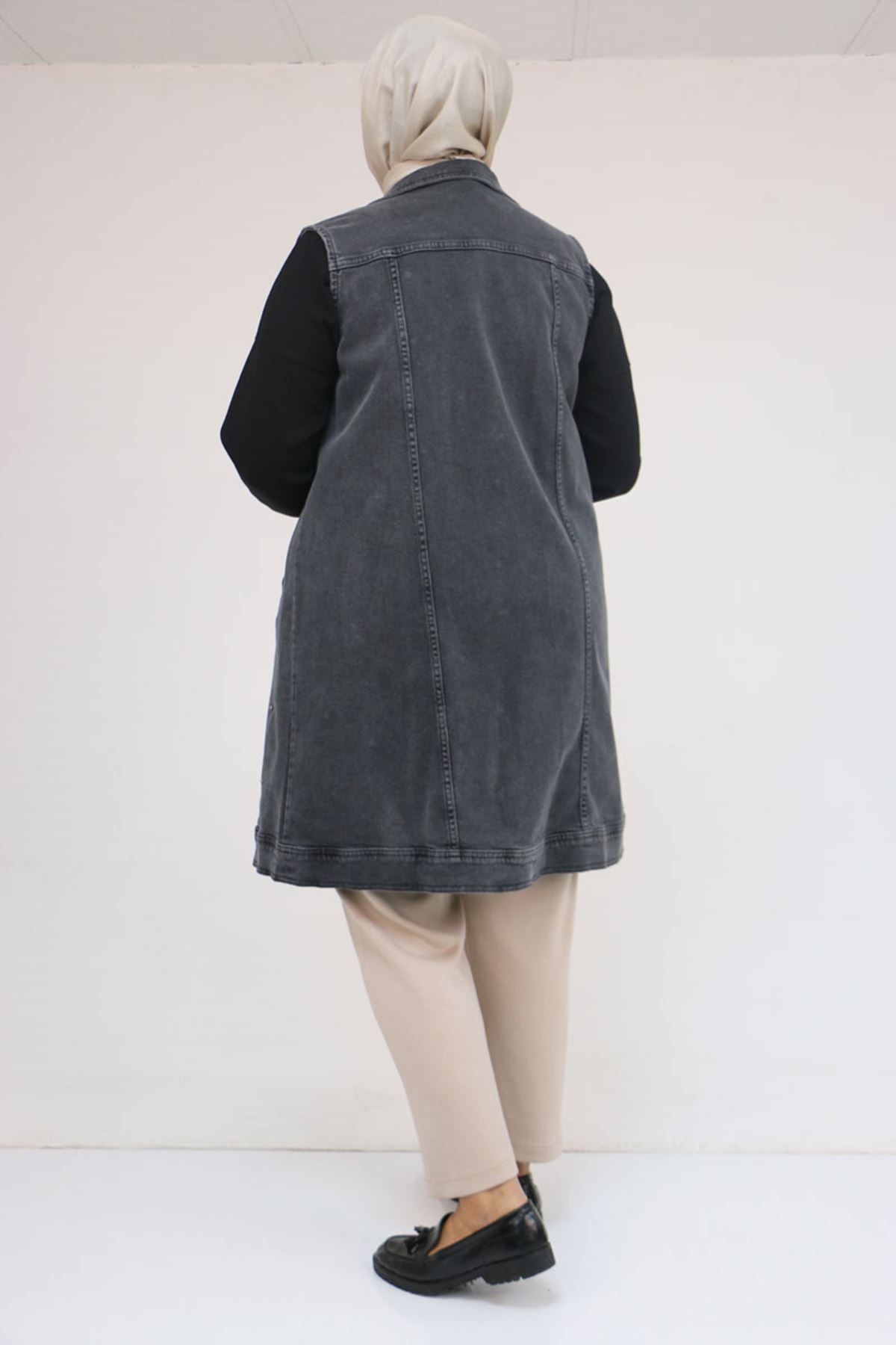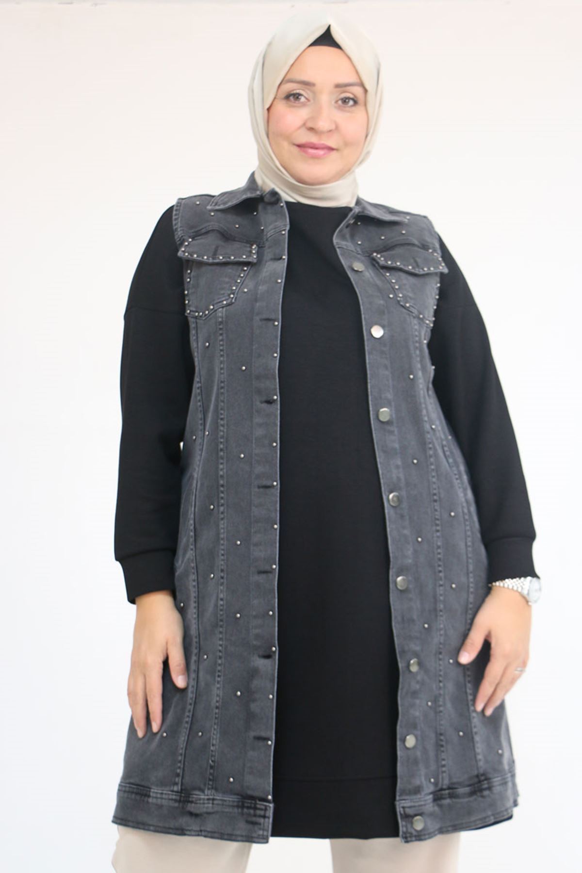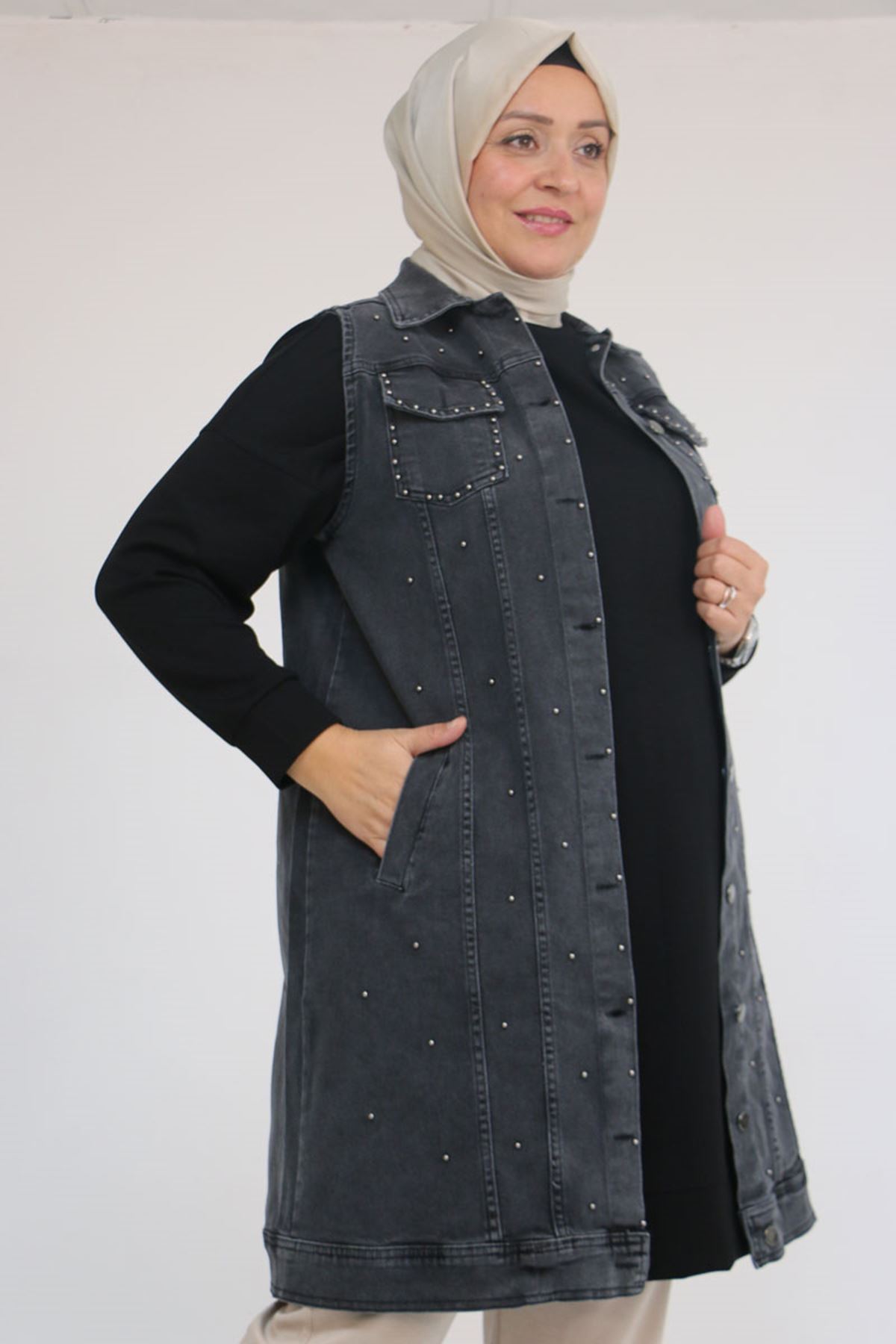 54007 Büyük Beden Çift Cepli İnci Çakmalı Kot Yelek - Kar Ykama Siyah