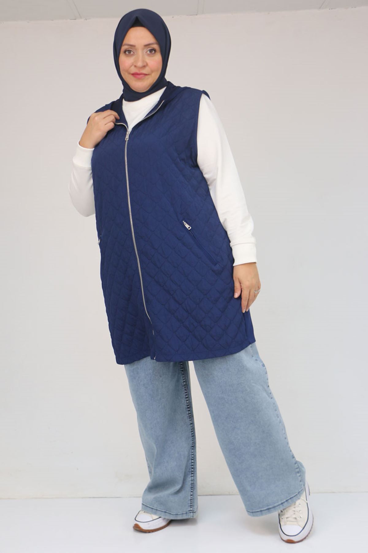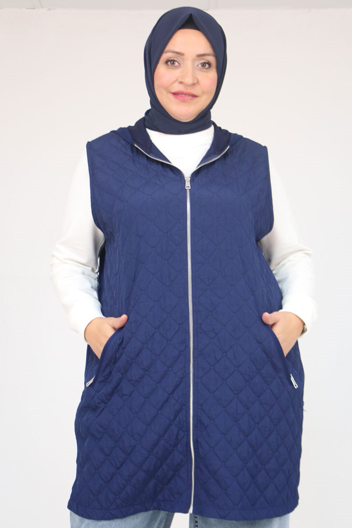 54011 Büyük Beden Cepleri Fermuarlı Modal - Kapitone Yelek - İndigo