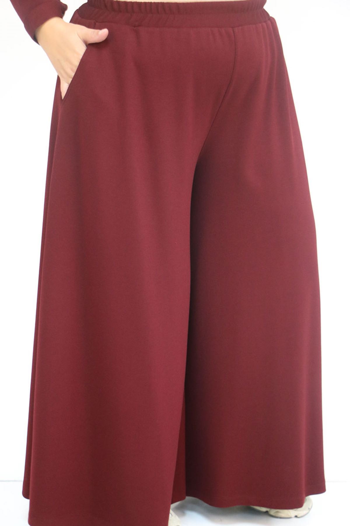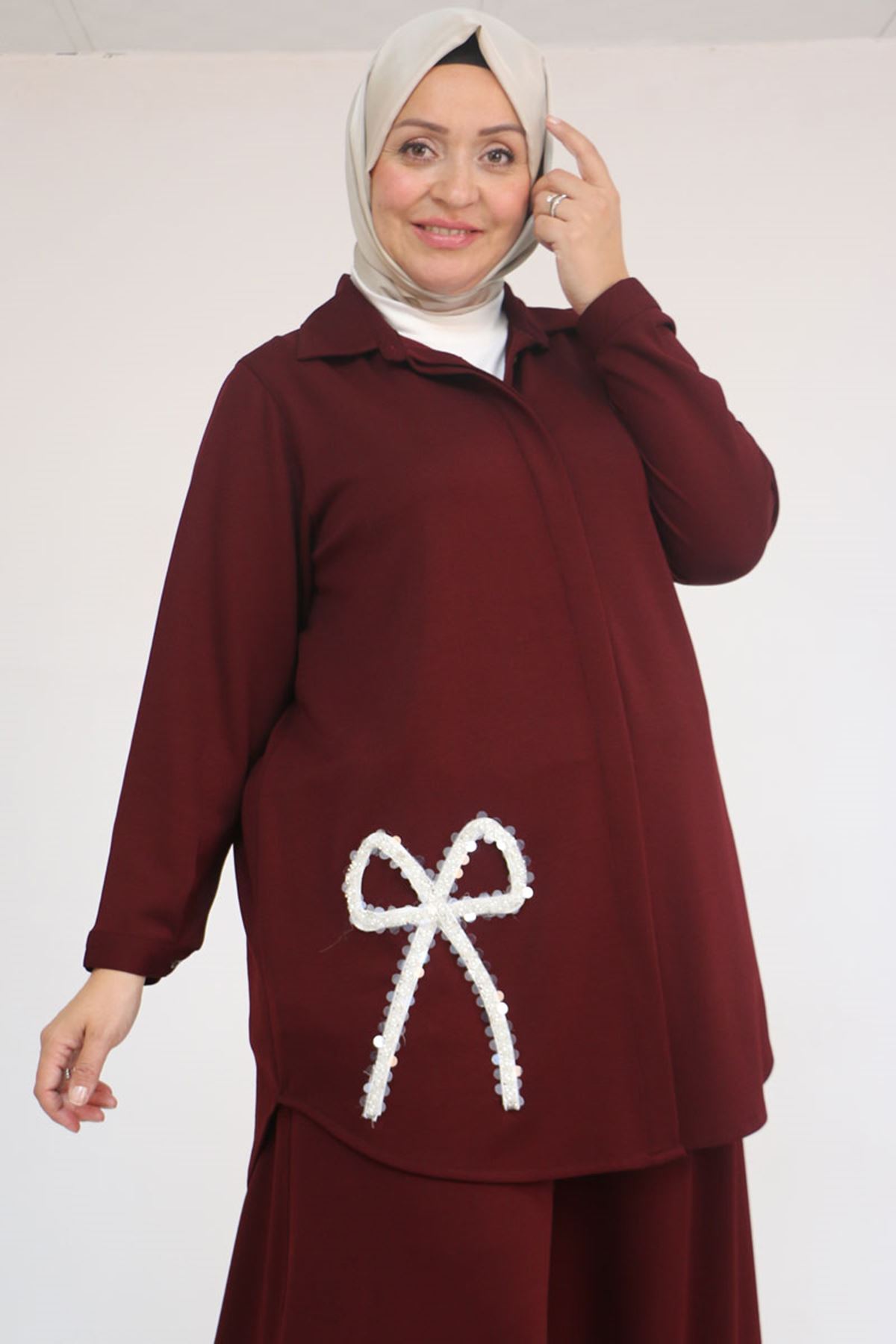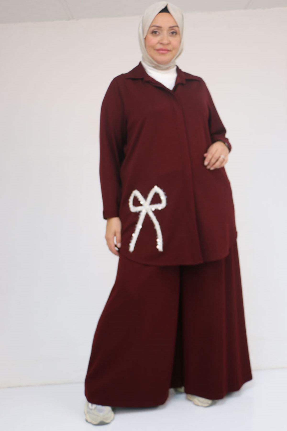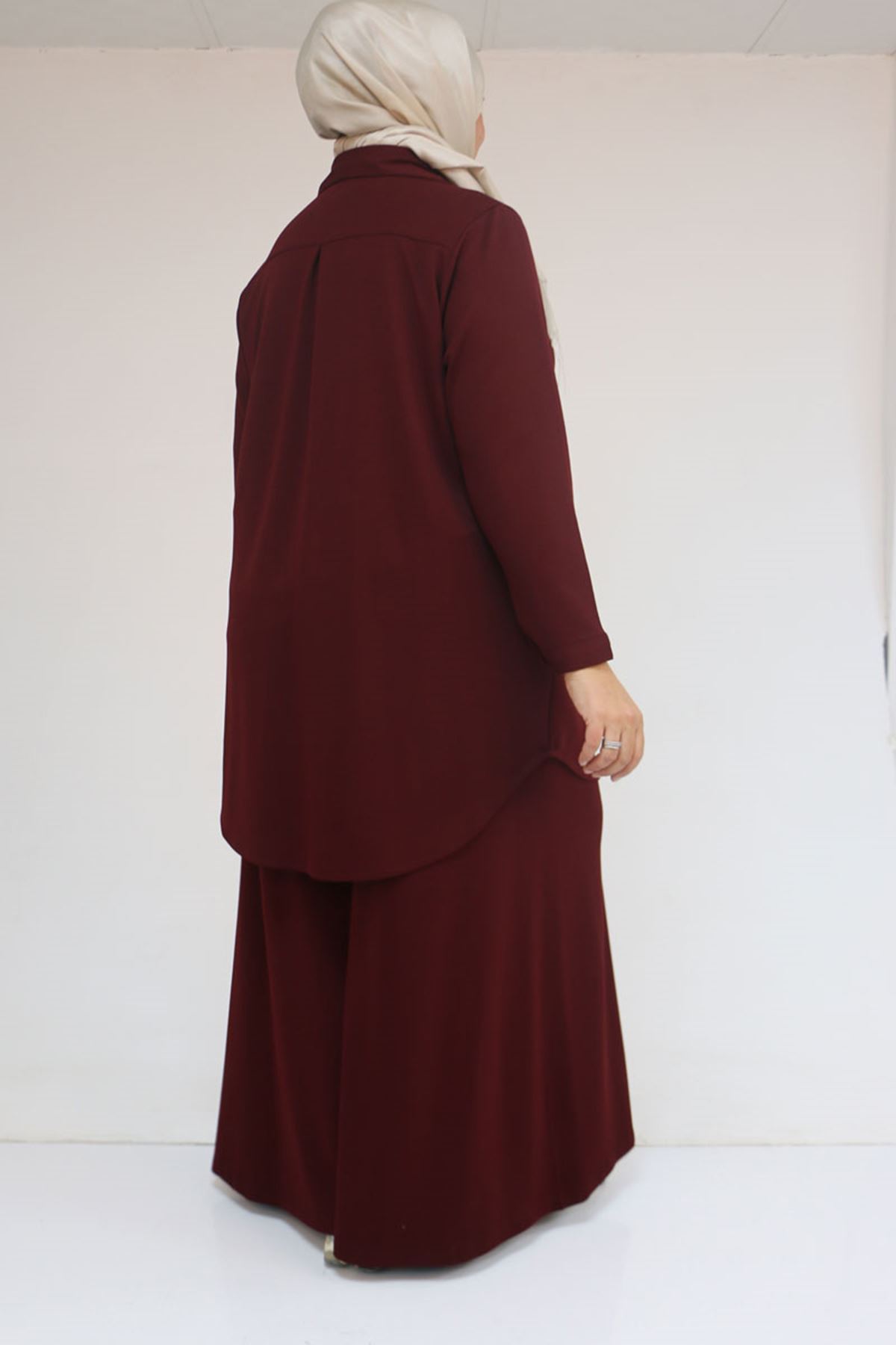 57055 Büyük Beden Gömleği Düğmeli Pantolonlu Modal Takım - Bordo