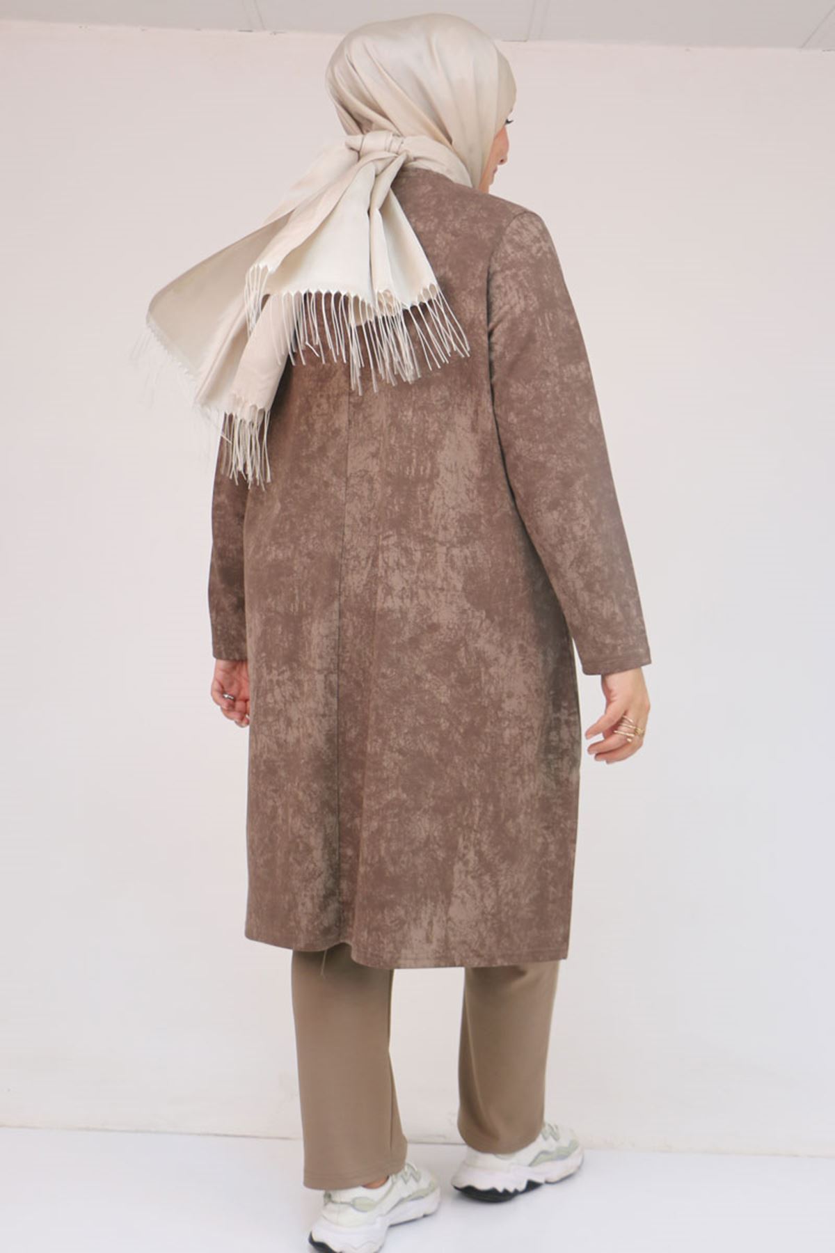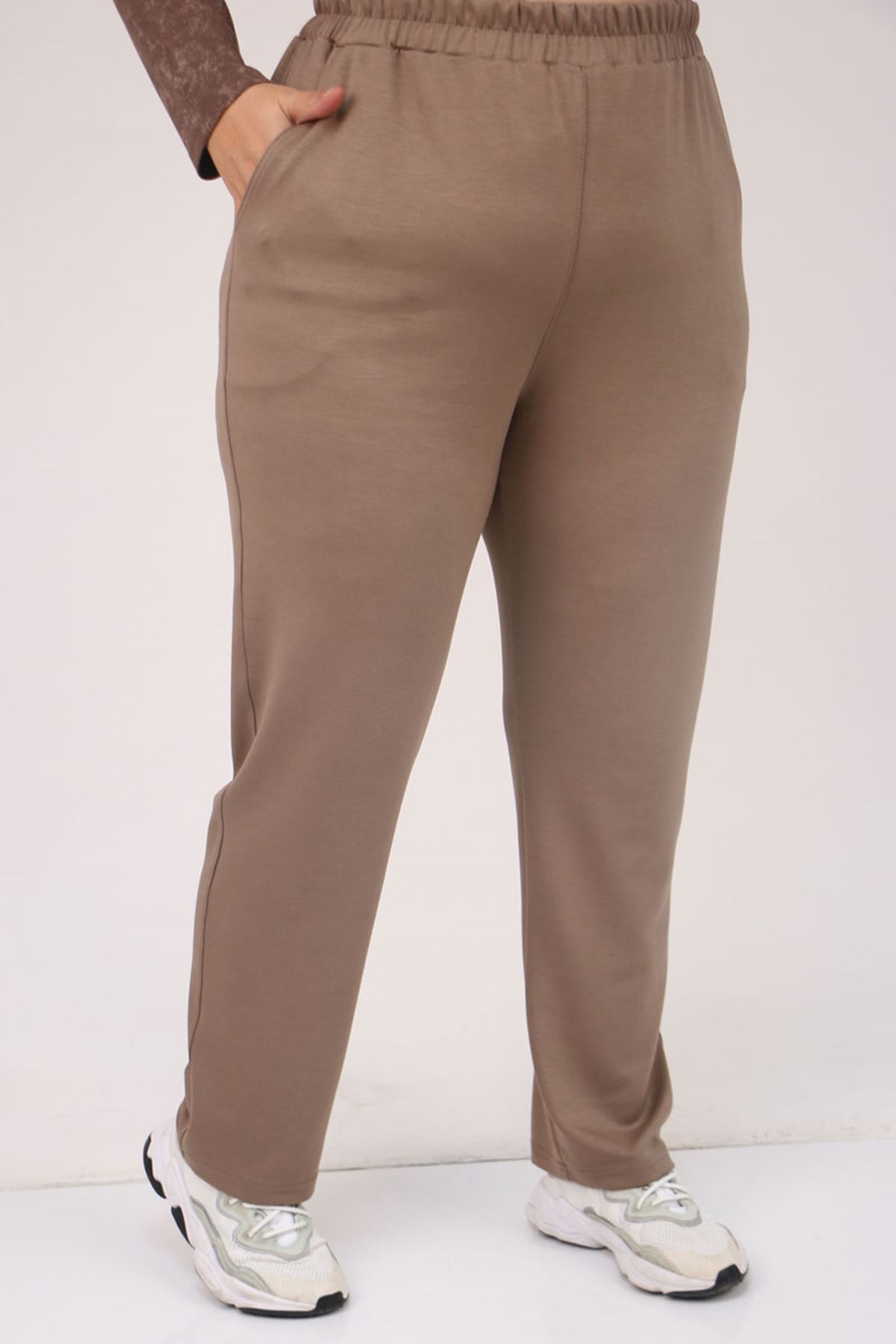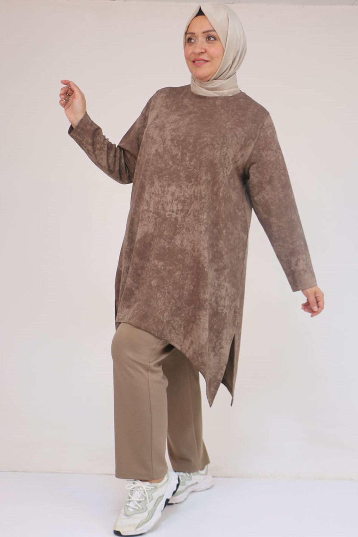 57070 Büyük Beden Önü Simetri Kesim Batik Pantolonlu Takım - Vizon