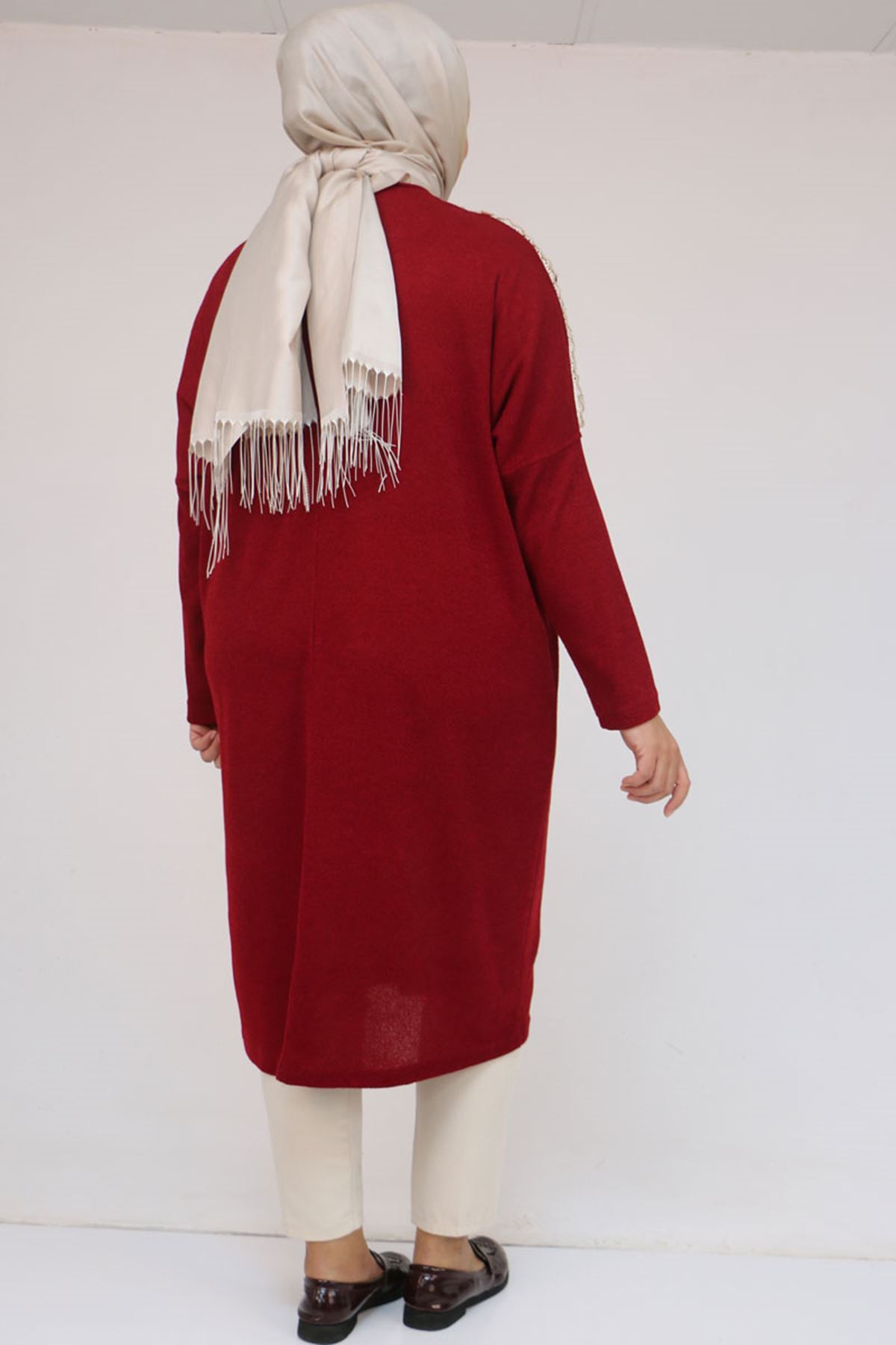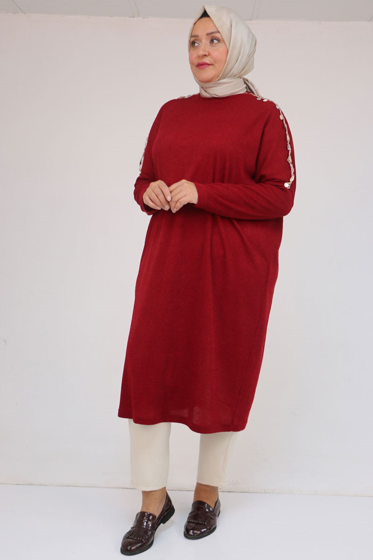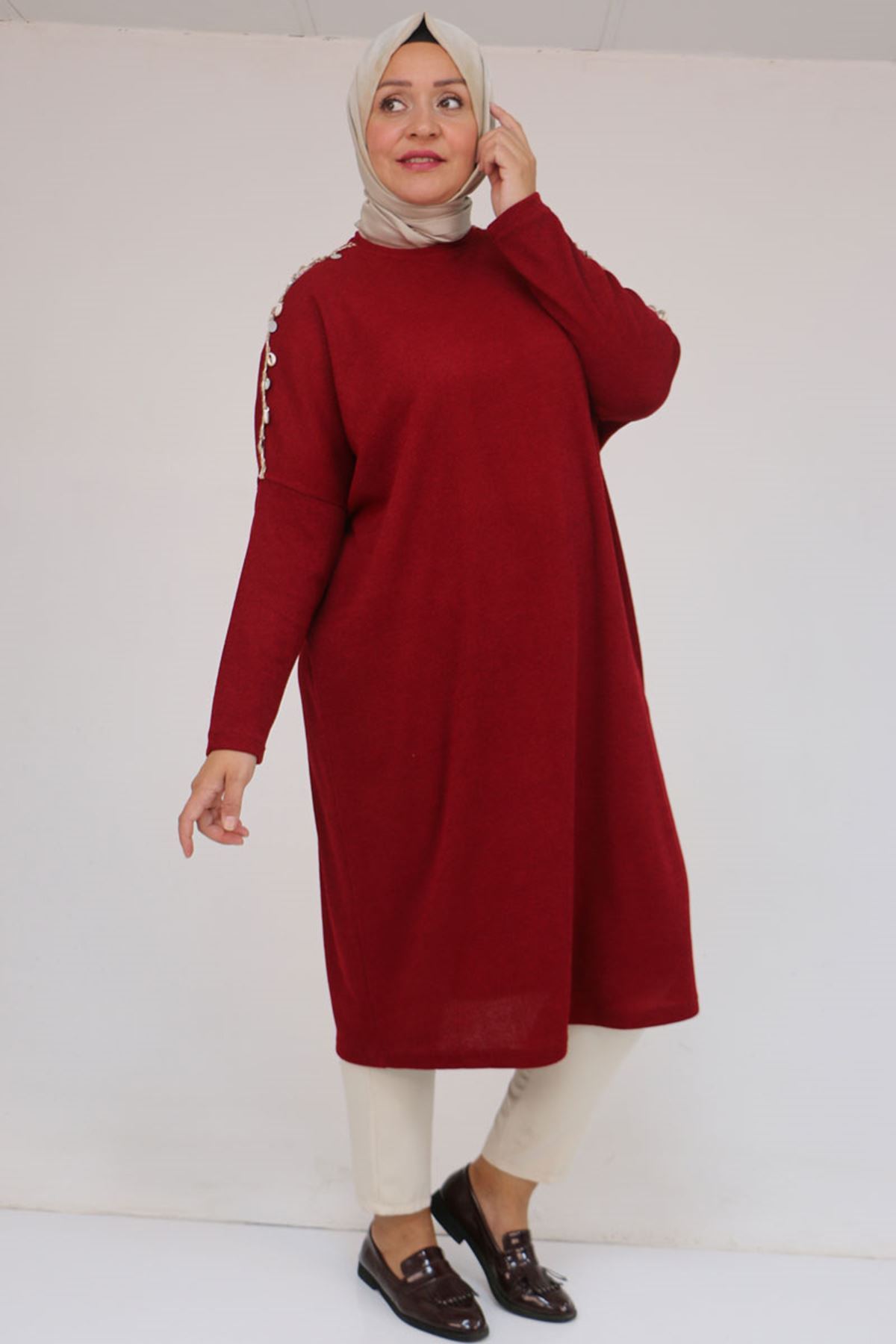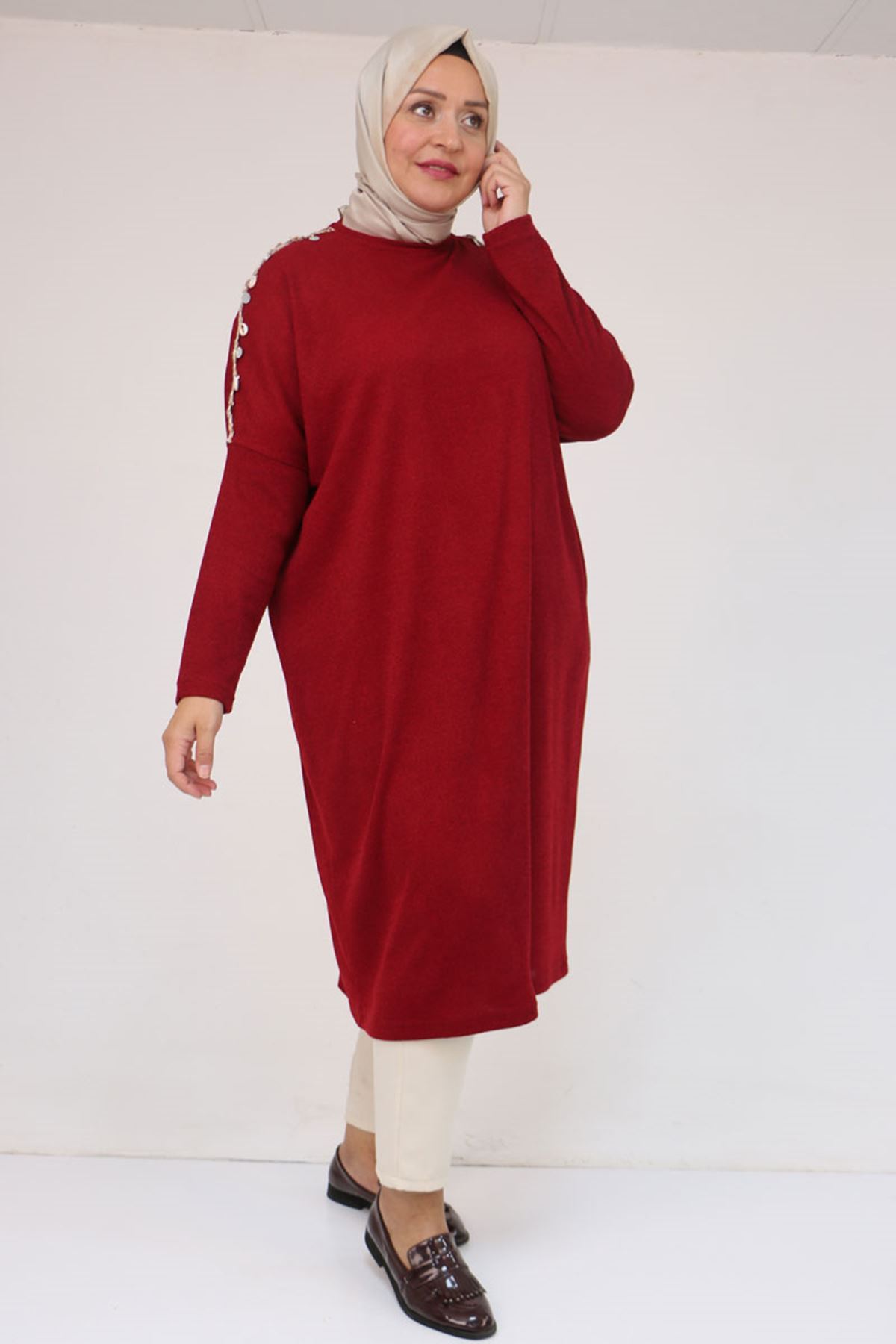 58112 Büyük Beden Omzu Aksesuar Detaylı Düşük Kol Tunik - Bordo