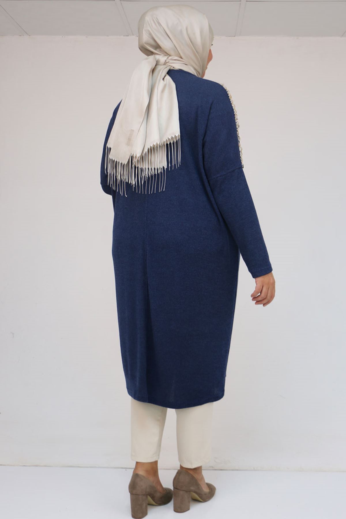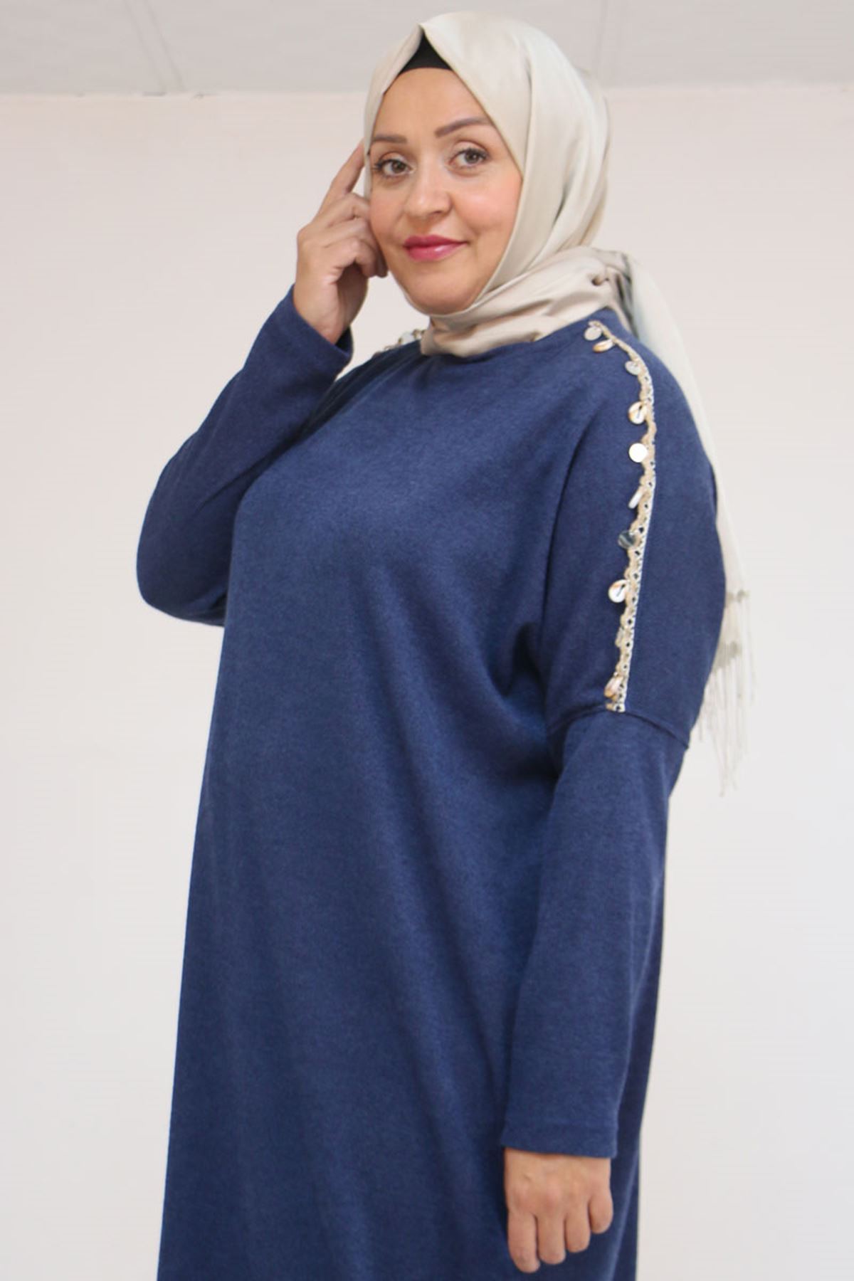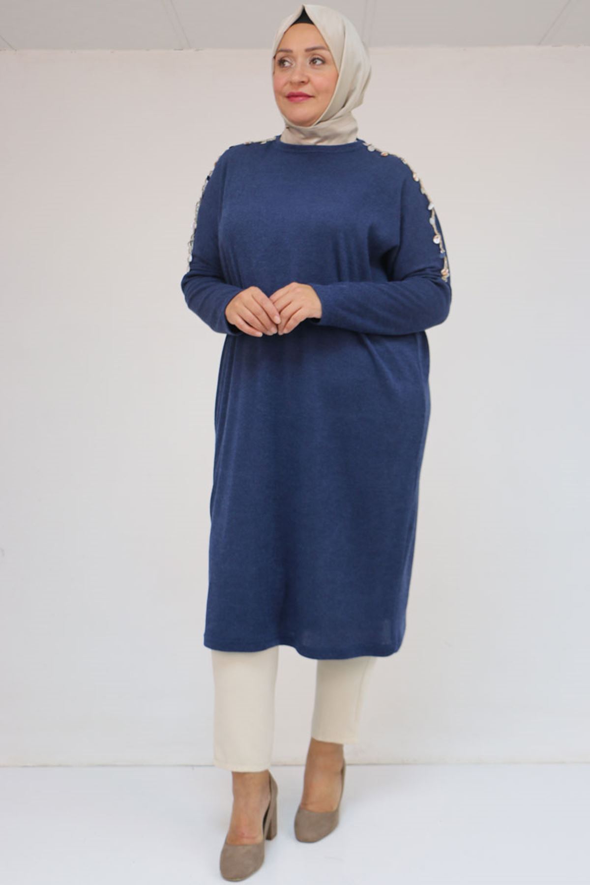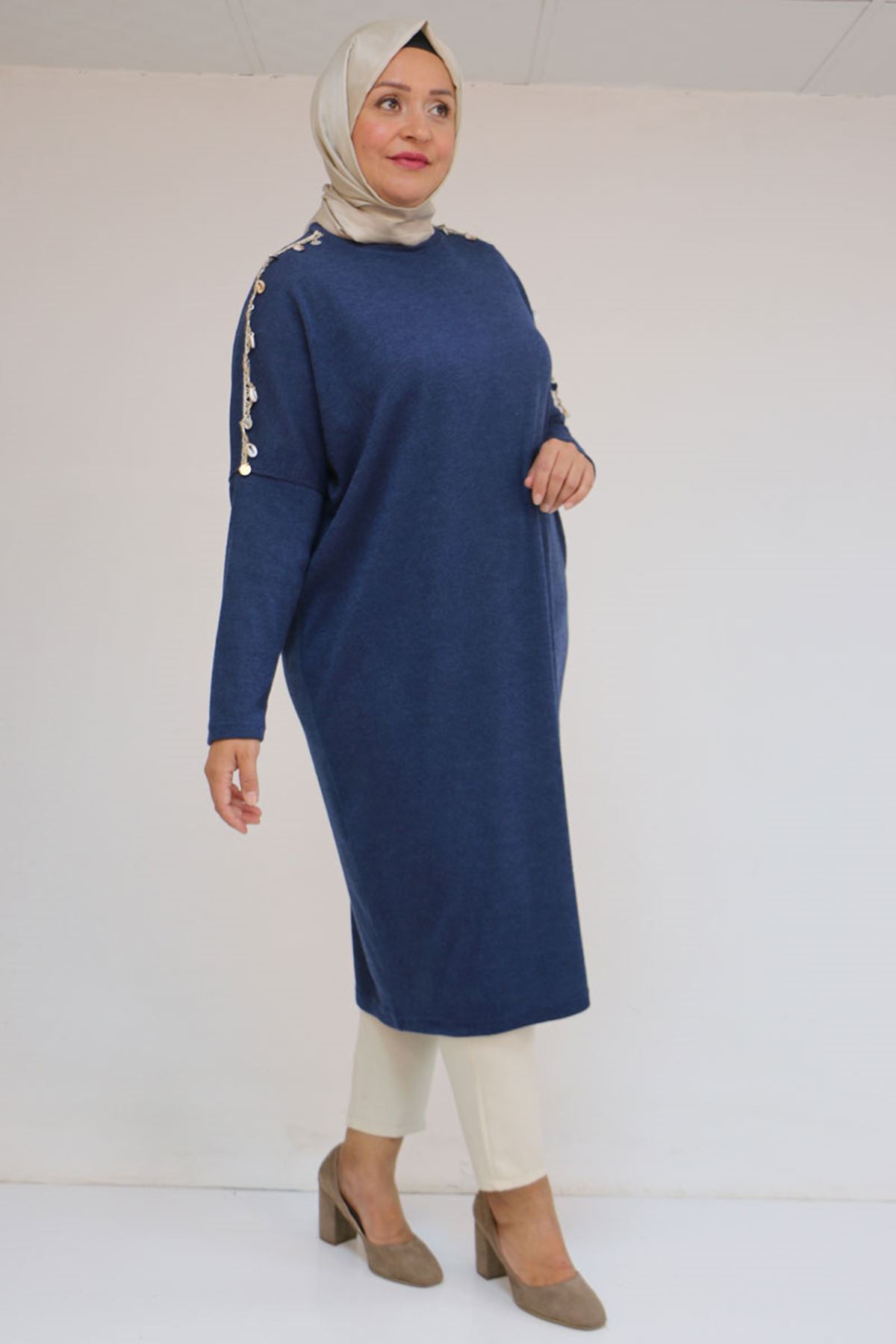 58112 Büyük Beden Omzu Aksesuar Detaylı Düşük Kol Tunik - İndigo