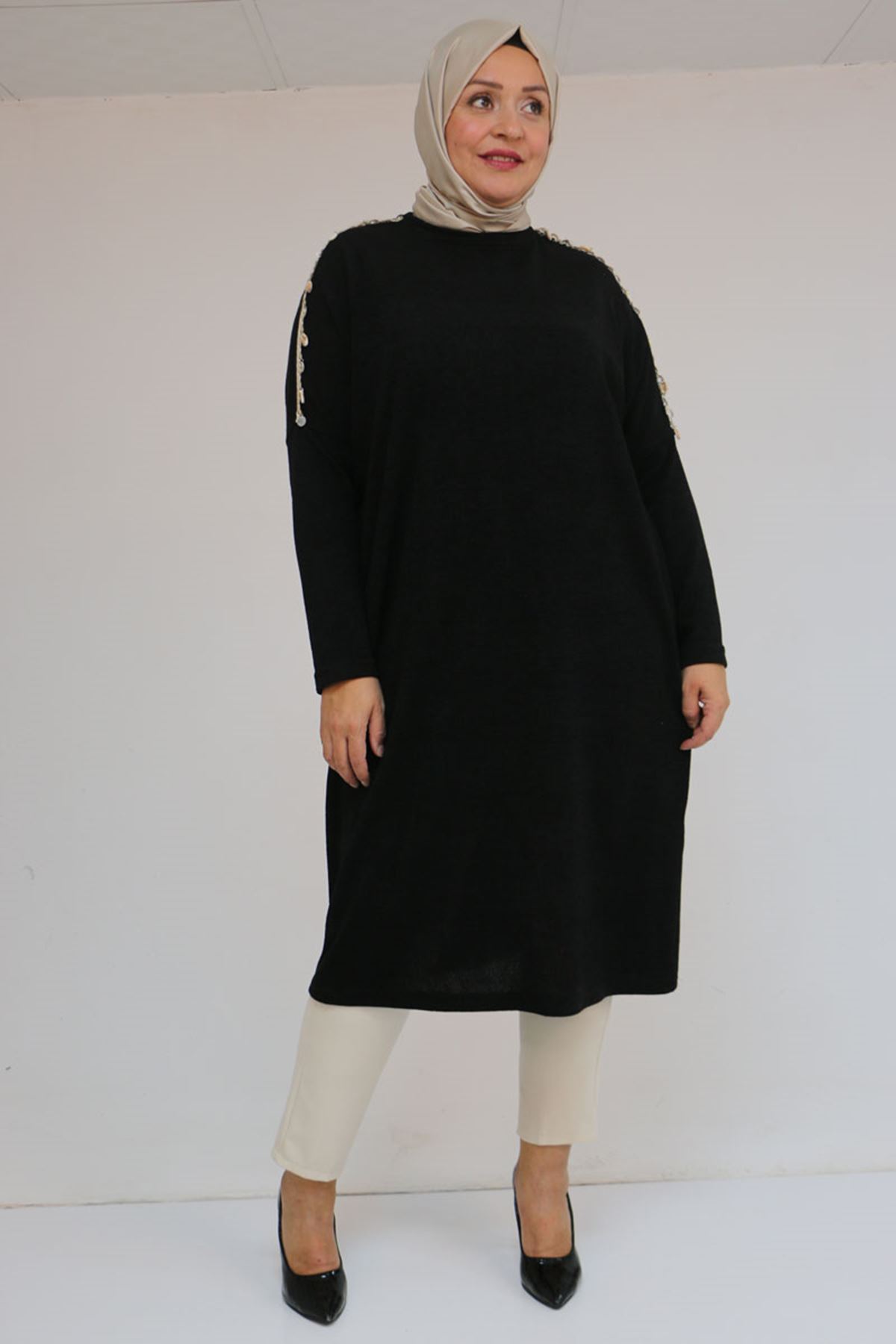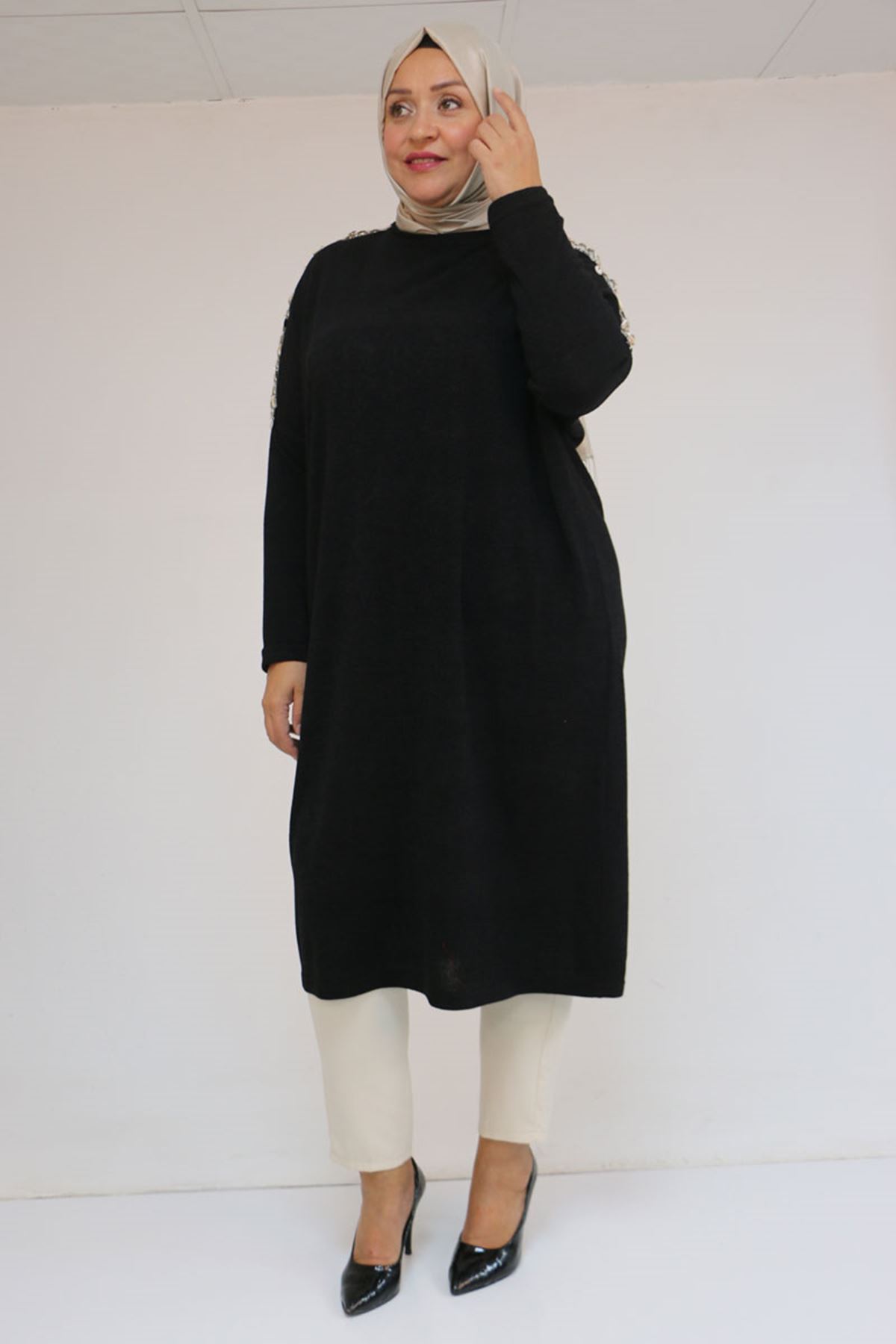 58112 Büyük Beden Omzu Aksesuar Detaylı Düşük Kol Tunik - Siyah
