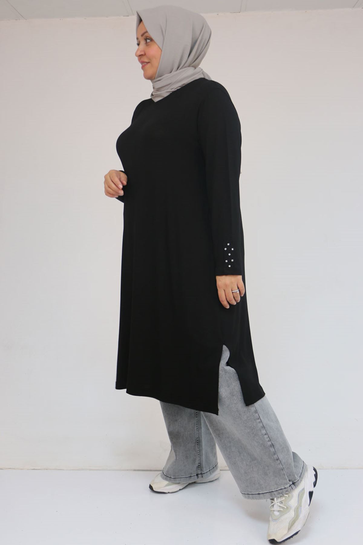58115 Büyük Beden Kolunda Beyoğlu Detaylı Çilek Tunik - Siyah