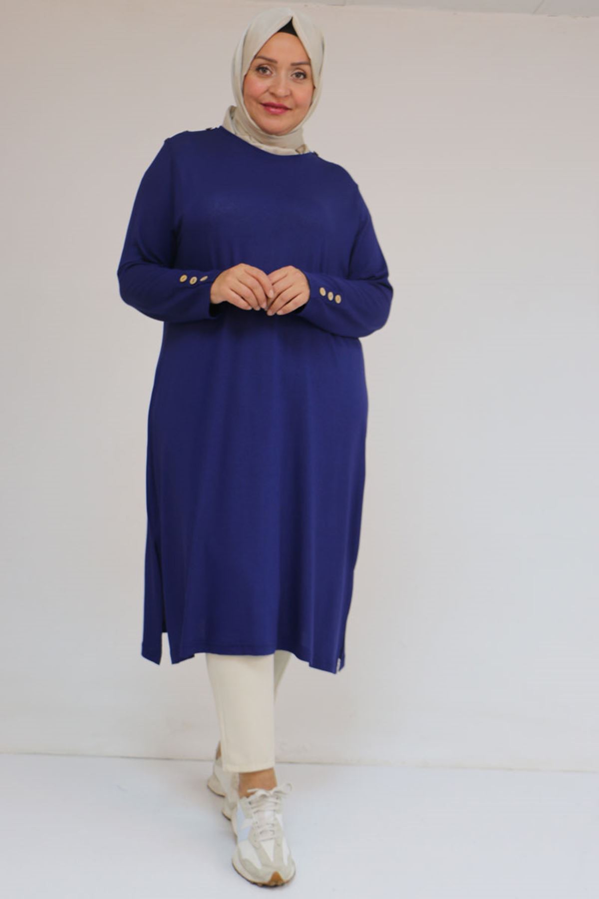 58116 Büyük Beden Kol Ve Omzu Düğme Detaylı Çilek Tunik - İndigo