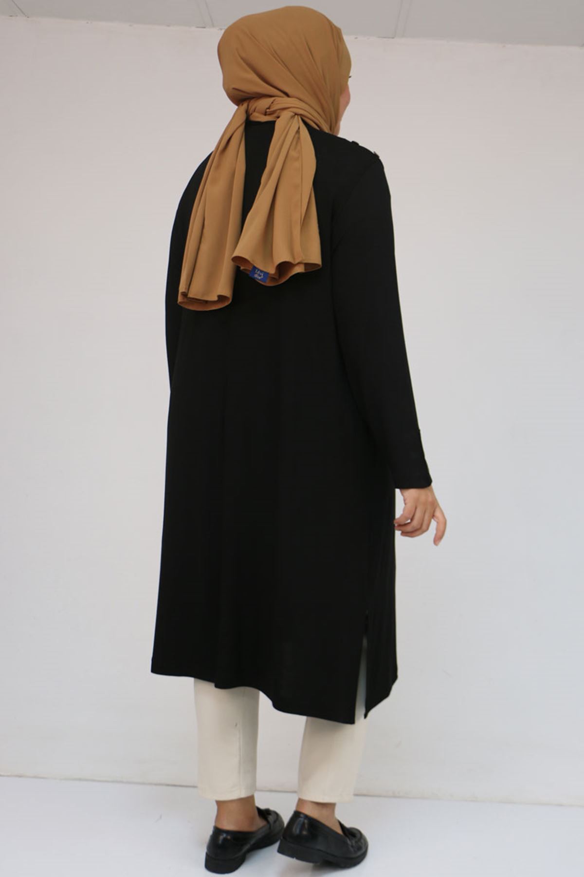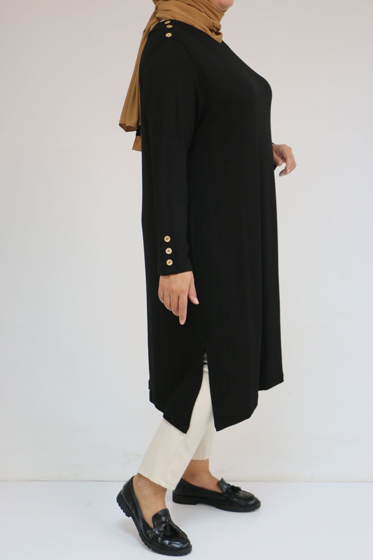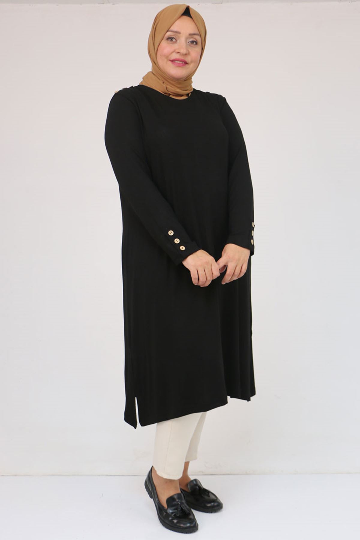 58116 Büyük Beden Kol Ve Omzu Düğme Detaylı Çilek Tunik - Siyah